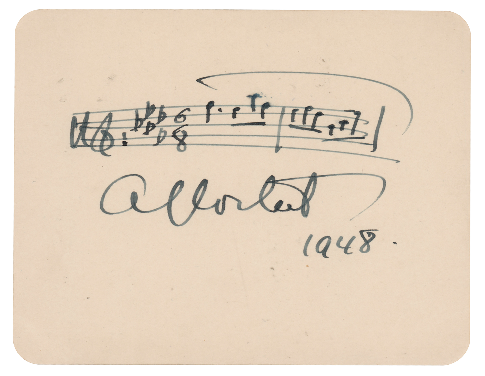 Franco-Swiss pianist and conductor (1877–1962) known for his Romantic period piano works, particularly those of Chopin and Schumann, and considered one of the most renowned 20th-century classical musicians. AMQS on an off-white 4.5 x 3.5 card, neatly signed and dated in fountain pen, "Al. Cortot, 1948.” Cortot pens two bars from a piece in 6/8 time. In very fine condition.