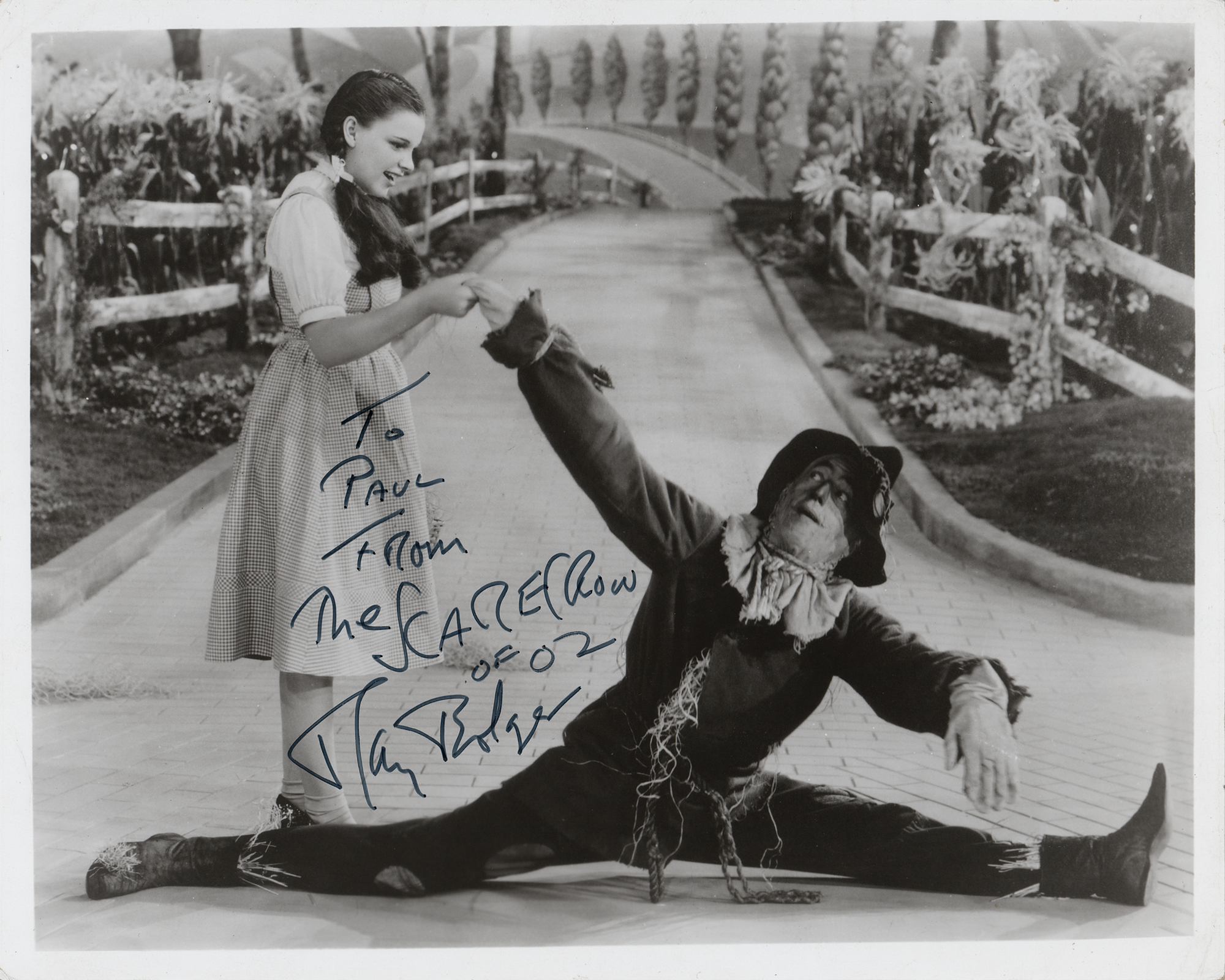 Great glossy 10 x 8 photo of a scene with Dorothy and the Scarecrow on Oz's Yellow Brick Road, signed and inscribed in black felt tip, "To Paul, From the Scarecrow of Oz, Ray Bolger.” In fine condition.