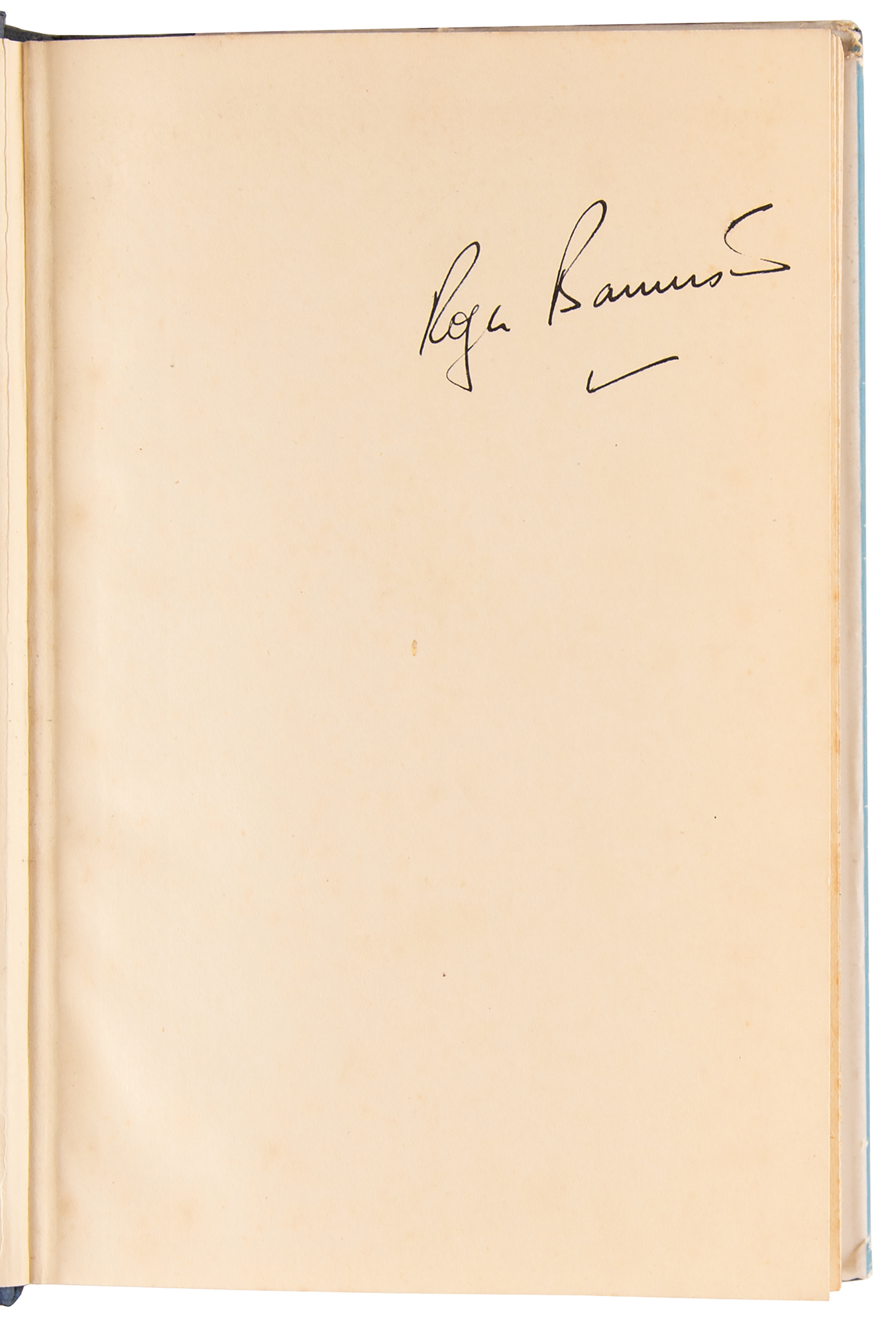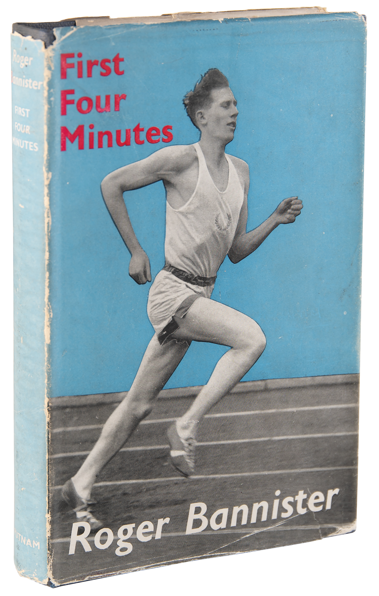 Signed book: First Four Minutes. First edition, second impression. London: Putnam, 1955. Hardcover with dust jacket, 5.25 x 8, 224 pages. Signed on the first free end page in fountain pen, "Roger Bannister." In fine condition, with light wear and some minor edge loss to the dust wrapper. A desirable example boasting a contemporary, vintage autograph of the legendary four-minute miler.