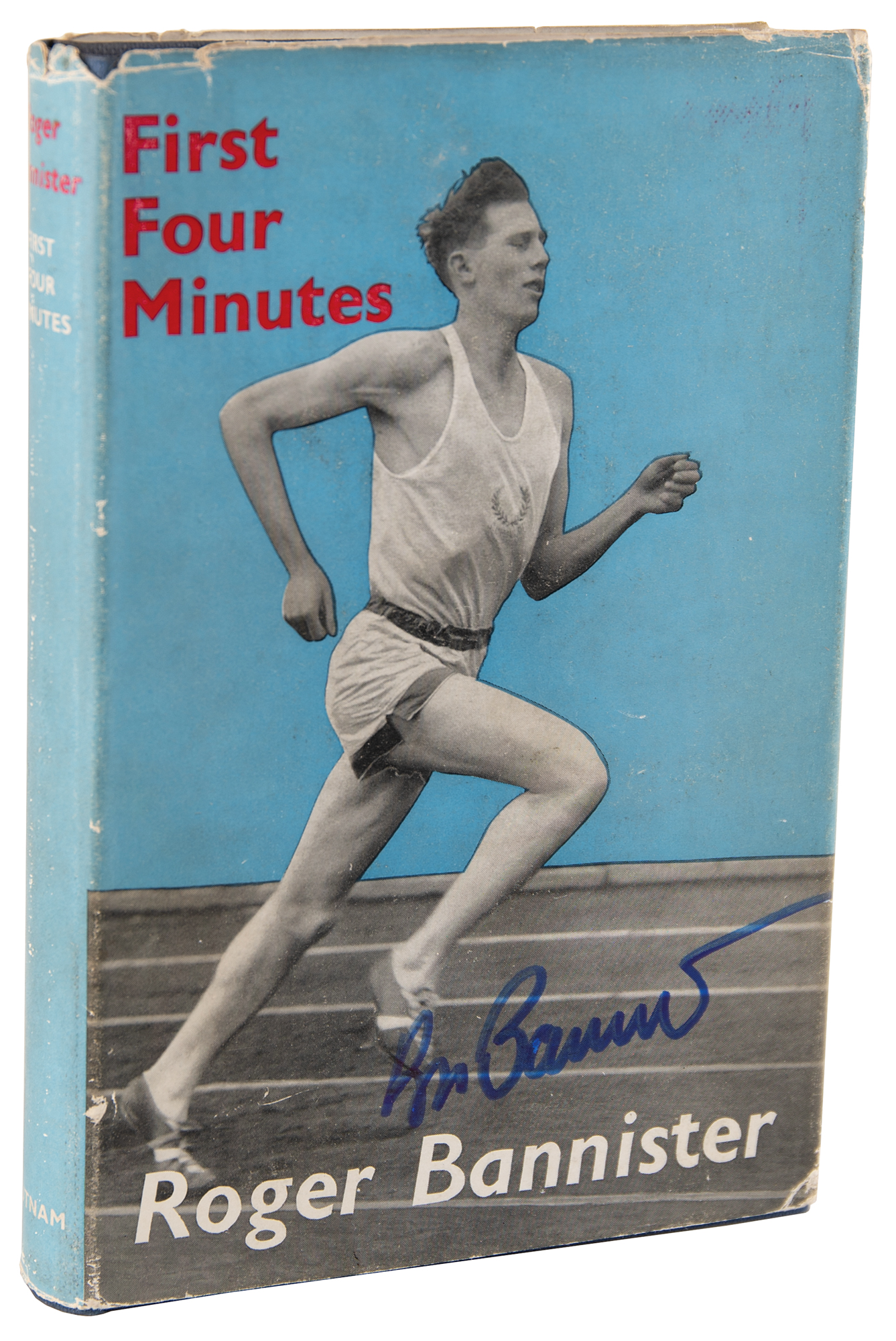 Signed book: First Four Minutes. First edition, second impression. London: Putnam, 1955. Hardcover with dust jacket, 5.25 x 8, 224 pages. Signed on the front of the jacket in blue felt tip by Roger Bannister. In fine condition, with light wear and some minor edge loss to the price-clipped dust wrapper.