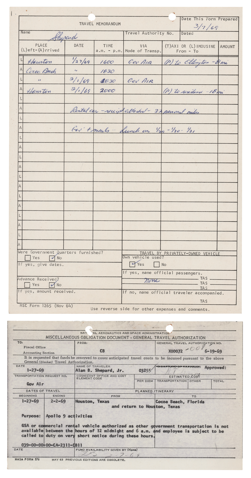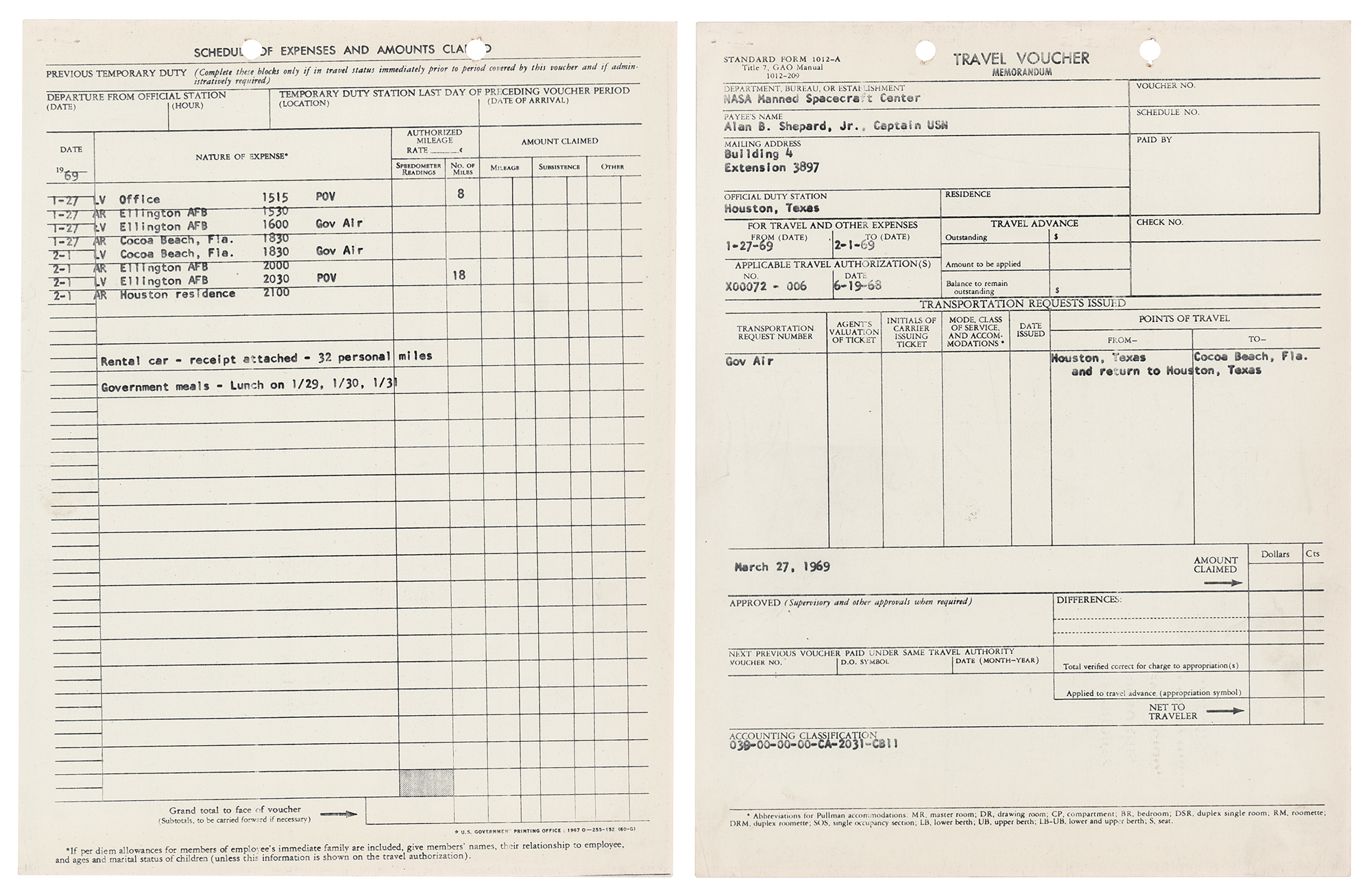 Alan Shepard’s Apollo-era ‘Travel Memorandum’ form from the Manned Spacecraft Center in Houston, Texas, one page, 8 x 10.5, dated March 7, 1969, filled out in ballpoint by Shepard, who signs his surname in the upper ‘Name’ field. Shepard annotates two separate trips: a flight from Houston to Cocoa Beach, Florida, on January 27, 1969, and a return from Cocoa Beach to Houston on February 1, 1969, both taken via “Gov Air.” In the field below, Shepard writes: “Rental car – receipt attached – 32 personal miles, Gov’t meals - Lunch on 1/29 - 1/30 - 1/31.” He then ticks a few boxes in the lower section. Included is the referenced NASA receipt for “General Travel Authorization,” issued to “Alan B. Shepard, Jr.,” on January 27, 1969, with the purpose listed as “Apollo 9 activities,” as well as copies of Shepard’s “Travel Voucher” and “Schedule of Expenses and Amounts Claimed” for the above two trips. In fine condition.