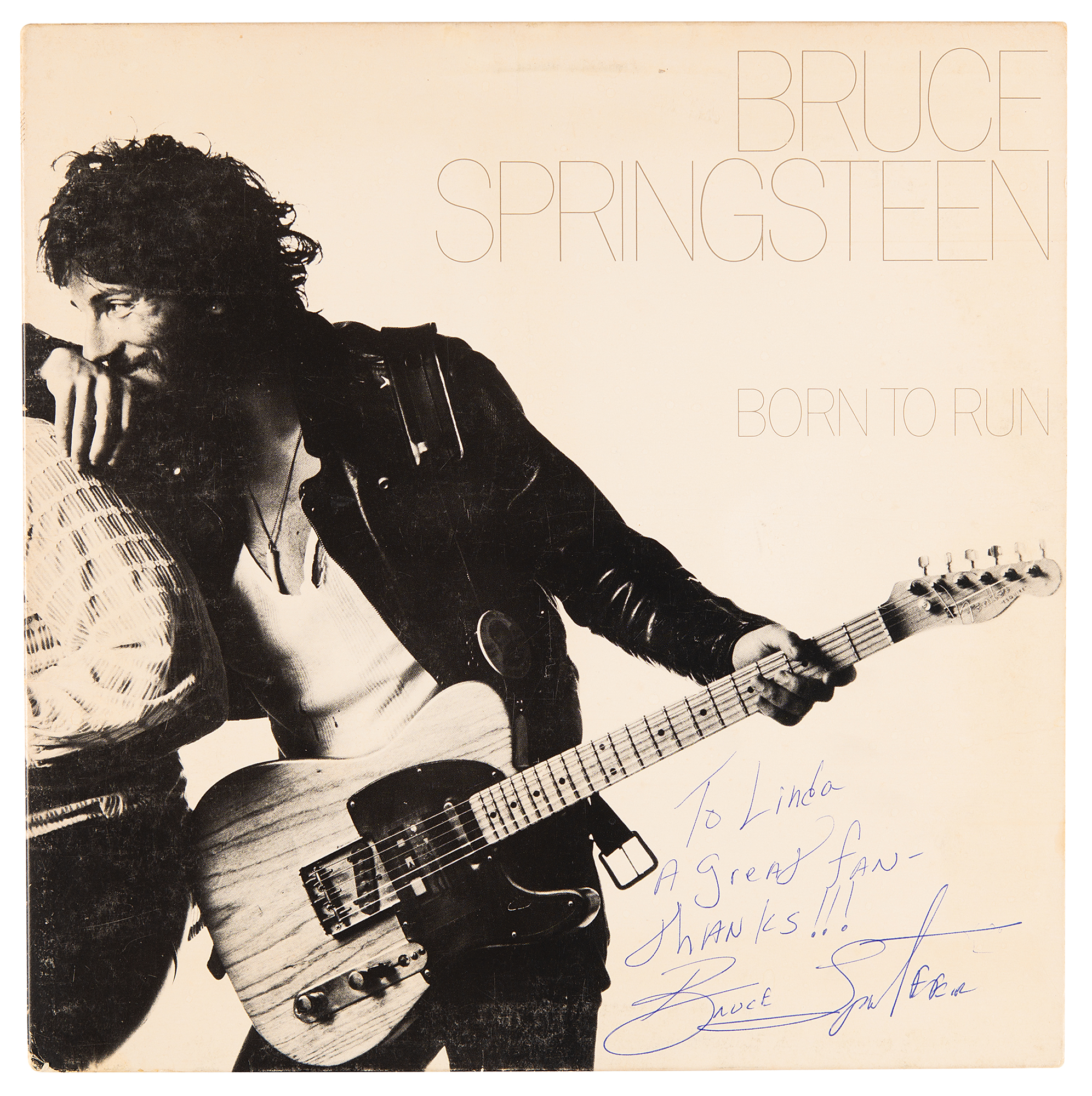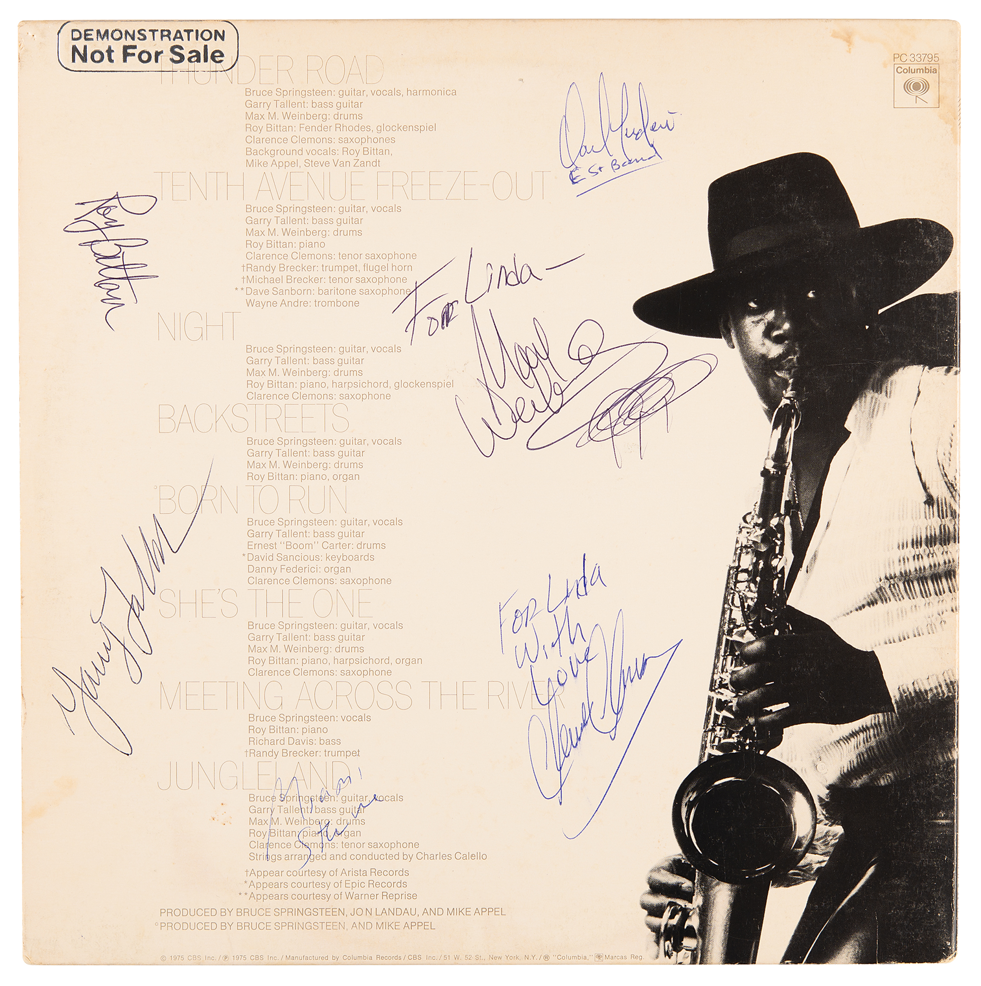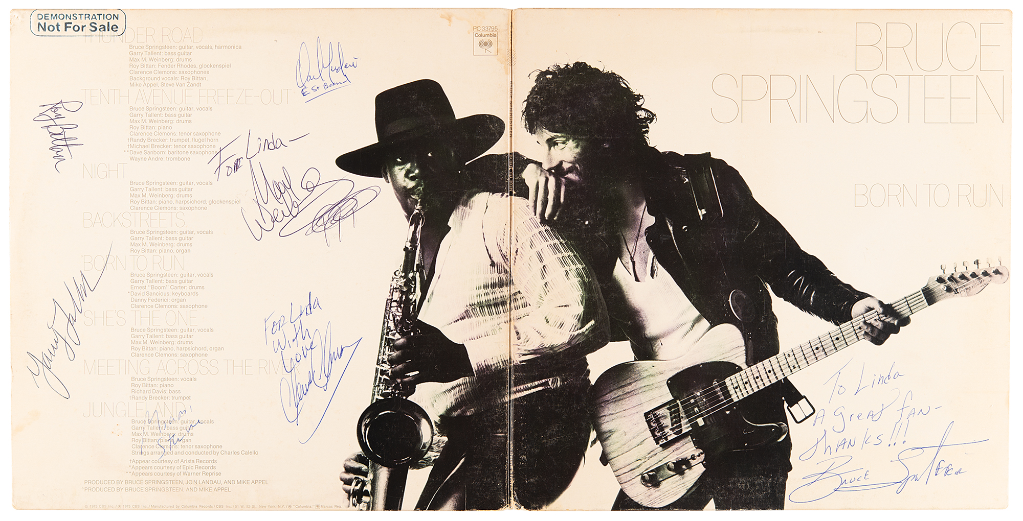 Born to Run album signed and inscribed on the front cover in blue ballpoint, "to Linda, a great fan—Thanks!!! Bruce Springsteen," and on the reverse in various inks by band members Steven Van Zandt, Clarence Clemons, Garry Tallent, Roy Bittan, Max Weinberg, and Dan Federici. Stamped on the reverse in silver: "Demonstration, Not For Sale." In fine condition. The record is included.