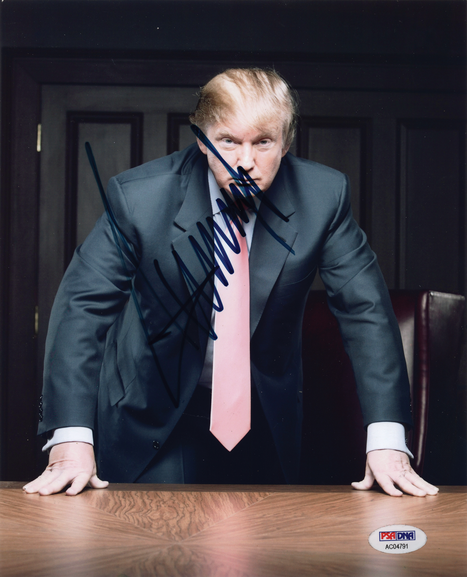Color glossy 8 x 10 photo of Donald Trump in a suit and tie, prominently signed in blue felt tip. In fine condition, with a PSA/DNA label affixed to the lower right corner (certificate of authenticity not present).