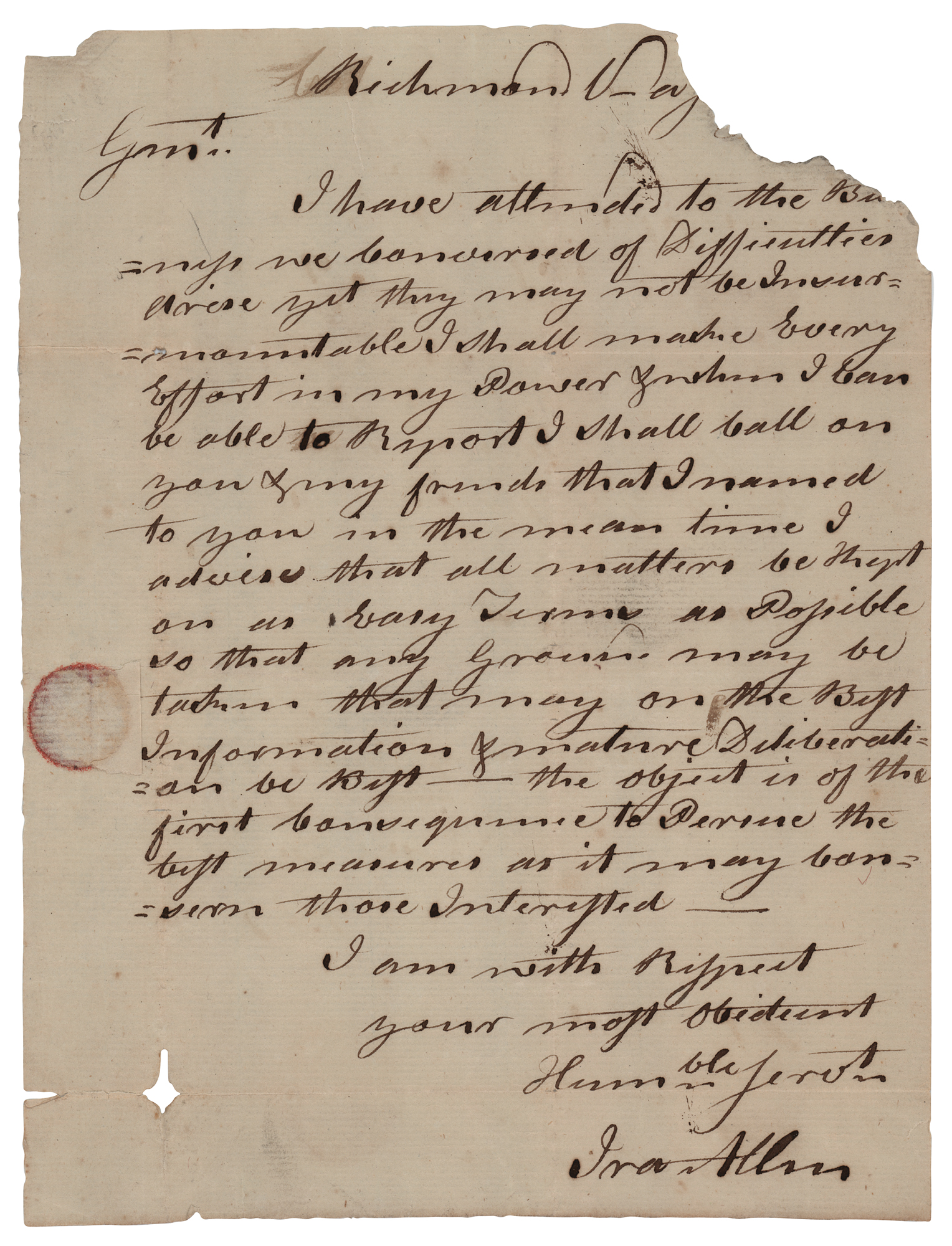 One of the founders of the state of Vermont (1751–1814), a leader of the Green Mountain Boys, and brother of Ethan Allen. ALS signed “Ira Allen,” one page, 7.75 x 10, no date. Handwritten letter to a gentleman, in part: "I have attended to the business we conversed of. Difficulties arise yet they may not be insurmountable. I shall make every effort in my power & when I can be able to Report I shall call on you & my friends that I named to you in the mean time I advise that all matters be kept on as easy terms as possible." In very good to fine condition, with paper loss to the upper right corner slightly affecting a single word of text, a repaired fold separation at lower left, and a small hole to the lower left corner. Accompanied by a full letter of authenticity from JSA, a receipt from noted autograph dealer Robert F. Batchelder, and a letter from famous autograph dealer Mary A. Benjamin to fellow hobby pioneer Charles Hamilton, offering her opinion on the present letter: "I am positive that it is all right and the right man."
