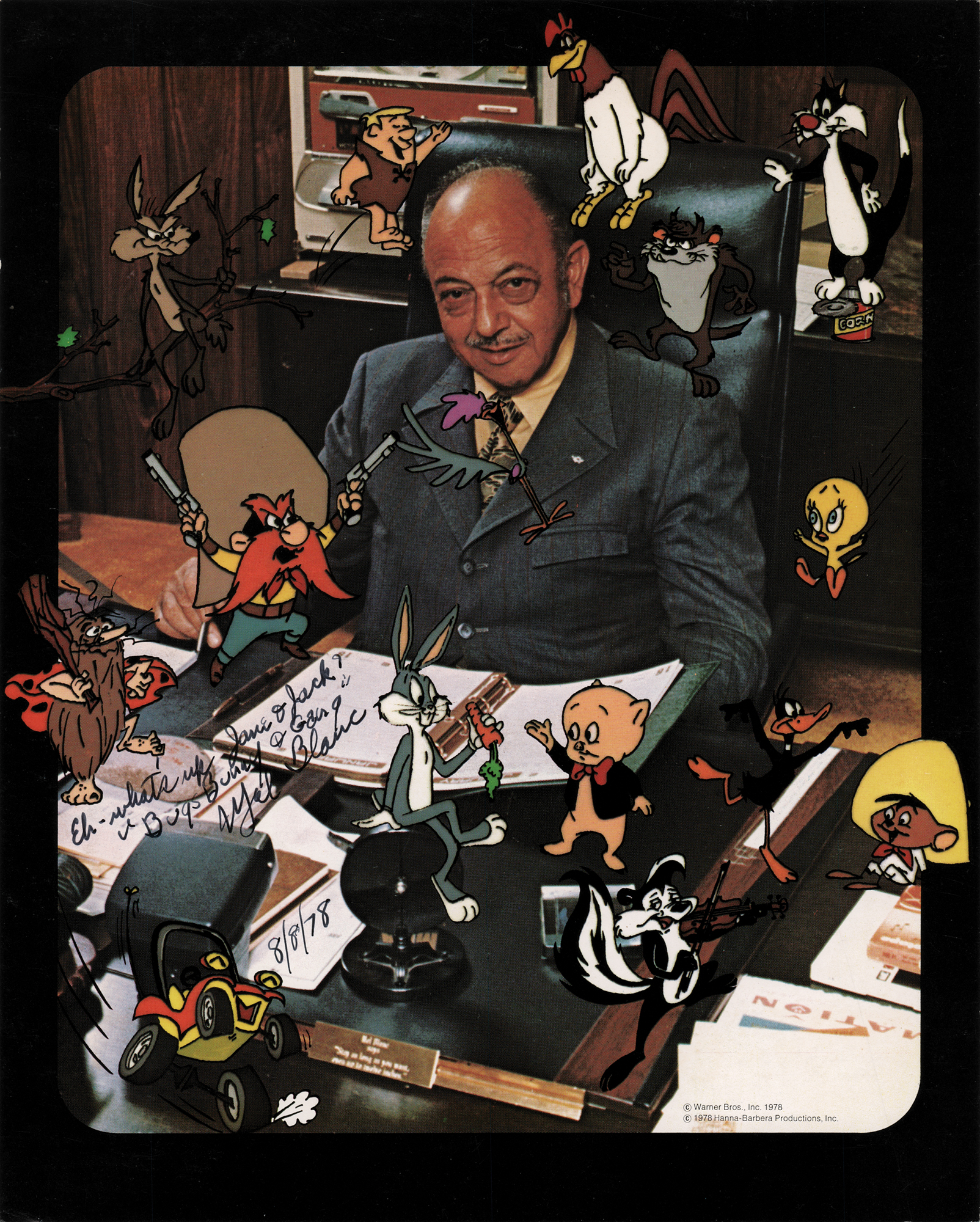 Color 8 x 10 cardstock photo of Mel Blanc seated at his desk and surrounded by many of the legendary cartoon characters he voiced, signed and inscribed in black felt tip, "Eh—what's up Jane & Jack? 'Bugs Bunny & Gang,' Mel Blanc, 8/8/78.” In fine condition.