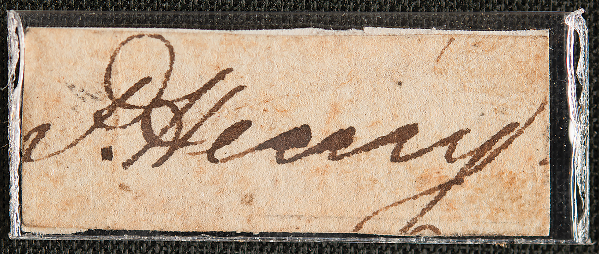 American patriot (1736–1799) best remembered for his stirring, historic declaration, ‘Give me liberty or give me death.’ Ink signature, "P. Henry,” on an off-white 1.5 x .5 slip, matted with a portrait and plaque to an overall size of 17 x 10. In fine condition.