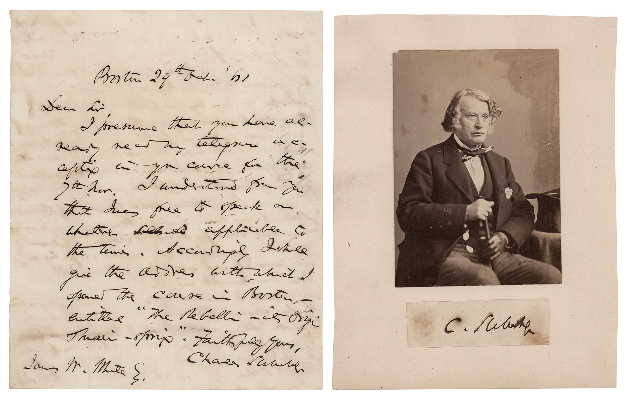 ALS, one page, 7.25 x 8.75, October 29, 1861. Handwritten letter to a gentleman, in part: "I presume that you have already rec'd my telegram accepting in your cause for the 7th Nov. I understood from you that I was free to speak on whatever…applicable to the time. Accordingly I shall give the address with which I opened the cause in Boston—entitled 'The Rebellion—its origin & main-spring.'" In fine condition, with overall faint staining. Accompanied by a clipped ink signature, "C. Sumner," affixed to an off-white 6.5 x 8.75 card below an albumen portrait.