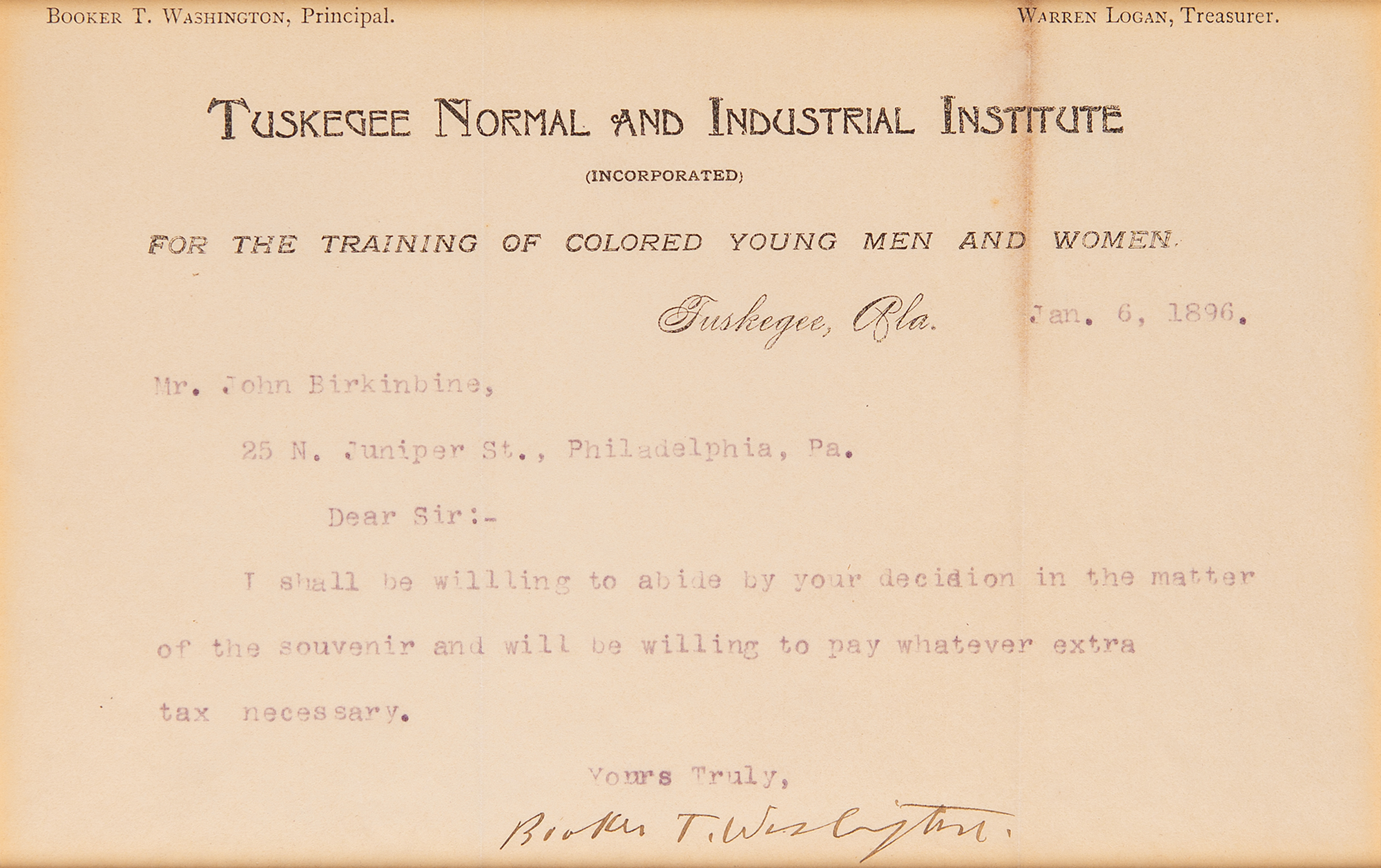 TLS, one page, 8 x 5, Tuskegee Normal and Industrial Institute letterhead, January 6, 1896. Letter to John Birkinbine in Philadelphia, in full: "I shall be willing to abide by your decision in the matter of the souvenir and will be willing to pay whatever extra tax necessary." Matted with a portrait to an overall size of 11 x 14. In fine condition, with light edge toning, and a thin stain to one of the vertical folds.