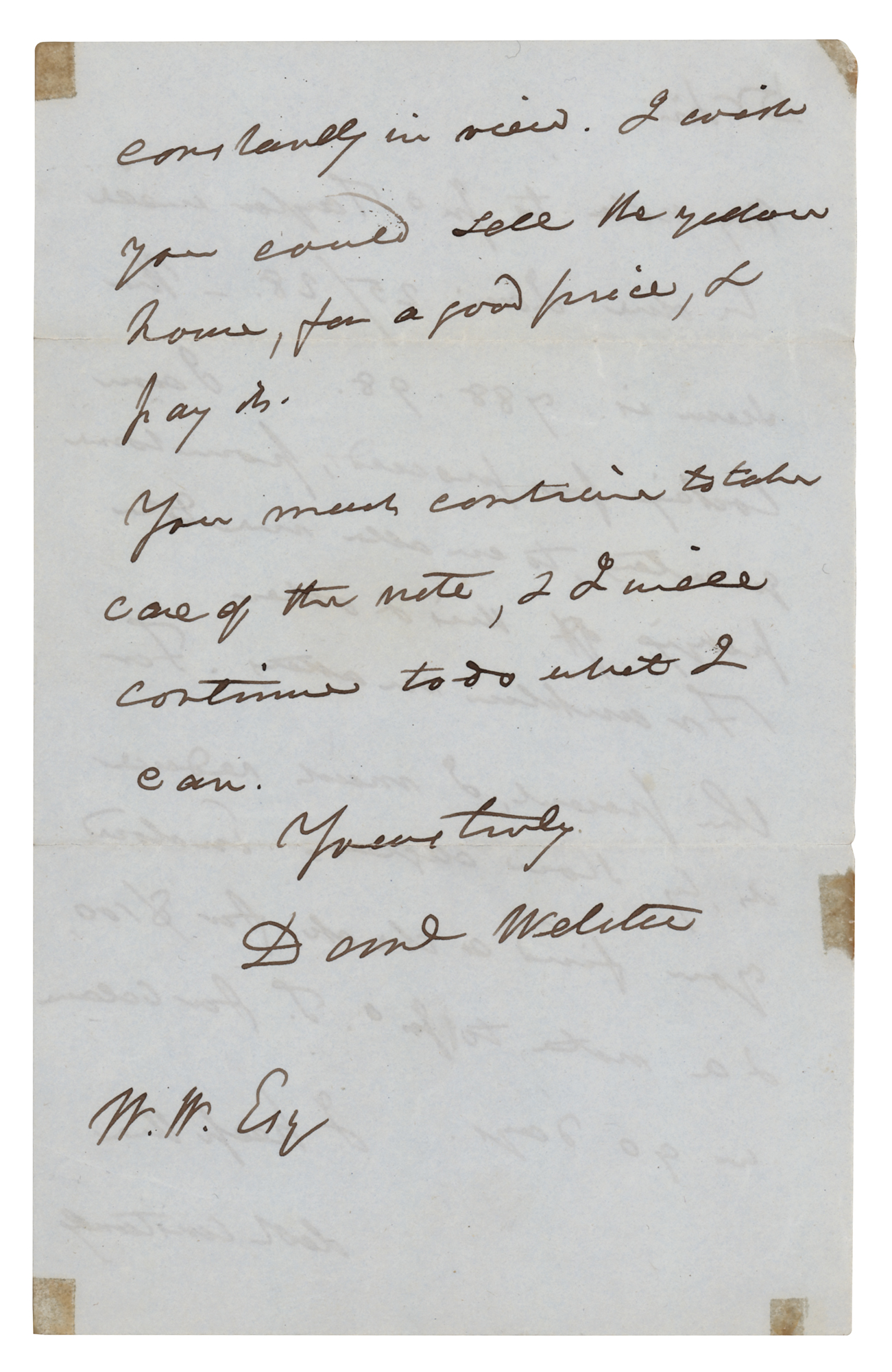 ALS signed “Dan'l Webster,” one page both sides, 4.5 x 7, no date. Handwritten letter regarding business arrangements, in part: "My note to Jno. Taylor will be due Jan. 25/28—the sum is 788.98. I am looking for proceeds, from some quarters, to enable me to be paying off this & other Franklin matters…Enclosed you find a check for $100, & a note to Jno. T. for balance in 90 days…You must continue to take care of the note, & I will continue to do what I can." In fine condition, with small old tape stains to the edges.