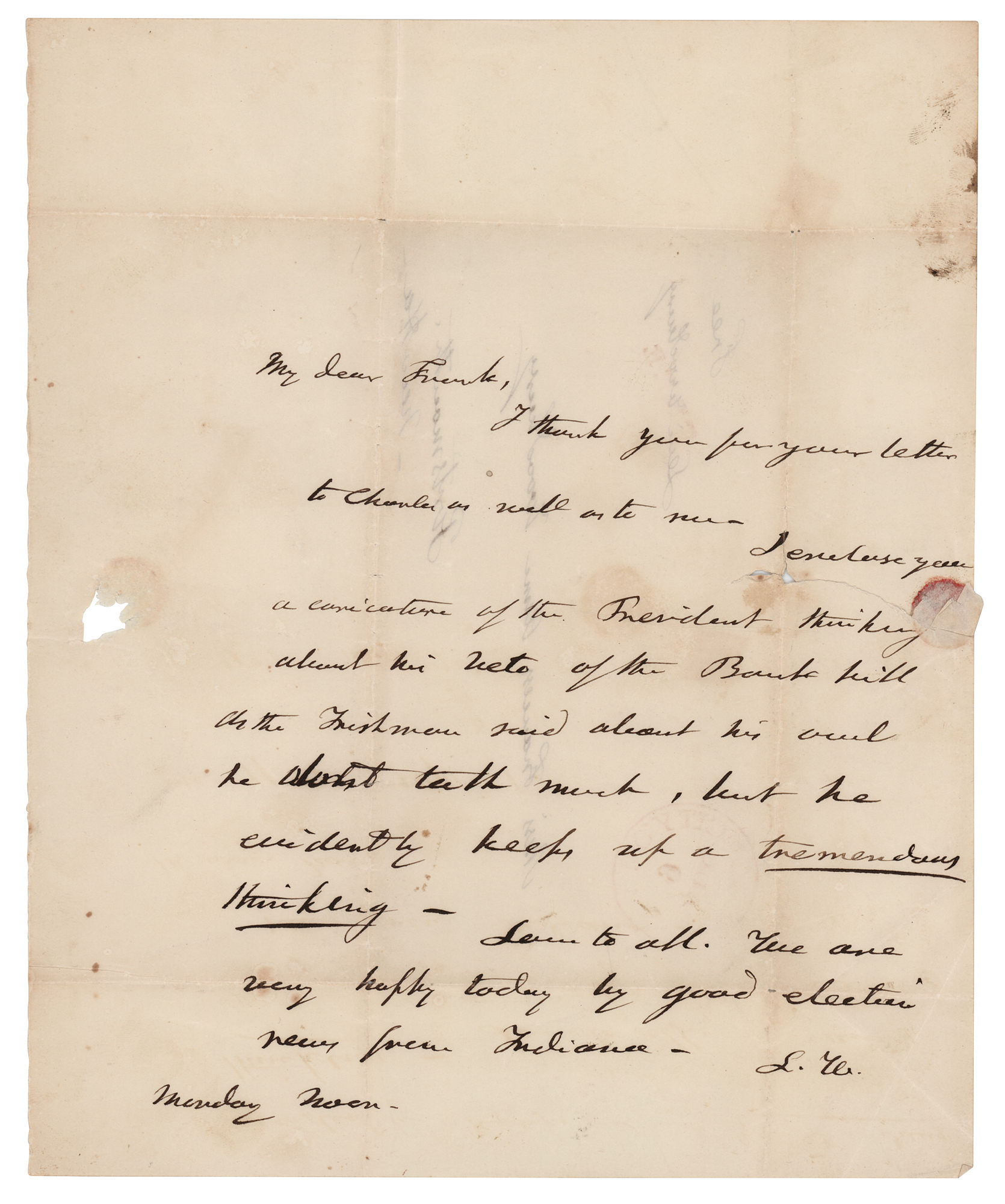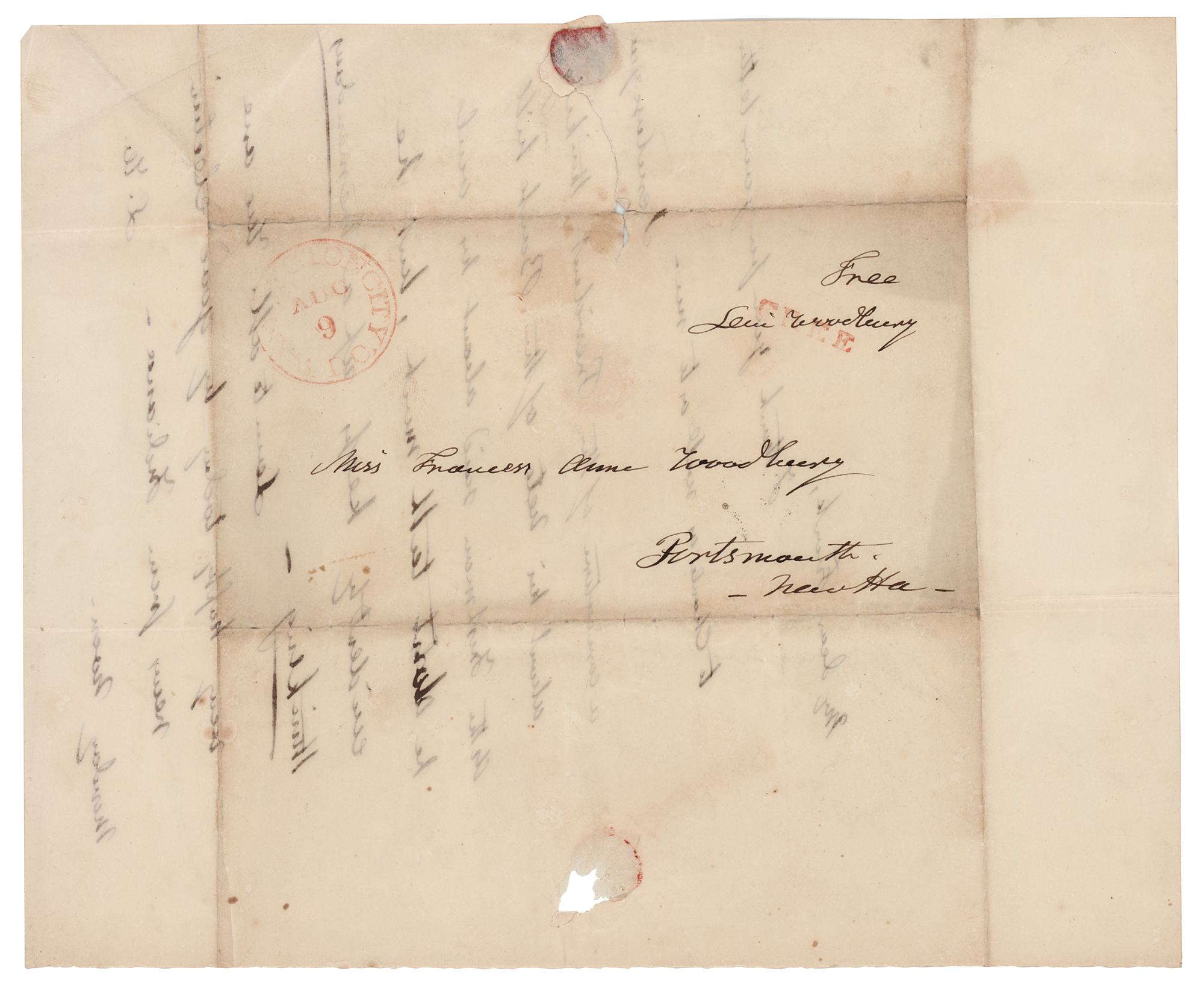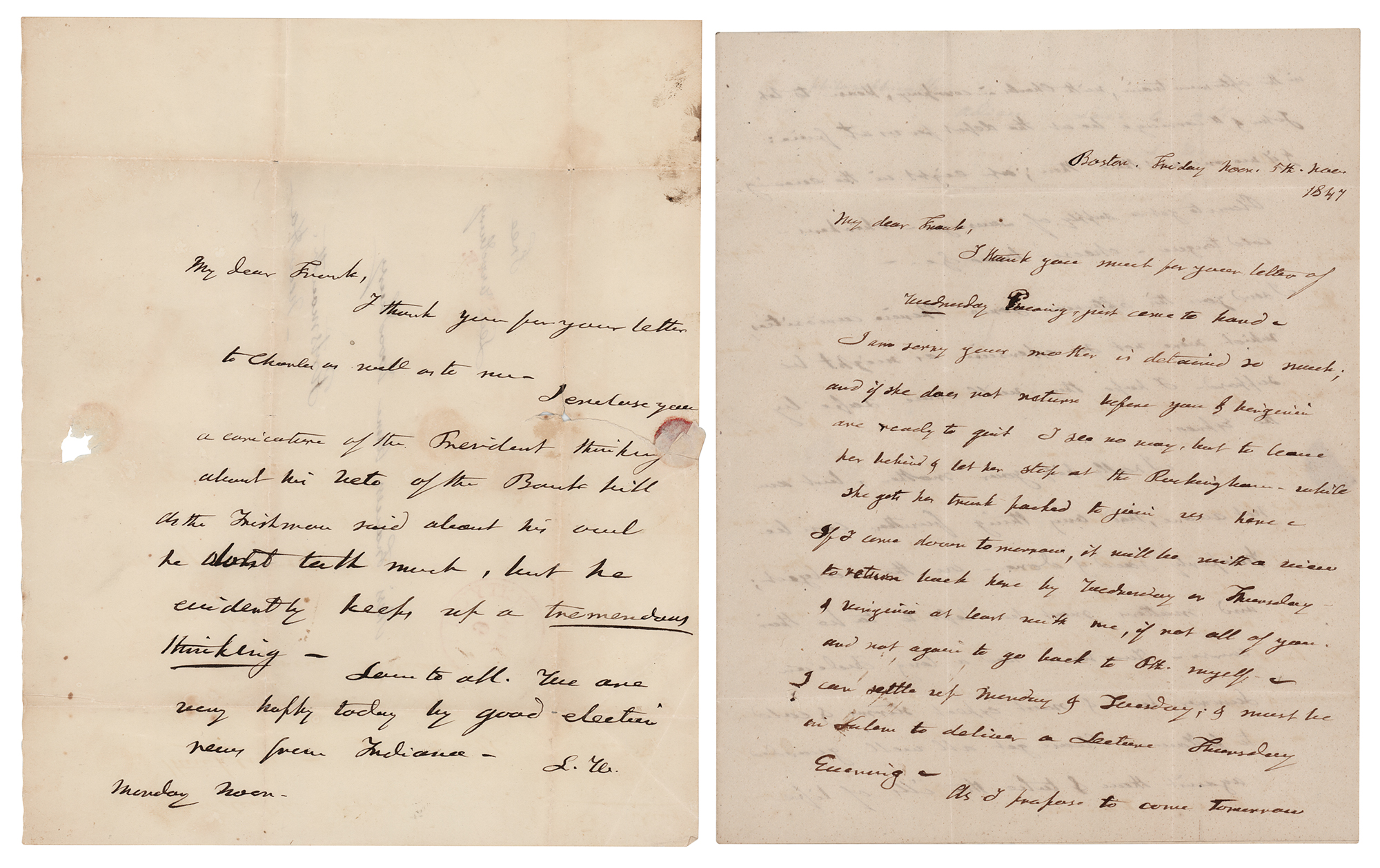 American attorney, jurist, and Democratic politician (1789–1851) who served as Secretary of the Navy under President Jackson, Secretary of the Treasury under Jackson and Van Buren, and as an Associate Justice of the Supreme Court from 1845 until his death. Two handwritten letters by Woodbury, both to Francess Anne Woodbury: an ALS signed "L. W.," one page, 8 x 10, postmarked August 9, [no year], in part: "I enclose you a caricature of the President thinking about his veto of the Bank bill as the Irishman said about his owl he didn't talk much, but he evidently keeps up a tremendous thinking," addressed on the reverse in Woodbury's hand and franked, "Free, Levi Woodbury"; and an ALS signed "L. W.," three pages on two adjoining sheets, 7.75 x 9.75, November 5, 1847, in part: "I am sorry your mother is detained so much…If I come down tomorrow, it will be with a view to return back home by Wednesday or Thursday…I really pity your mother, but am not aware, that anything further can be properly said & done on the subject; and matters must be left to take their course," also addressed on the reverse in Woodbury's hand. In very good to fine condition, with seal-related tears to the shorter letter.