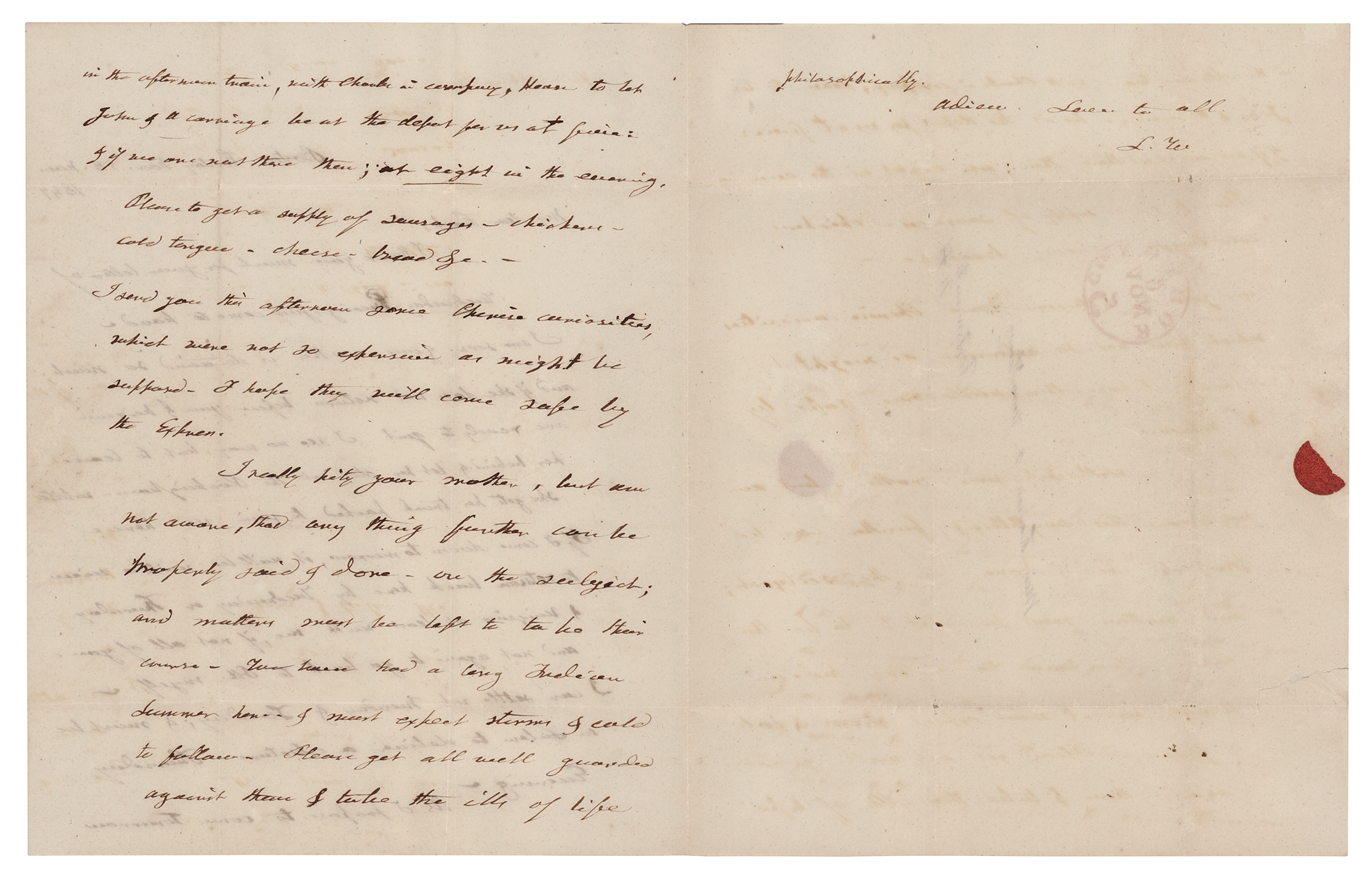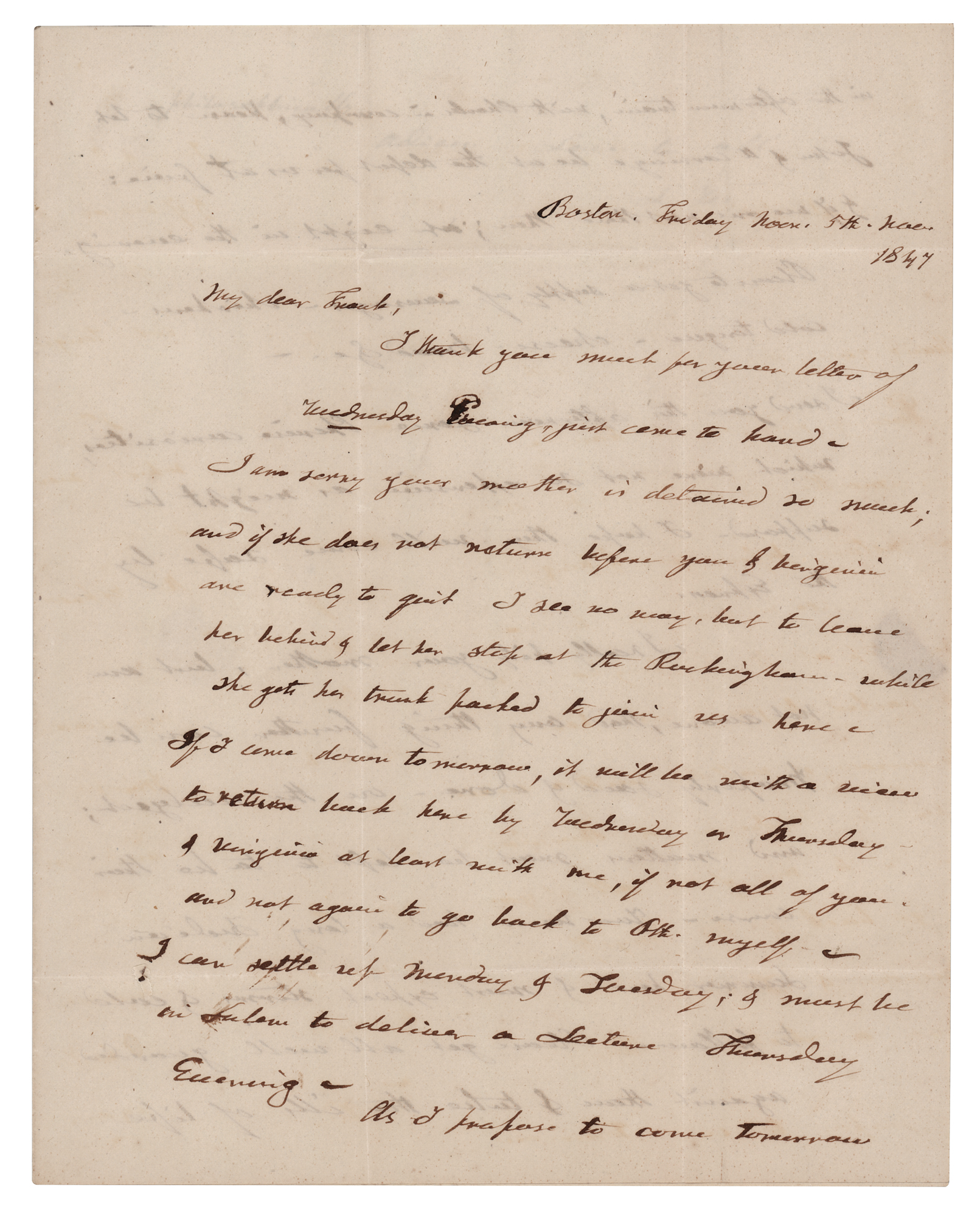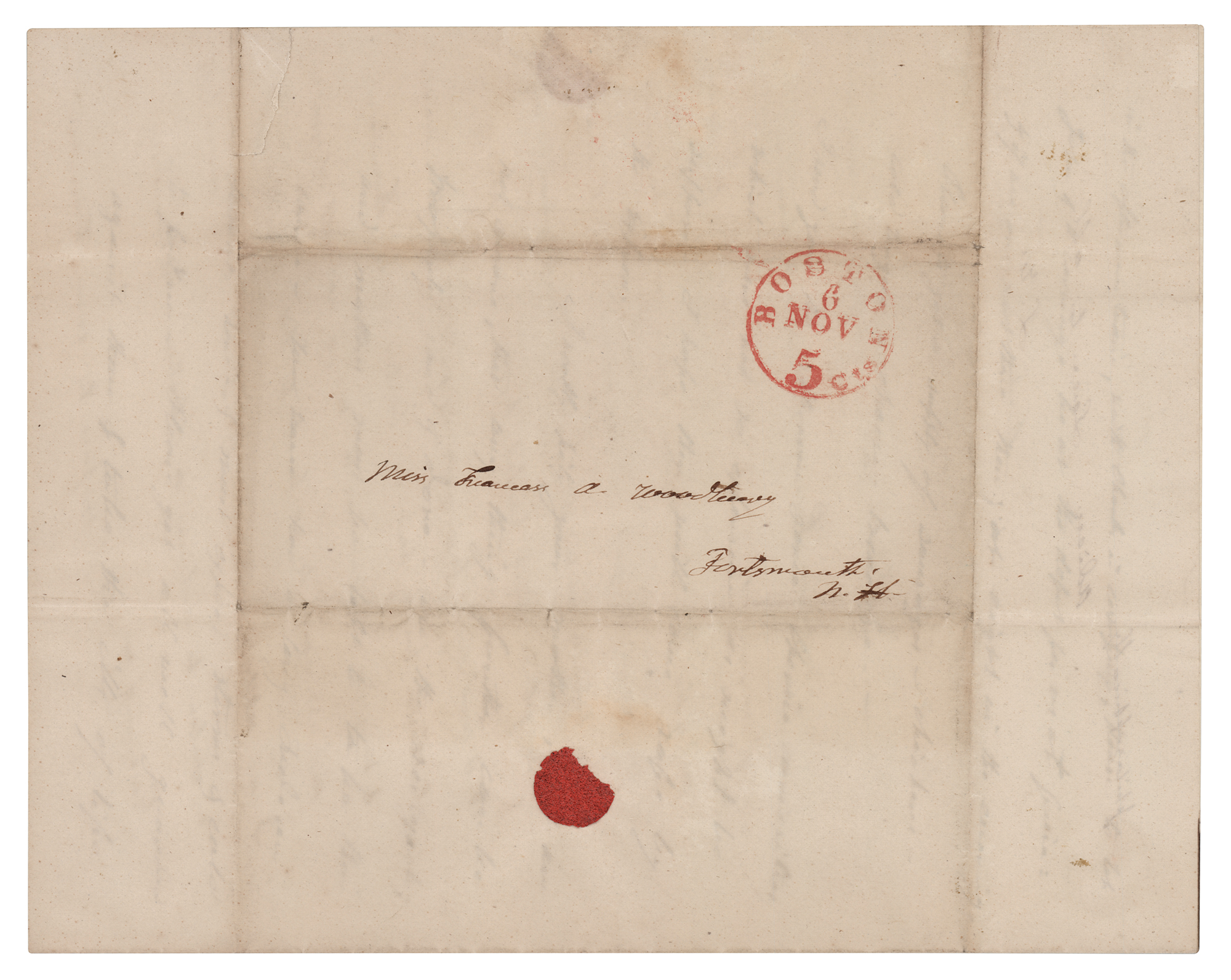 American attorney, jurist, and Democratic politician (1789–1851) who served as Secretary of the Navy under President Jackson, Secretary of the Treasury under Jackson and Van Buren, and as an Associate Justice of the Supreme Court from 1845 until his death. Two handwritten letters by Woodbury, both to Francess Anne Woodbury: an ALS signed "L. W.," one page, 8 x 10, postmarked August 9, [no year], in part: "I enclose you a caricature of the President thinking about his veto of the Bank bill as the Irishman said about his owl he didn't talk much, but he evidently keeps up a tremendous thinking," addressed on the reverse in Woodbury's hand and franked, "Free, Levi Woodbury"; and an ALS signed "L. W.," three pages on two adjoining sheets, 7.75 x 9.75, November 5, 1847, in part: "I am sorry your mother is detained so much…If I come down tomorrow, it will be with a view to return back home by Wednesday or Thursday…I really pity your mother, but am not aware, that anything further can be properly said & done on the subject; and matters must be left to take their course," also addressed on the reverse in Woodbury's hand. In very good to fine condition, with seal-related tears to the shorter letter.