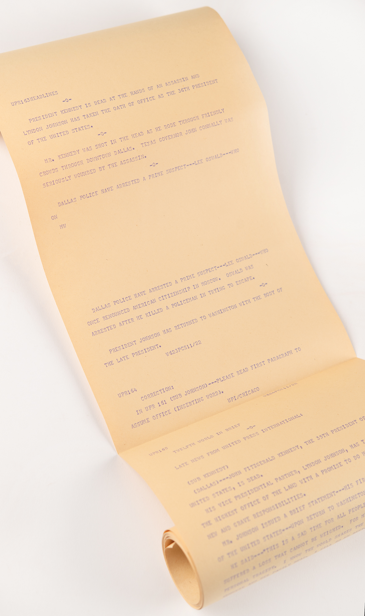 Original roughly 15-foot-long United Press International teletype roll reporting the breaking news of the death of President John F. Kennedy following his assassination in Dallas, Texas, on November 22, 1963. The roll consists of bulletins UPR158, which offers a Kennedy family biography and Oregon weather reports, and bulletins UPR163 through to UPR 177, which includes ample aftermath details on the shooting, the arrest of Lee Harvey Oswald, the inauguration of Lyndon B. Johnson as president, and reactions from national and international figures. Highlights are as follows: