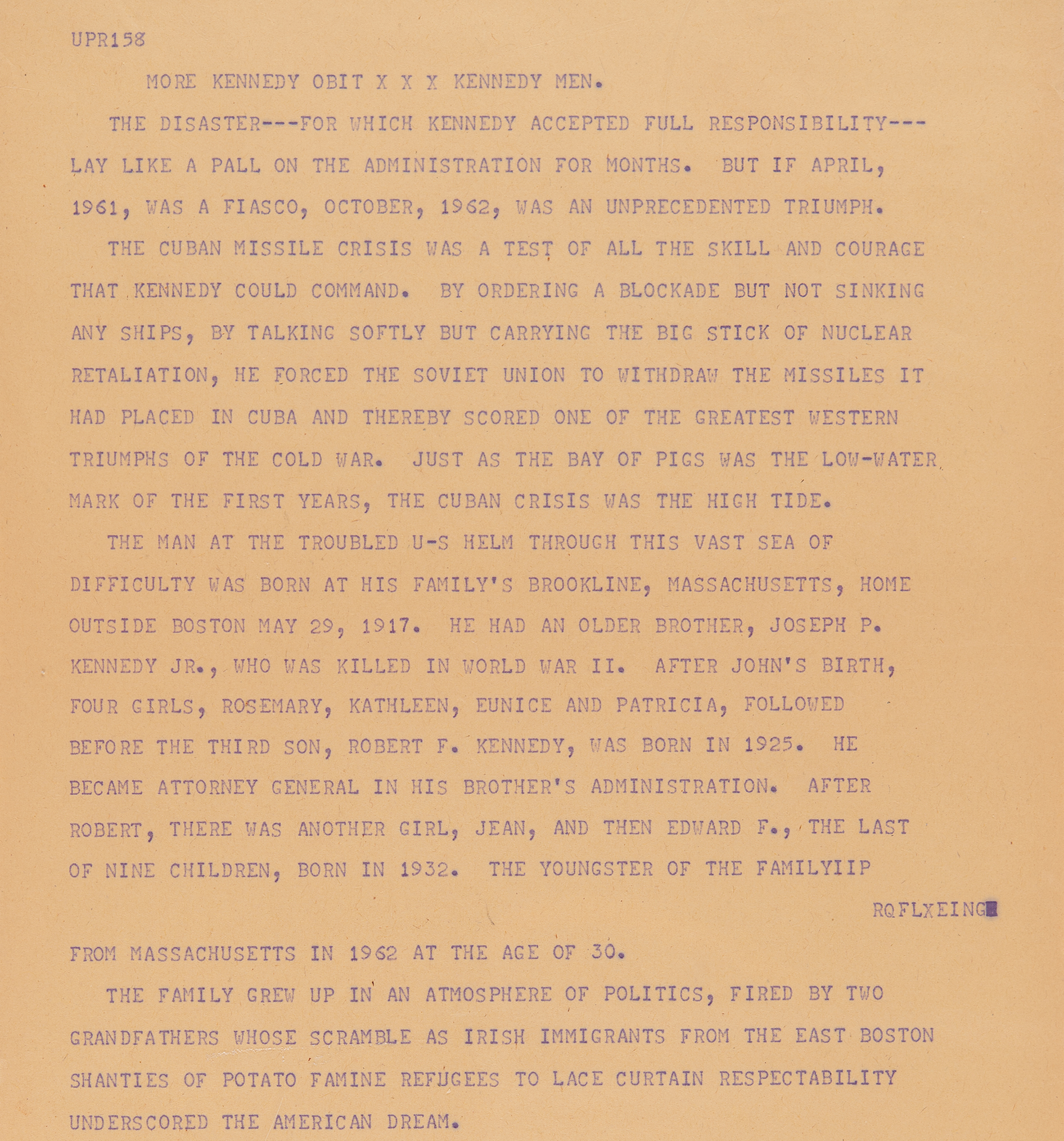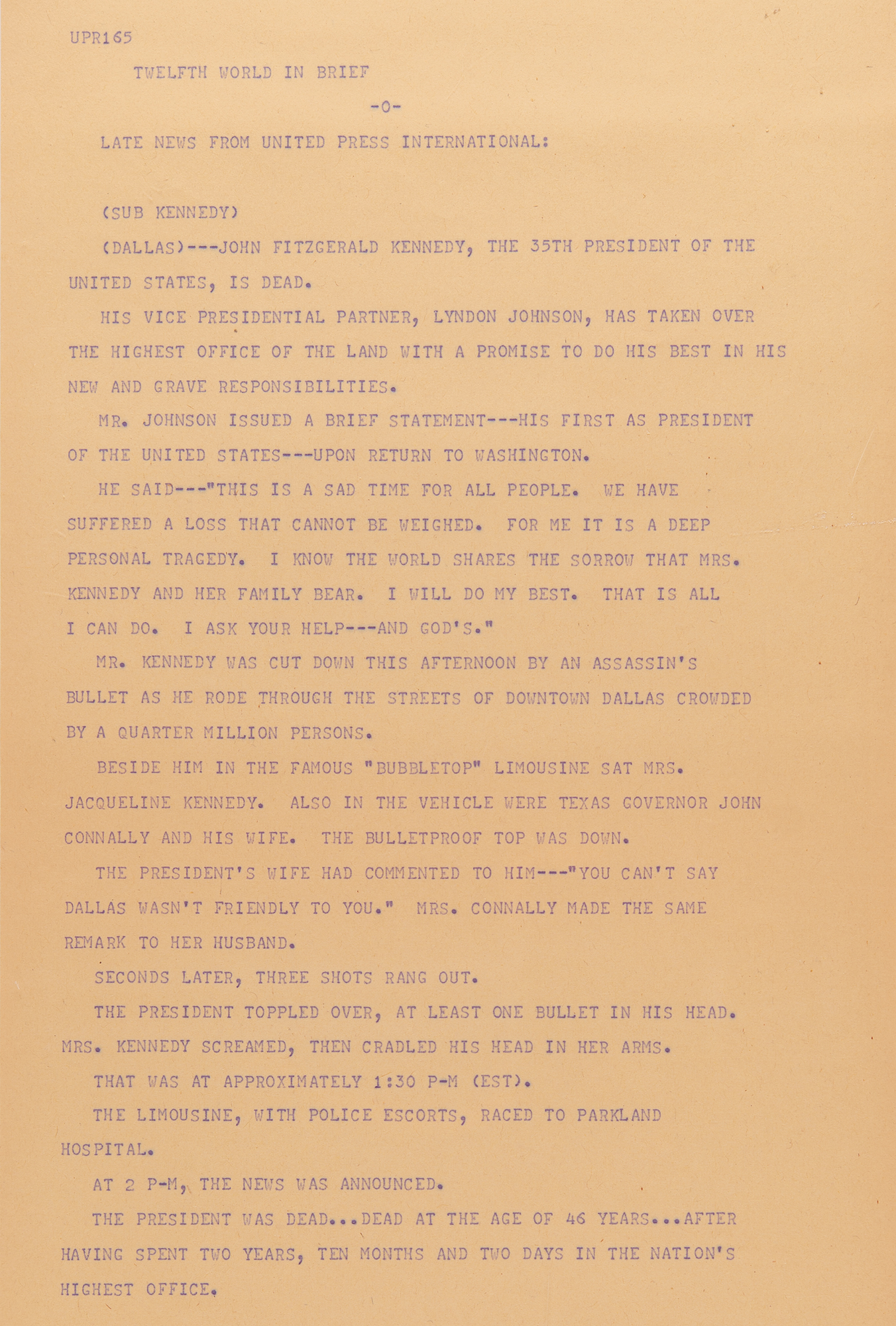 UPR165: “Mr. Kennedy was cut down this afternoon by an assassin's bullet as he rode through the streets of downtown Dallas crowded by a quarter million persons. Beside him in the famous bubbletop limousine sat Mrs. Jacqueline Kennedy…The president's wife had commented to him, ‘You can't say Dallas wasn't friendly to you’…Seconds later, three shots rang out. The president toppled over, at least one bullet in his head. Mrs. Kennedy screamed, then cradled his head in her arms. That was at approximately 1:30 pm (est). The limousine, with police escorts, raced to Parkland Hospital.”