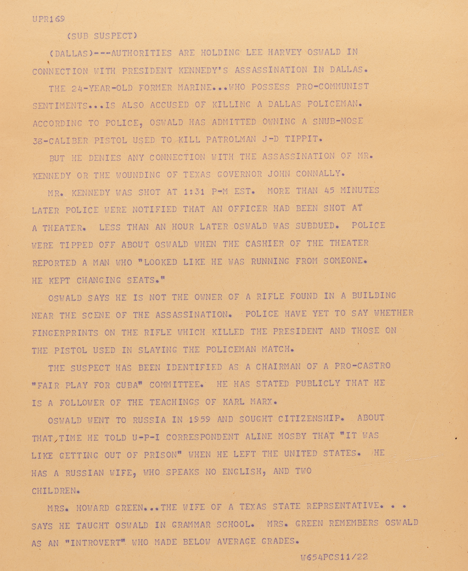 UPR169: “Authorities are holding Lee Harvey Oswald in connection with President Kennedy's assassination in Dallas. The 24-year-old former Marine…who possess pro-Communist sentiments…is also accused of killing a Dallas policeman. According to police, Oswald has admitted owning a snub-nose 38-caliber pistol used to kill patrolman J. D. Tippit. But he denies any connection with the assassination of Mr. Kennedy or the wounding of Texas Governor John Connally…Oswald says he is not the owner of a rifle found in a building near the scene of the assassination. Police have yet to say whether fingerprints on the rifle which killed the president and those on the pistol used in slaying the policeman match.”