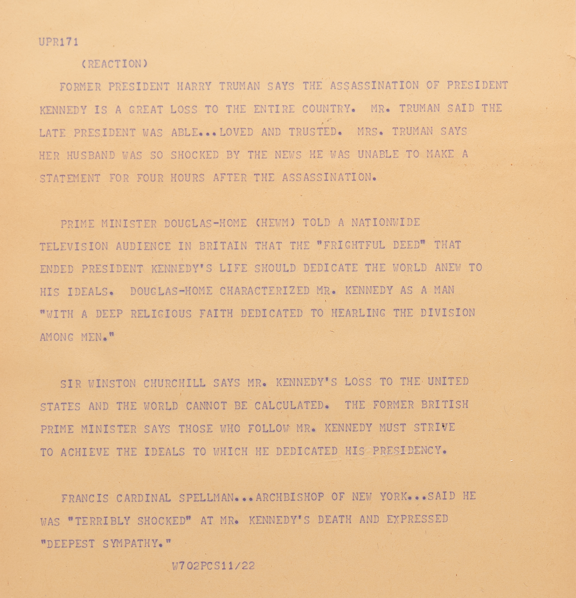 Sir Winston Churchill says Mr. Kennedy's loss to the United States and the world cannot be calculated. The former British Prime Minister says those who follow Mr. Kennedy must strive to achieve the ideals to which he dedicated his presidency.” The teletype bears a few editorial annotations. Rolled and in fine condition, with some horizontal folds and light edgewear.