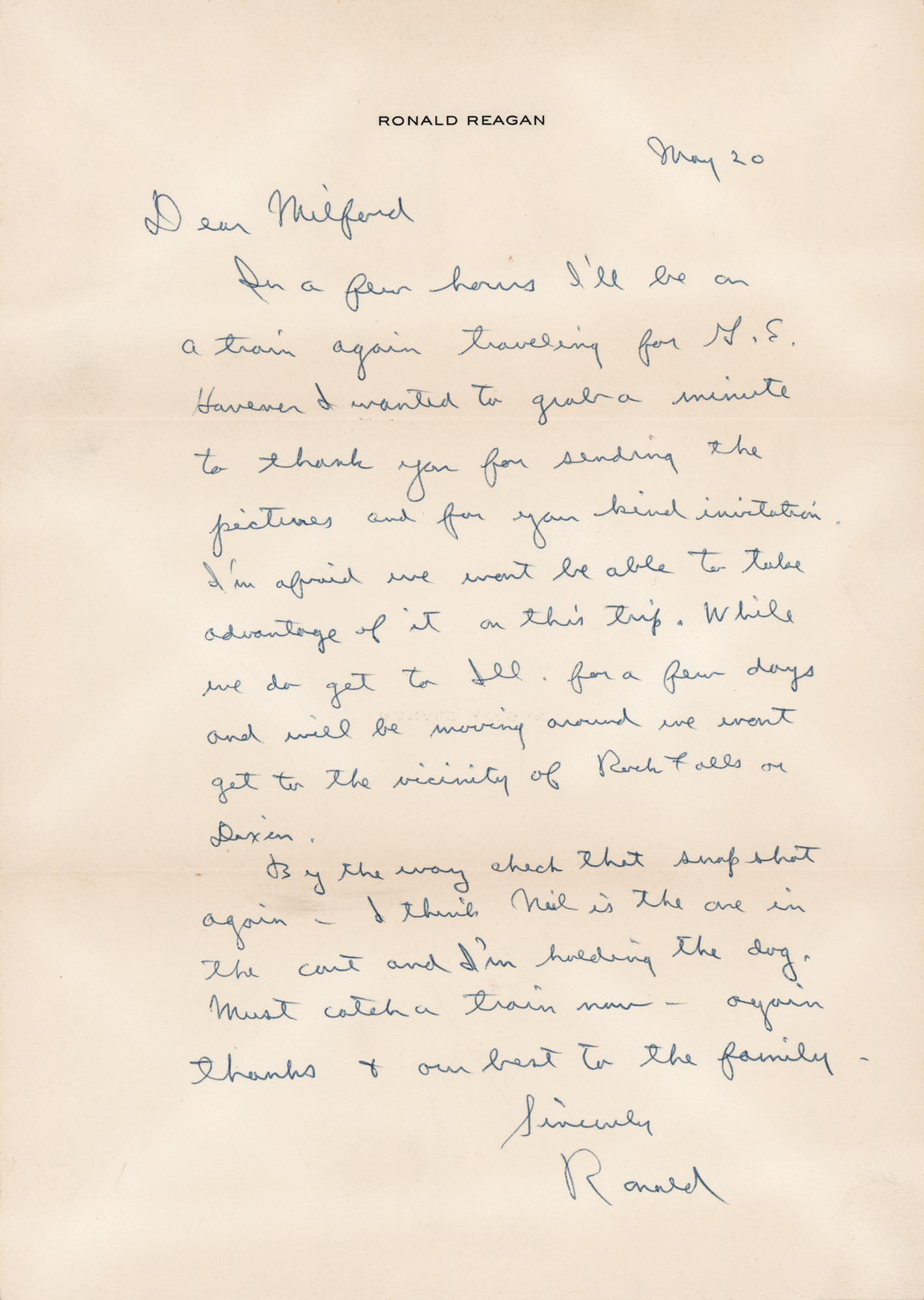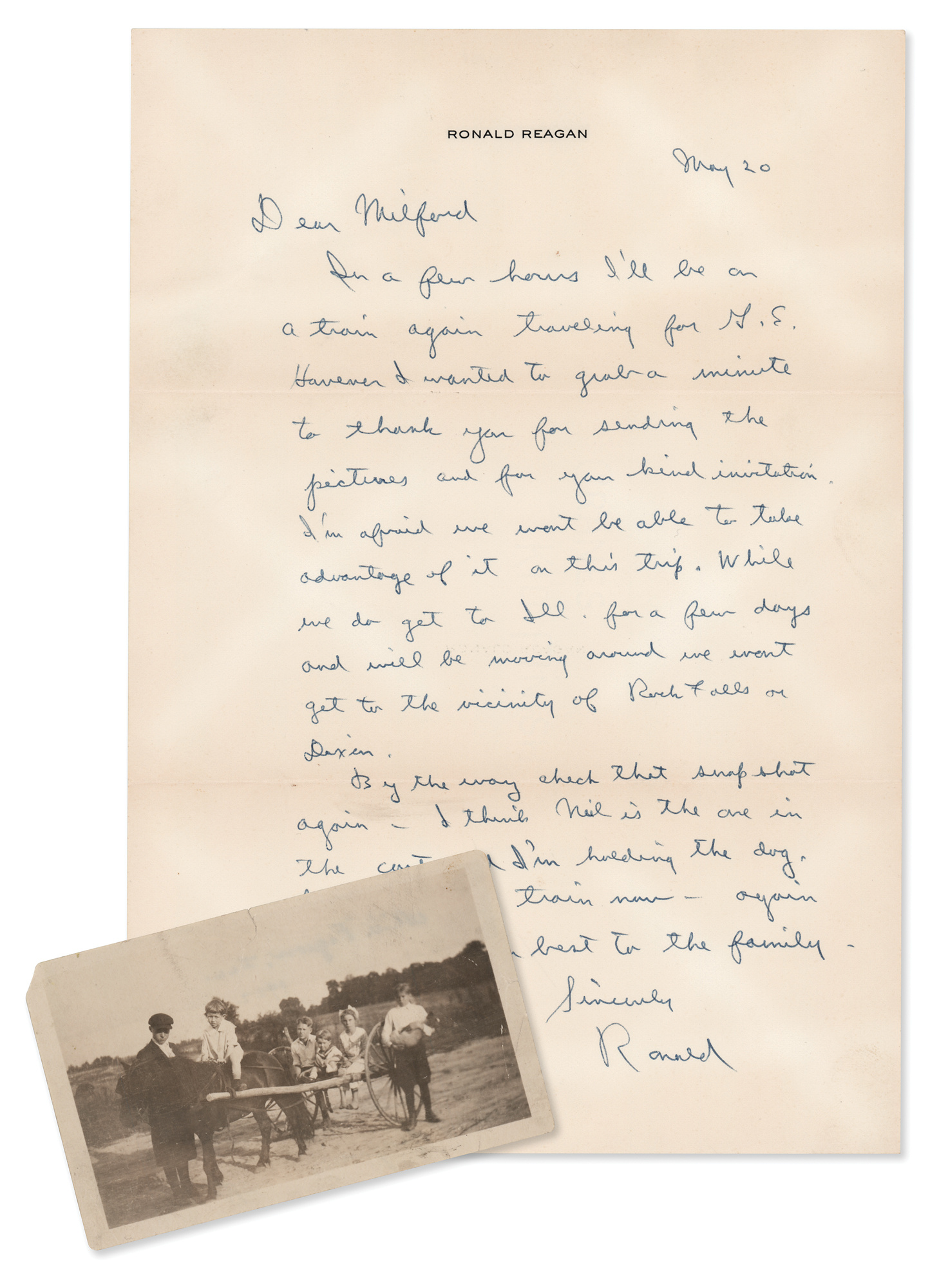 ALS signed “Ronald,” one page, 7.5 x 10.5, personal letterhead, May 20, 1957, paired with an extremely early matte-finish period photo of Reagan at 11 years of age, posing with his brother, Neil, and other children in White Pigeon, Illinois, in 1922. The handwritten letter, sent to childhood friend Milford Smith of Rock Falls, Illinois, reads in full: “In a few hours I'll be on a train again traveling for G.E. However I wanted to grab a minute to thank you for sending the pictures and for your kind invitation. I'm afraid we won't be able to take advantage of it on this trip. While we do get to Ill. for a few days and will be moving around we won't get to the vicinity of Rock Falls or Dixon. By the way check that snapshot again – I think Neil is the one in the cart and I'm holding the dog. Must catch a train now – again thanks & our best to the family.” The included photo, 4.5 x 2.75, depicts a group of six children posing on and around a horse-drawn cart, with annotations to reverse dating the image to “White Pigeon, Ill., 1922,” and identifying five of the six children left to right, with the first boy not named: “Milford Smith, Neil Reagan, Raymond Smith, Marie Mundt Pierce, Ronald Reagan.” In overall fine condition, with a light crease and some faint toning. Accompanied by the original mailing envelope hand-addressed by Reagan, which was postmarked in Los Angeles, California, on May 21, 1957. A desirable early handwritten letter from Reagan, then a well-established Hollywood actor, which boasts uncommon content related to his upbringing in rural Illinois. Enhancing the letter is the presence of a rare original photograph of Reagan, pictured holding a dog in his arms, that serves as a great visual reference to the future president’s humble beginnings.