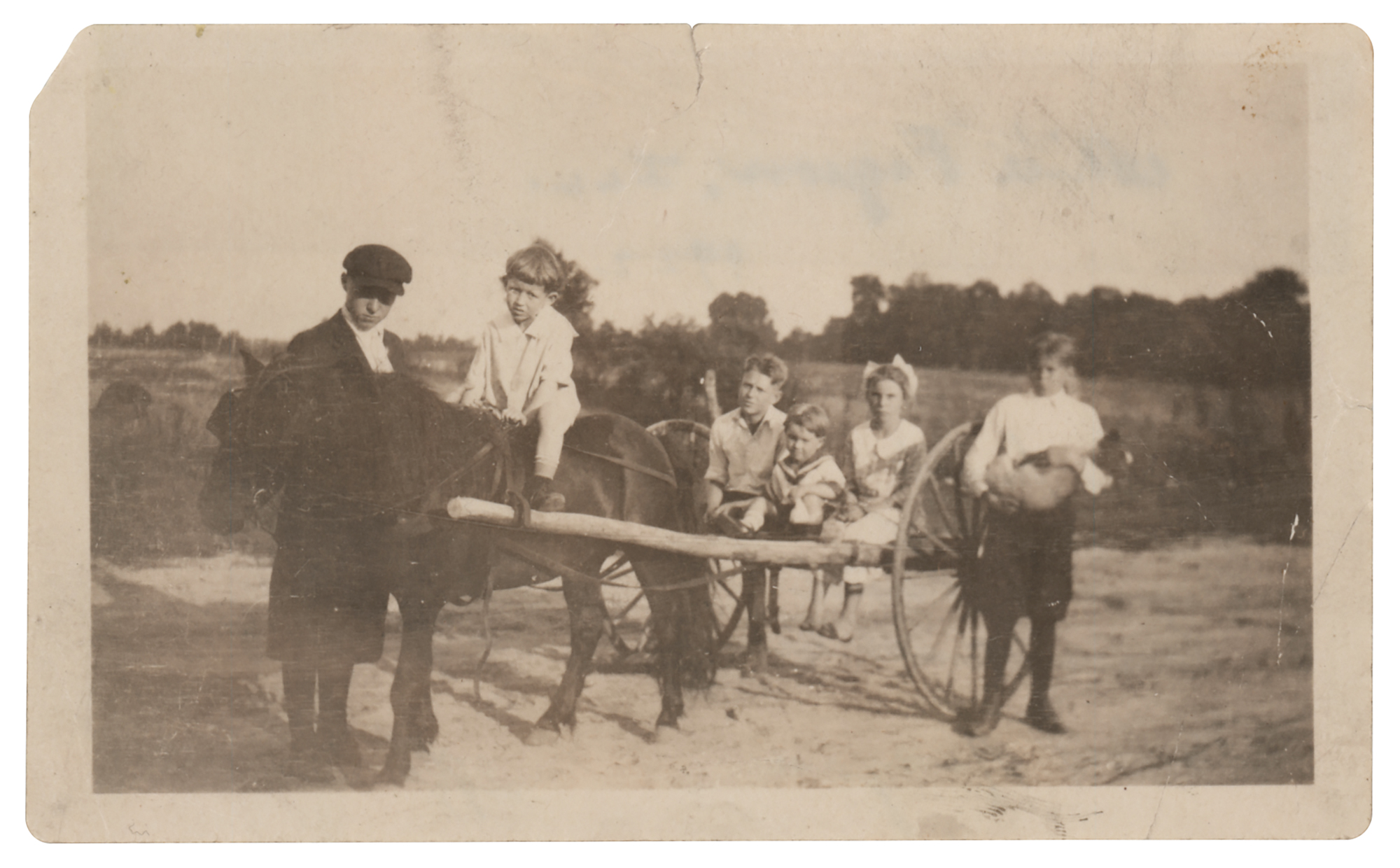 "I think Neil is the one in the cart and I'm holding the dog"—Hollywood actor Ronald Reagan sends an early original photograph to a childhood friend