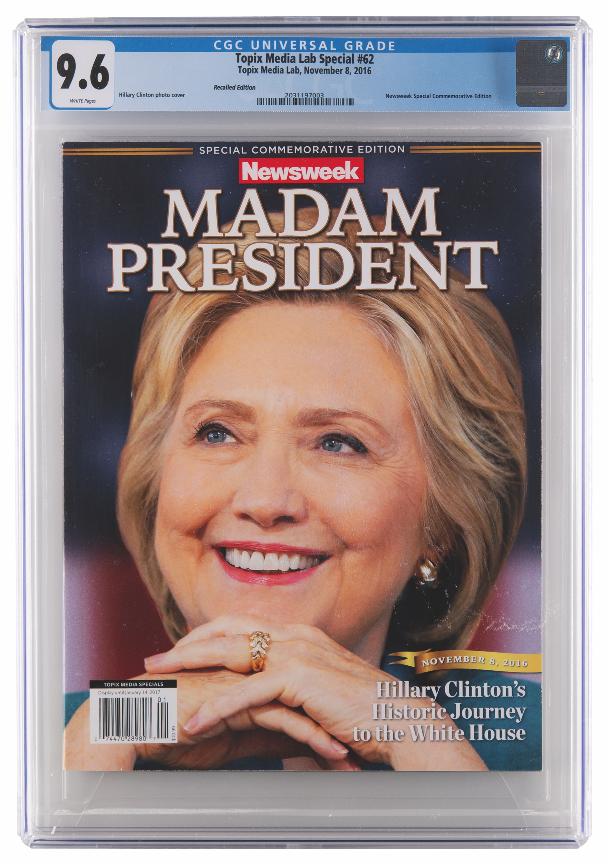 Uncommon ‘Special Commemorative Edition’ Newsweek magazine created by licensee Topix Media Lab in the event that Hillary Rodham Clinton was elected as the 45th president of the United States, 8 x 10.5, November 8, 2016, with the front cover featuring a large portrait of Clinton below the headline: “Madam President.” Encapsulated and graded by CGC as 9.6 (WHITE Pages).