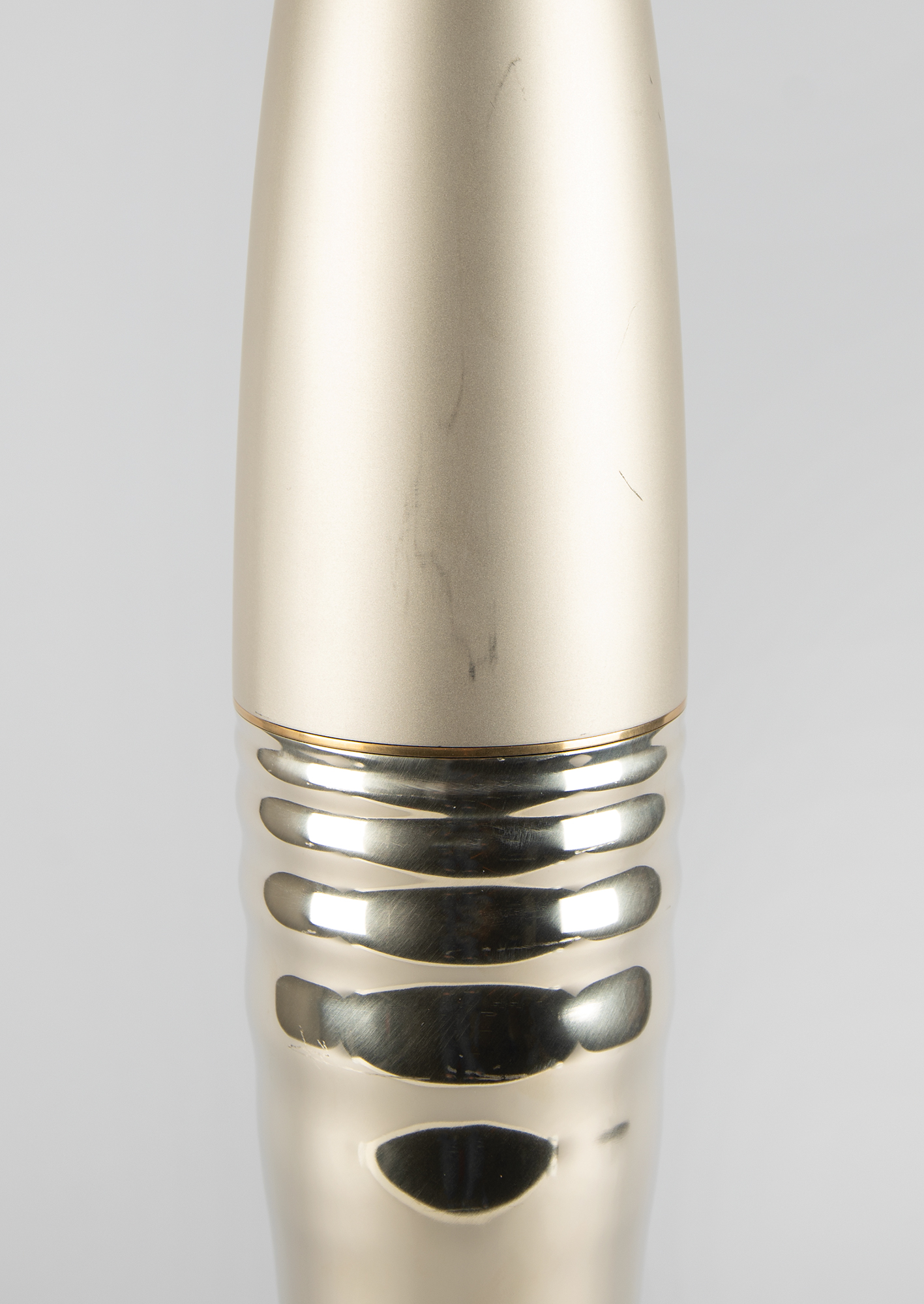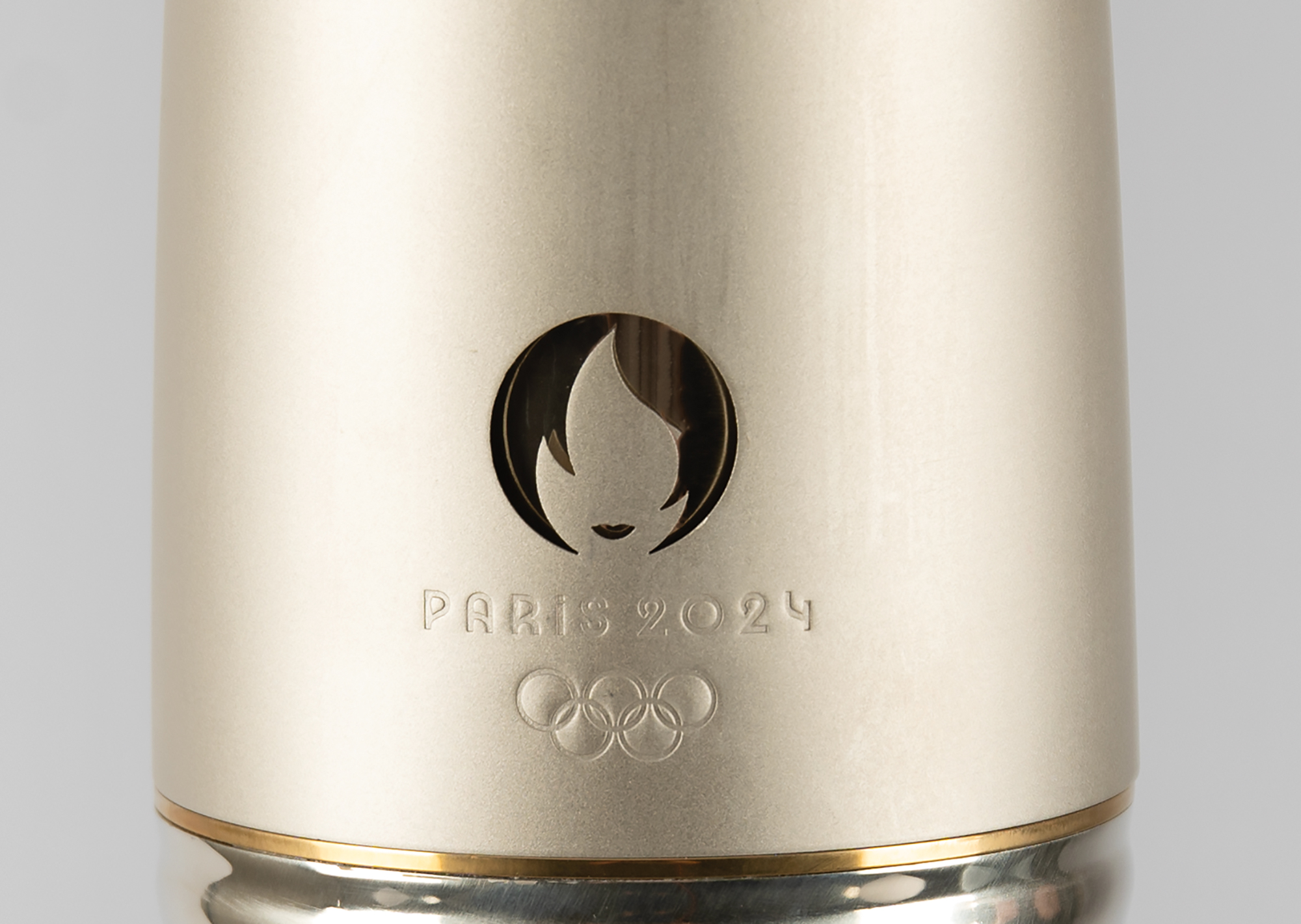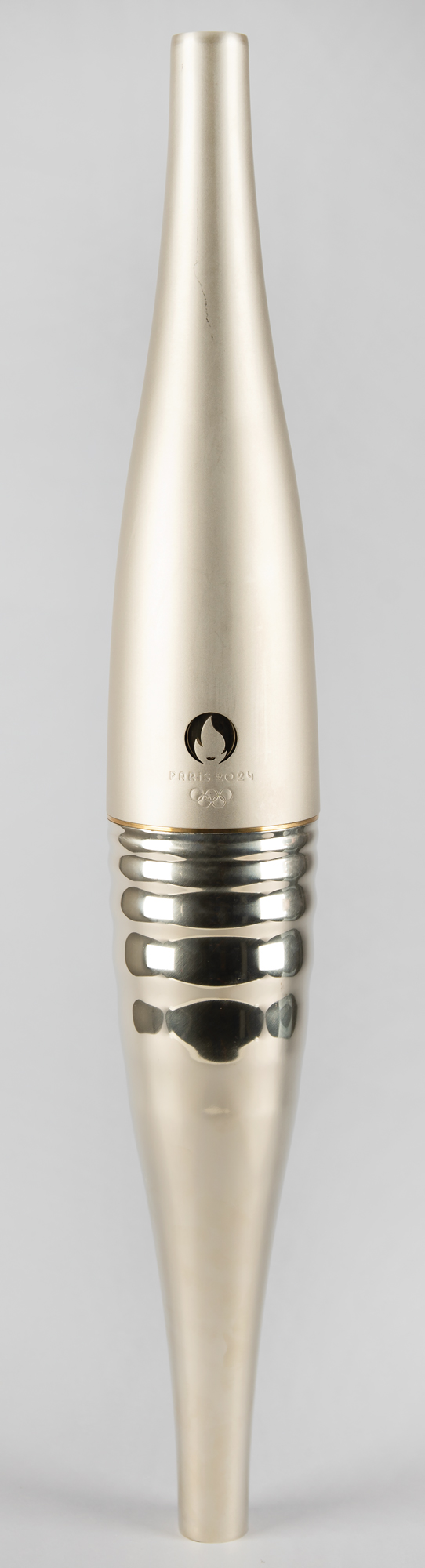 Rare official Paris 2024 Summer Olympics torch, constructed of recycled steel, designed by Mathieu Lehanneur and manufactured by ArcelorMittal, featuring a perfectly symmetrical, flowing design that draws inspiration from three themes of Paris 2024: equality, water, and peacefulness. The torch measures 27.5˝ long and 4˝ at its widest point: the upper half sports a matte finish on a plain surface, with the Paris 2024 insignia and five Olympic rings below; the lower half features a reflective finish on a rippled surface, inspired by the serenity of the water on the majestic River Seine. In total, only 2,000 torches were produced by ArcelorMittal, five times less than what was used at other recent Games.