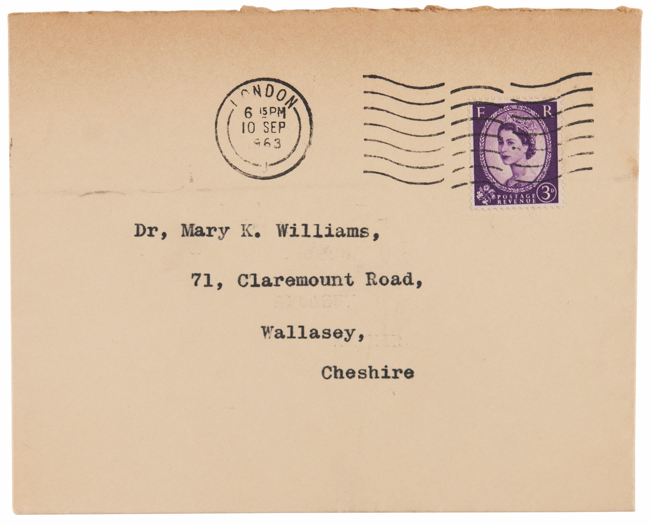 Rare TLS, one page, 5 x 8, personal '4 Old Mitre Court' letterhead, September 10, 1963. Letter to Dr. Mary K. Williams, in full: “Thank you very much for your cautionary letter of September 3rd and I will see to it that James Bond eats the right kind of butter in future. But I am terribly sorry to hear of your misfortune, and I send you my and James Bond's wishes for an early recovery.” In very fine condition. Accompanied by the original mailing envelope. A desirable letter from the revered British novelist that contains the seldom-seen presence of two “James Bond” references; direct mentions by Fleming of special agent 007 are extremely scarce and highly sought-after.