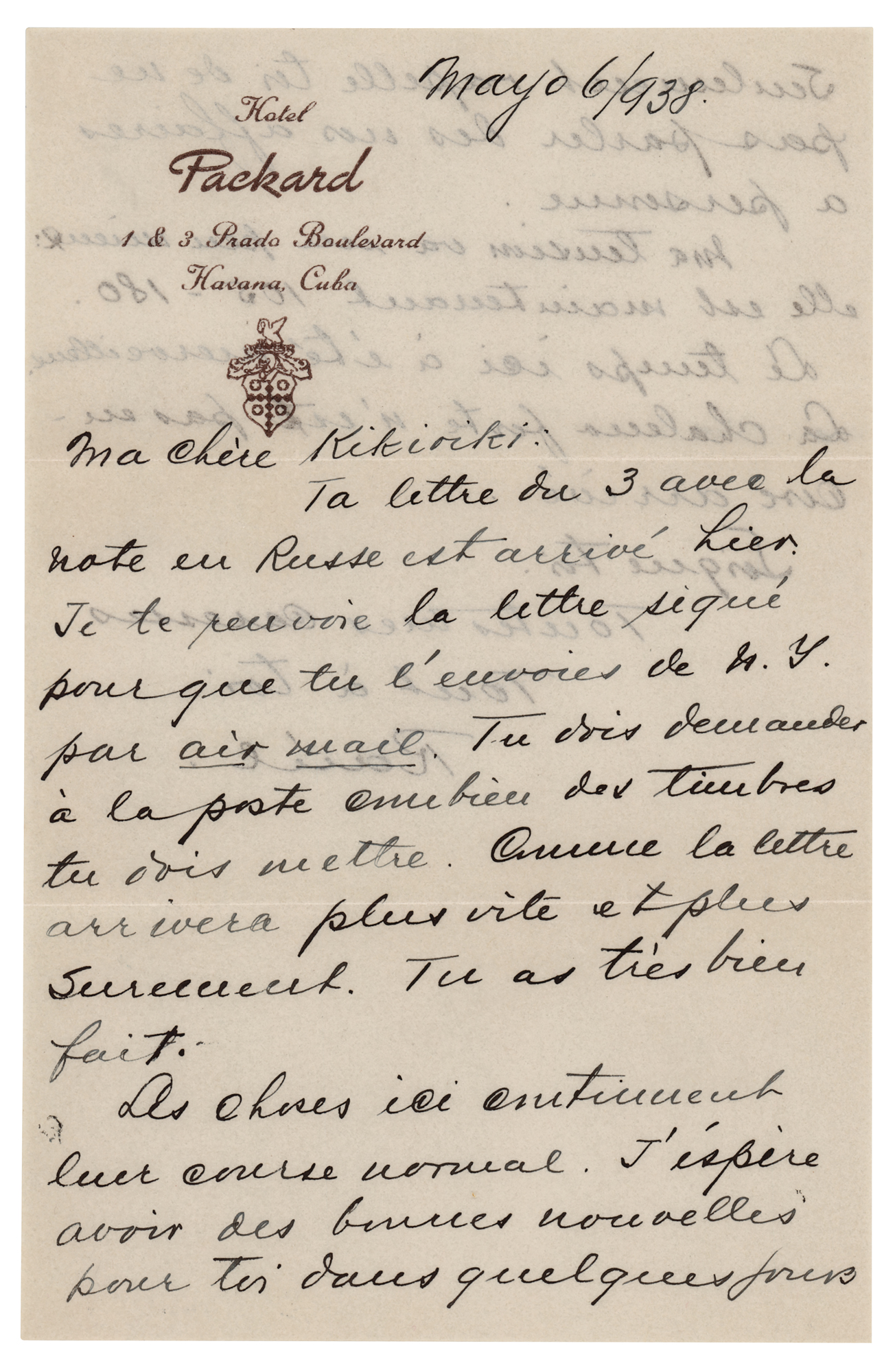 World-champion Cuban chess player (1888-1942) considered one of the greatest of all time. ALS in French, signed “Raul,” one page both sides, 5.5 x 8.5, Hotel Packard letterhead, May 9, 1938. Untranslated handwritten letter to Olga Chagodief, who he would marry in October 1938. In fine condition. Accompanied by the original mailing envelope, addressed in Capablanca's hand and incorporating his signature, "J. R. Capablanca," in the return address area.