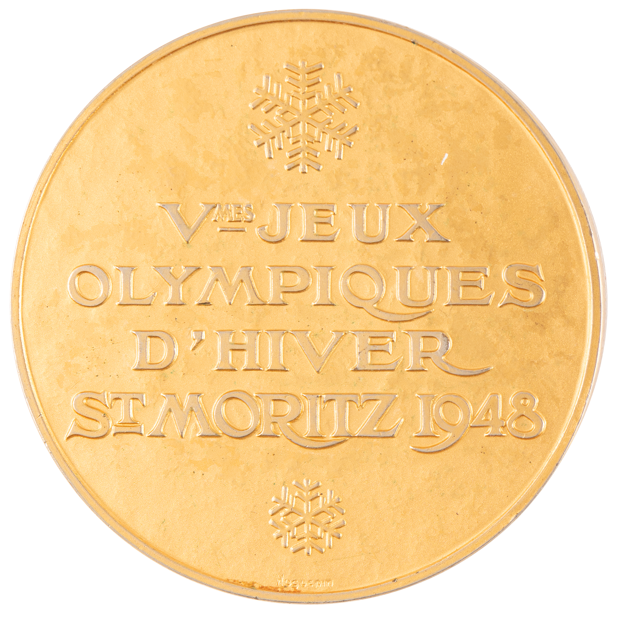 Gold winner's medal created for the St. Moritz 1948 Winter Olympics. Gilt bronze, 60 mm, 98 gm, by Paul Andre Droz. The front depicts a hand holding the Olympic torch against a background with snowflakes and Olympic rings, with motto above, "Citius Altius Fortius"; the reverse features two raised snowflakes and the raised legend, "Vmes Jeux Olympiques D'Hiver St. Moritz 1948." Both sides bear the "Huguenin" mint mark, with the torch side also stamped "Specimen."