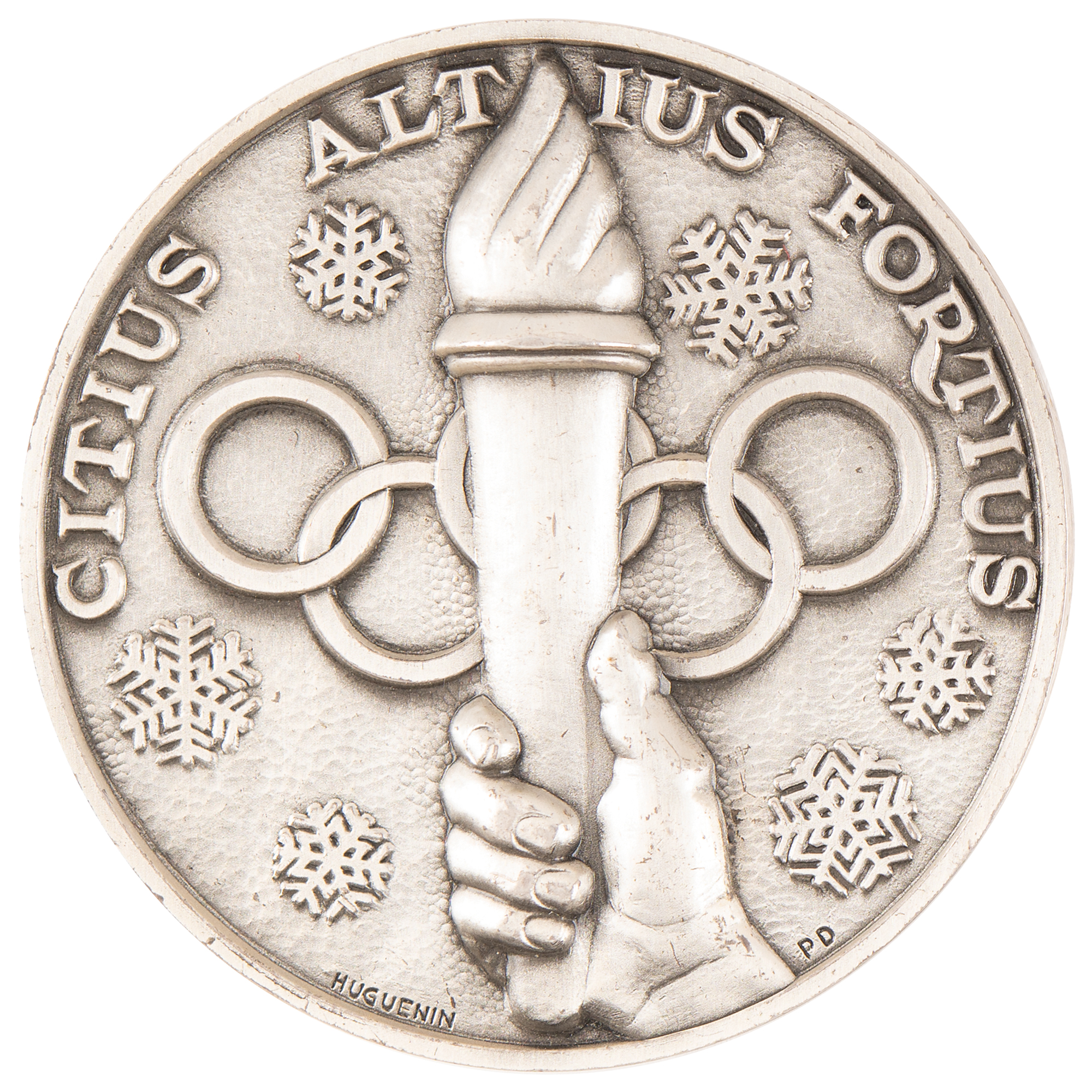 Silver winner's medal created for the St. Moritz 1948 Winter Olympics. Silvered bronze, 60 mm, 98 gm, by Paul Andre Droz. The front depicts a hand holding the Olympic torch against a background with snowflakes and Olympic rings, with motto above, "Citius Altius Fortius"; the reverse features two raised snowflakes and the raised legend, "Vmes Jeux Olympiques D'Hiver St. Moritz 1948." Both sides bear the "Huguenin" mint mark, with the legend side also stamped "Specimen."