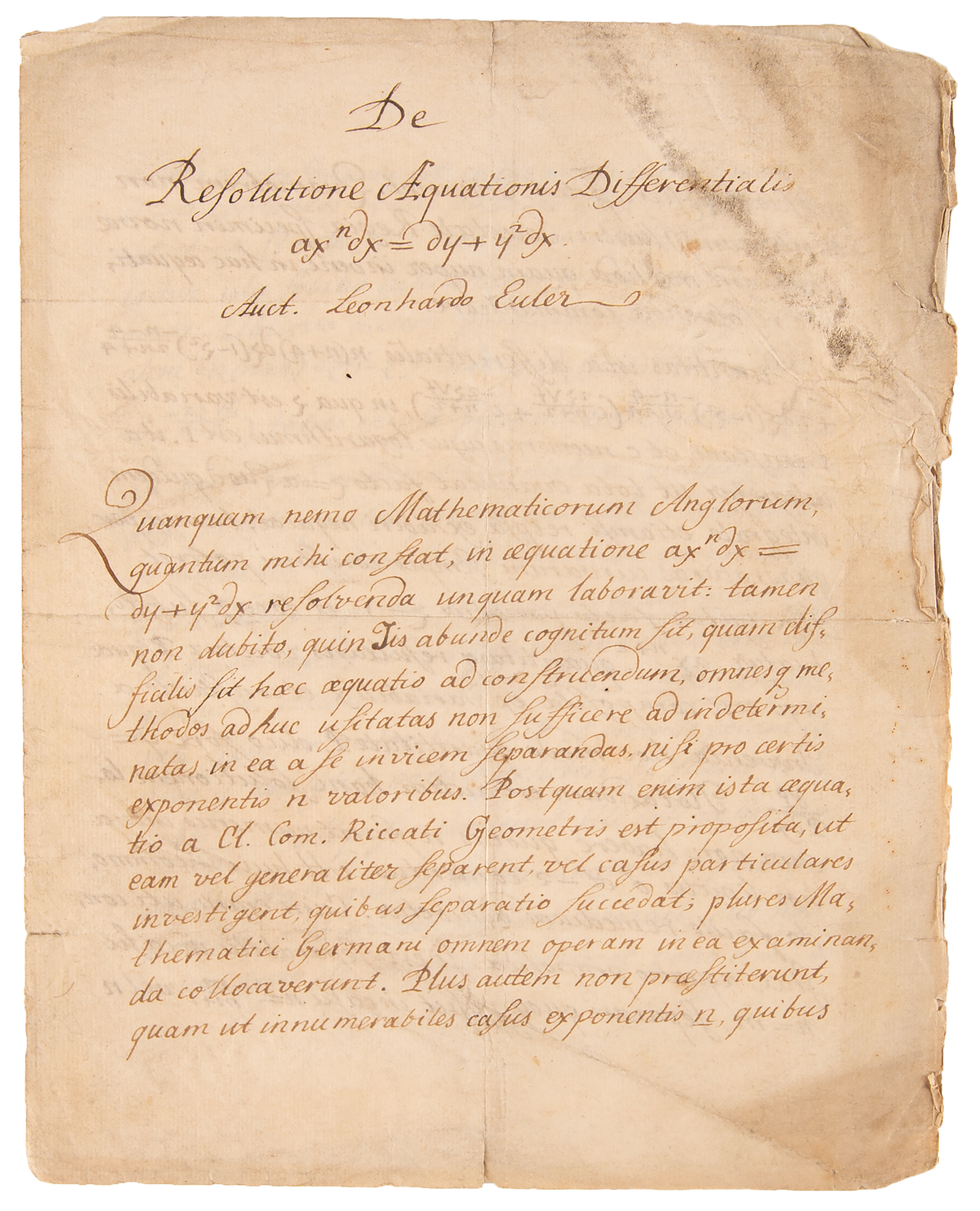 "On the Resolution of the Differential Equation axndx = dy+y²dx"—an incredibly rare mathematical manuscript by Leonhard Euler, a towering figure in modern math