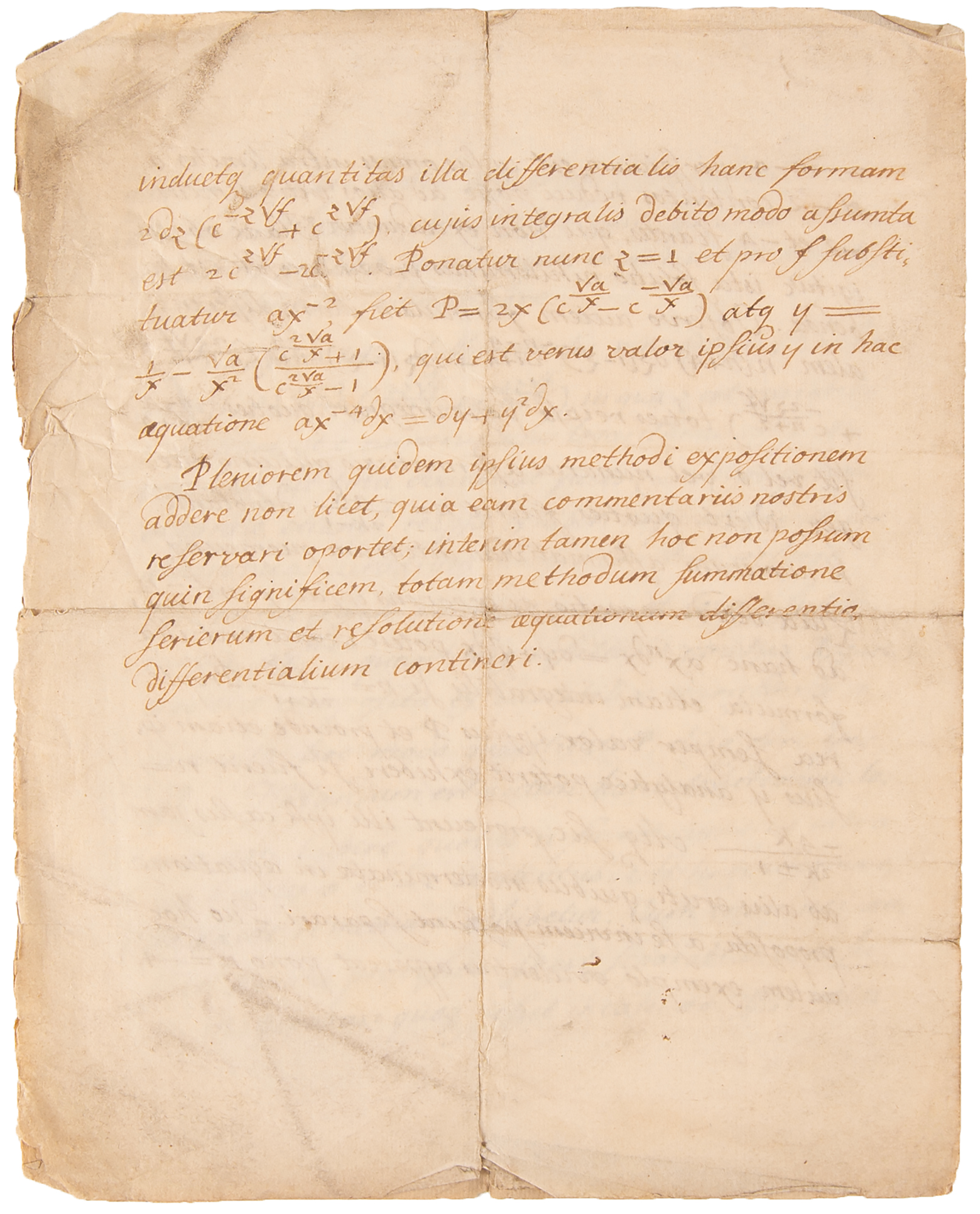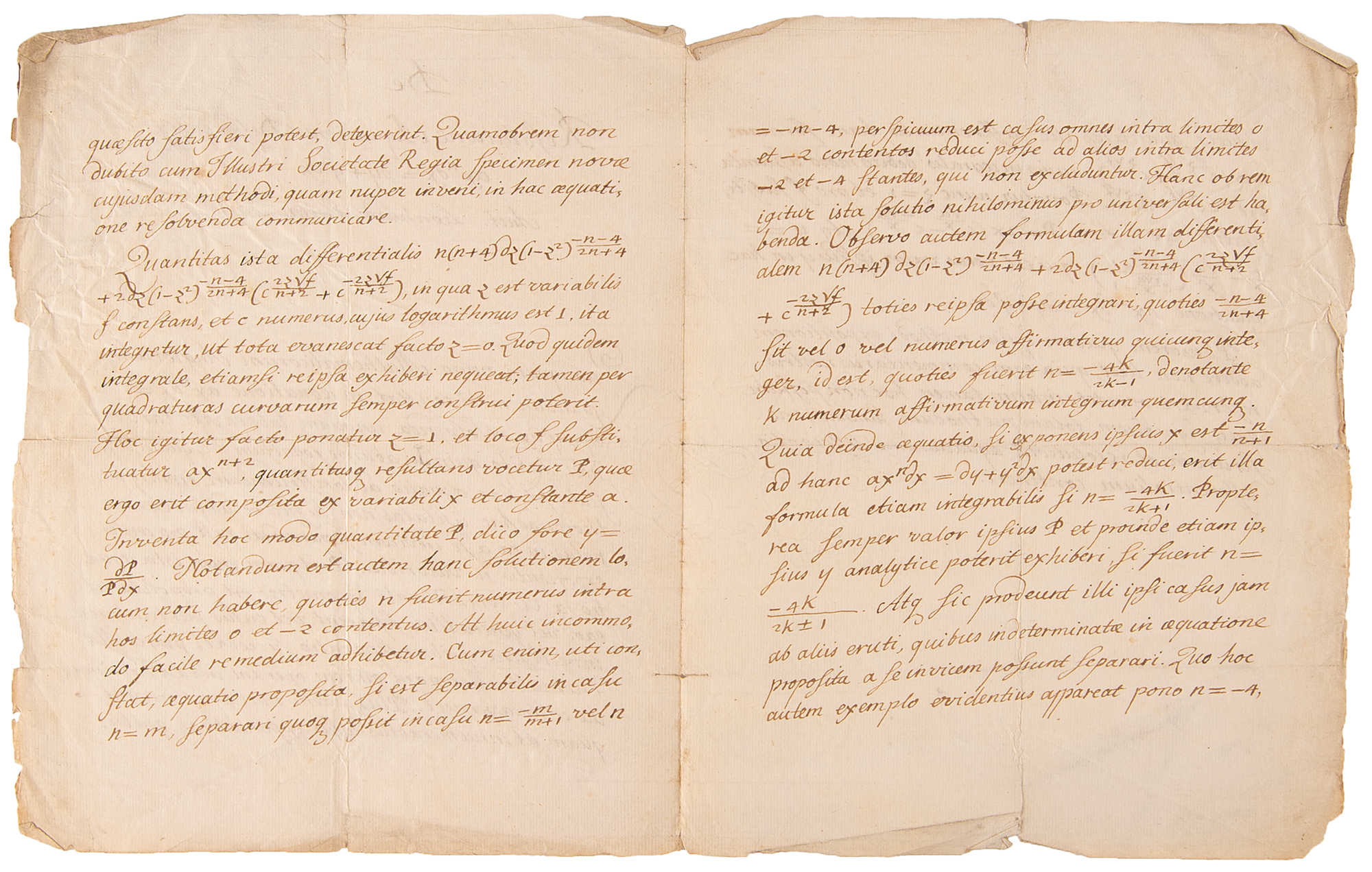 Swiss mathematician and physicist (1707–1783) who founded the studies of graph theory and topology and made pioneering and influential discoveries in many other branches of mathematics; he introduced much of modern mathematical terminology and notation. Autograph manuscript signed in Latin as the author, "Auct. Leonhardo Euler," four pages on two adjoining sheets, 7.5 x 9.25, no date but likely circa 1730s. Untranslated handwritten manuscript entitled "De Resolutione Aquationis Differentialis axndx = dy+y2dx [On the Resolution of the Differential Equation axndx = dy+y2dx]." Euler pens the mathematical manuscript in his typically neat Latin, carefully written for interpretation by a typesetter. In very good to fine condition, with overall light creasing and minor fold splits, soiling to the first page, and wear to the edges which does not affect any of the handwriting.