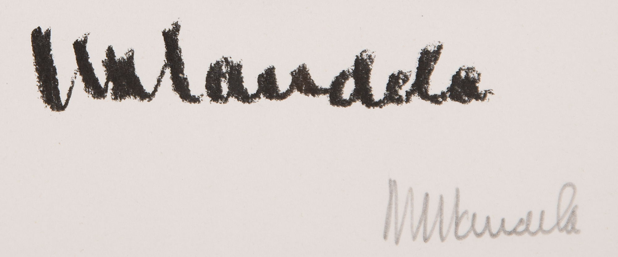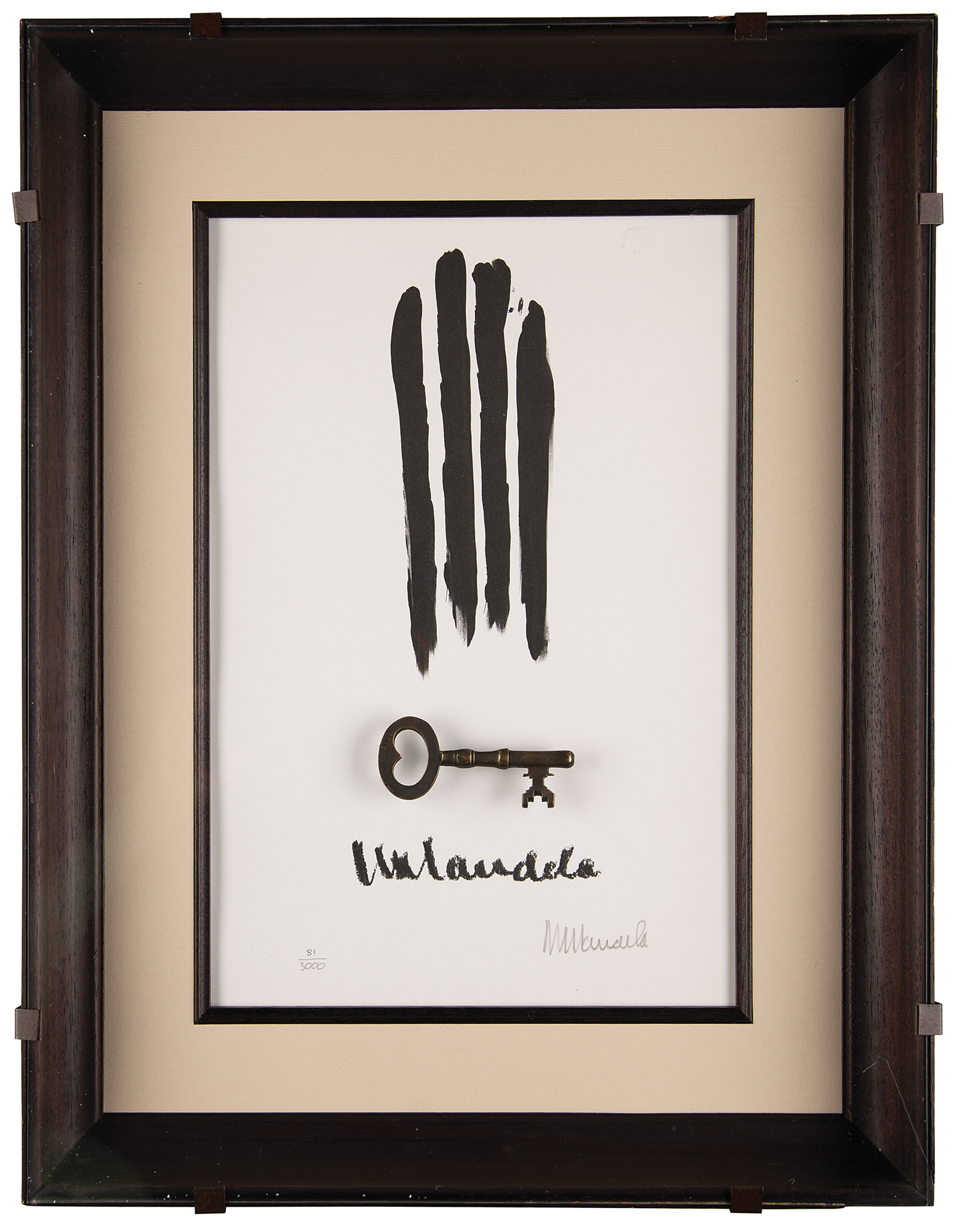 Highly sought limited edition 10.5 x 16 lithograph by Nelson Mandela entitled ‘Key & Bars,’ which depicts four dark vertical lines representing the bars of his prison cell at Robben Island above a cast replica of a cell key, both the key and the lithograph are numbered 81/3000, with the latter signed neatly in pencil, “N. Mandela,” below a larger black paint facsimile. The lower left corner bears Mandela’s official embossed ‘clasped hands’ blindstamp. Handsomely matted in a shadowbox frame to an overall size of 17.5 x 23 x 2.5. In fine condition. A simple yet powerful work that symbolizes Mandela’s 27 years of incarceration—a desirable low-number example of this coveted edition and the first to be made available to the public; the first five lithographs were presented to members of the Mandela family.