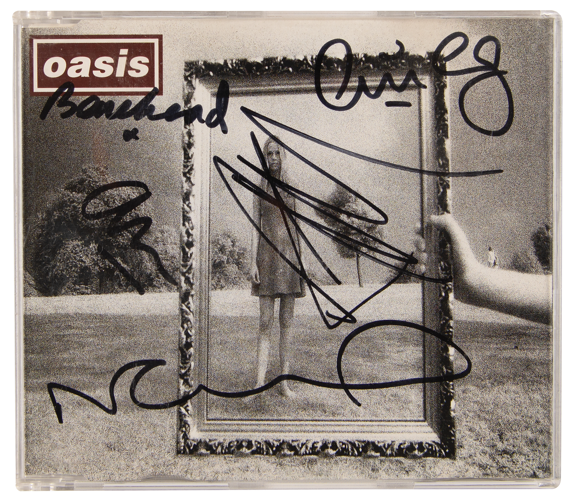CD for the Oasis single ‘Wonderwall,’ signed on the front cover in black felt tip by Liam Gallagher, Noel Gallagher, Paul “Bonehead” Arthurs, Paul “Guigsy” McGuigan, and Alan White. In fine condition, with a couple of light creases. The CD is included.