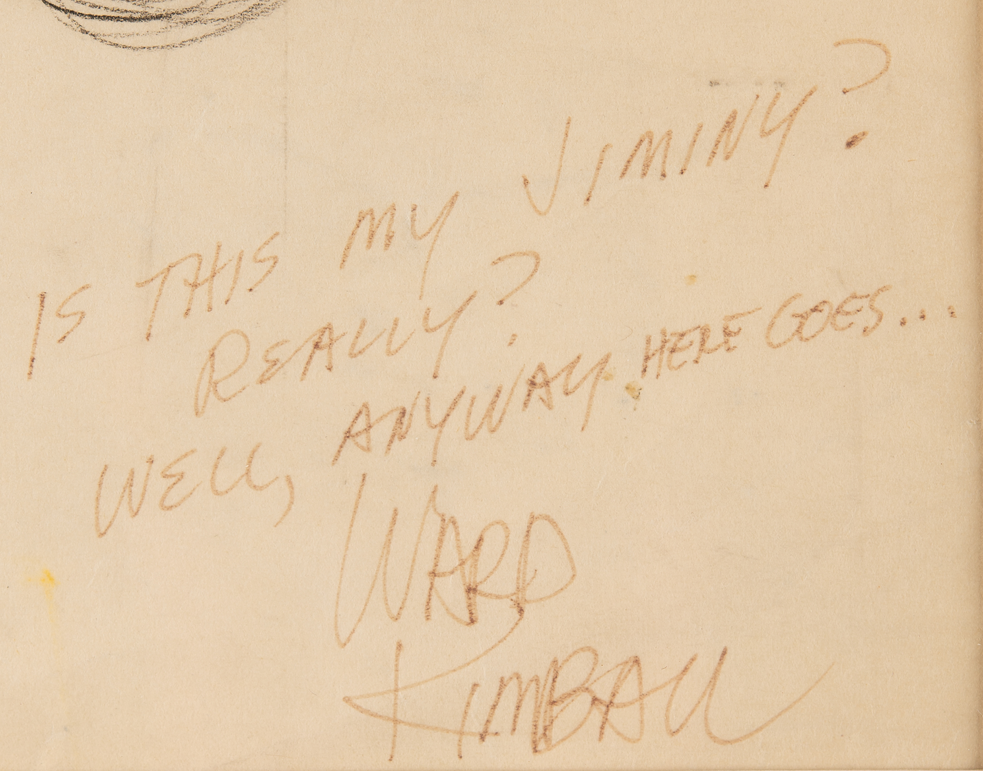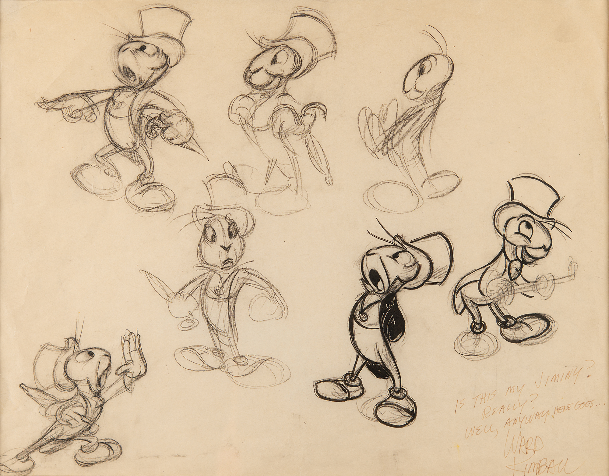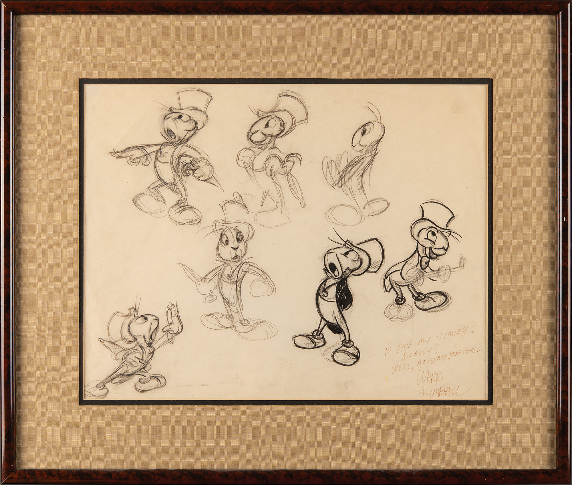 (Walt Disney Studios, 1940) Original model sheet drawing of Jiminy Cricket from Pinocchio, which features seven full-figure poses of the good-hearted bug in various states of emotion, signed in the lower right in black ink, “Is this my Jiminy? Really? Well, anyway, here goes…Ward Kimball.” Accomplished in ink and graphite on 14.75 x 11.75 animation paper. Cloth-matted and framed to an overall size of 21.25 x 18. In fine condition. An outstanding animator's model sheet of Jiminy Cricket, attributed to the hand of the great Ward Kimball.