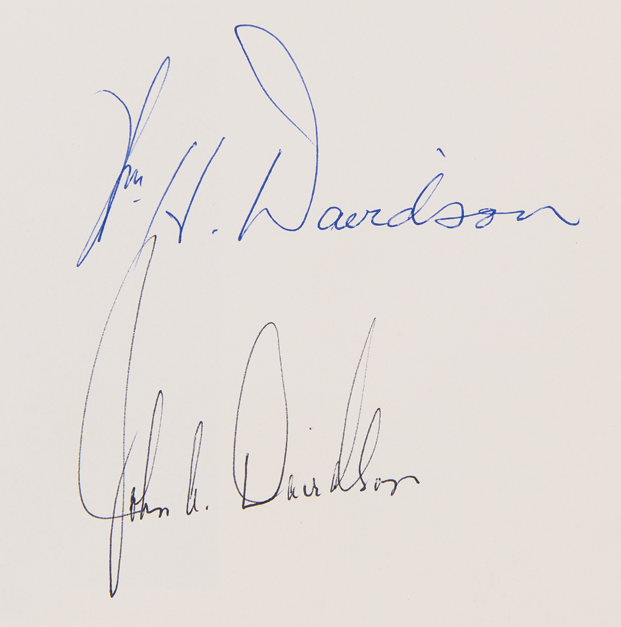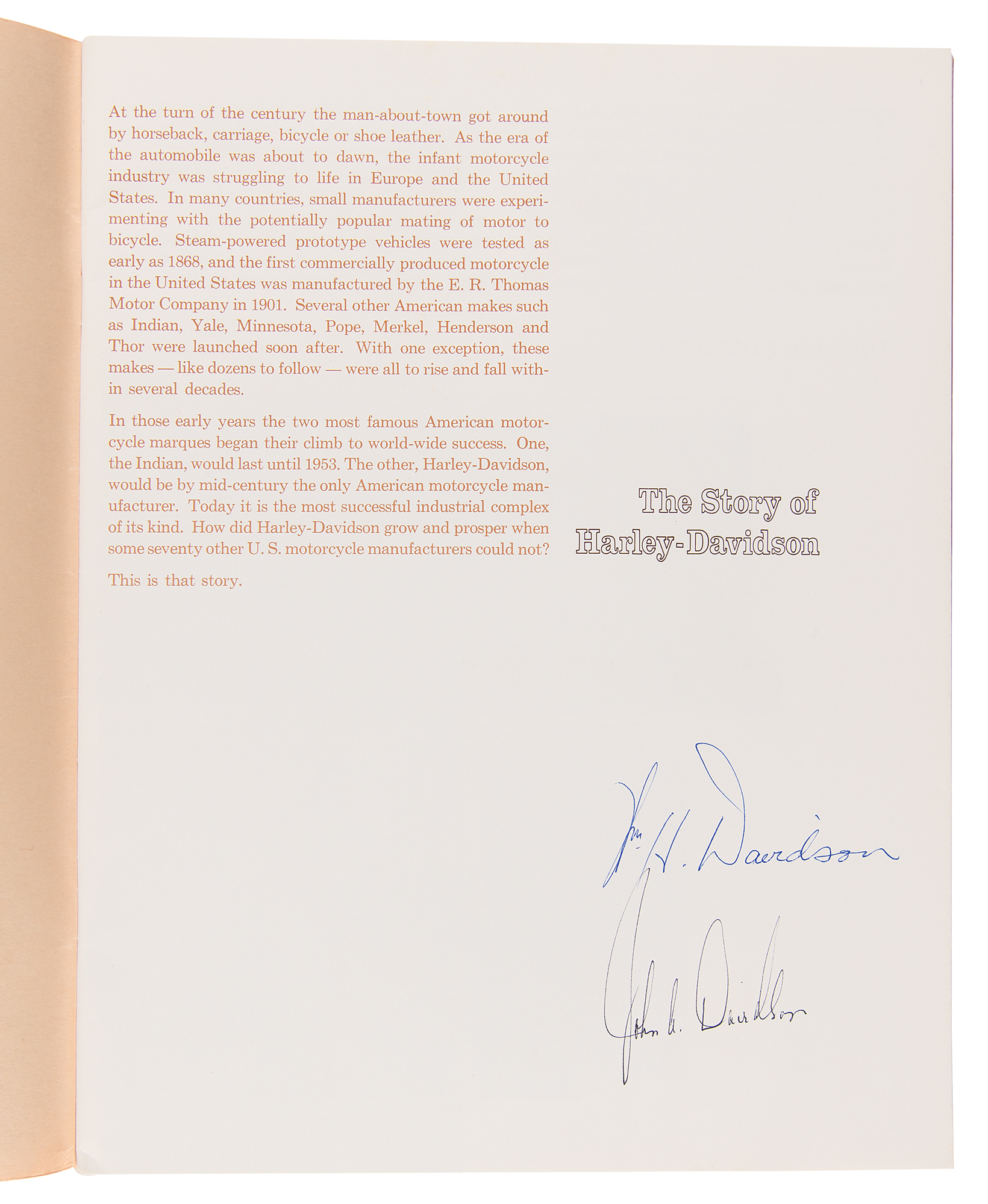 Signed book: The Story of Harley-Davidson. [1970s] Softcover, 8.5 x 11, 55 pages. Signed on the introduction page in blue ballpoint by William H. Davidson and in black ballpoint by John A. Davidson. In fine condition. An uncommon vintage publication signed by both John and William Davidson, who both served as longtime presidents of the iconic company, from the 1940s through the 1970s.