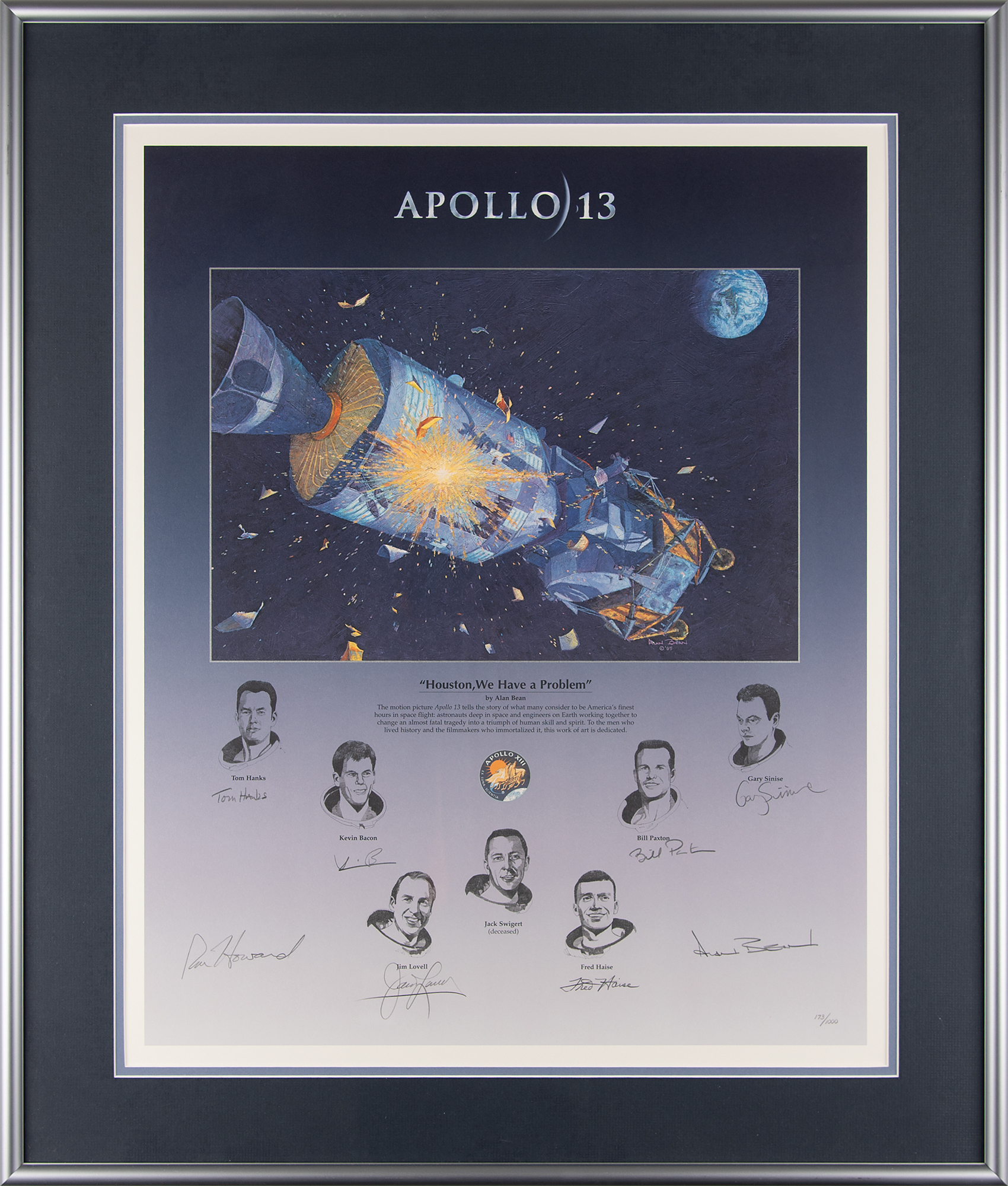 Limited edition color 19 x 23.5 print of an Alan Bean painting entitled 'Houston, We Have a Problem,' which depicts the moment an oxygen tank on the Apollo 13 service module exploded, numbered 173/1000, signed in pencil by James Lovell, Fred Haise, and Alan Bean, as well as by actors Tom Hanks, Bill Paxton, Kevin Bacon, Gary Sinise, and the director of Apollo 13, Ron Howard. Double-matted and framed to an overall size of 27.75 x 30.5. In very fine condition. A vivid combination of the astronauts who experienced the Apollo 13 malfunction and of those who recreated their inspiring story.