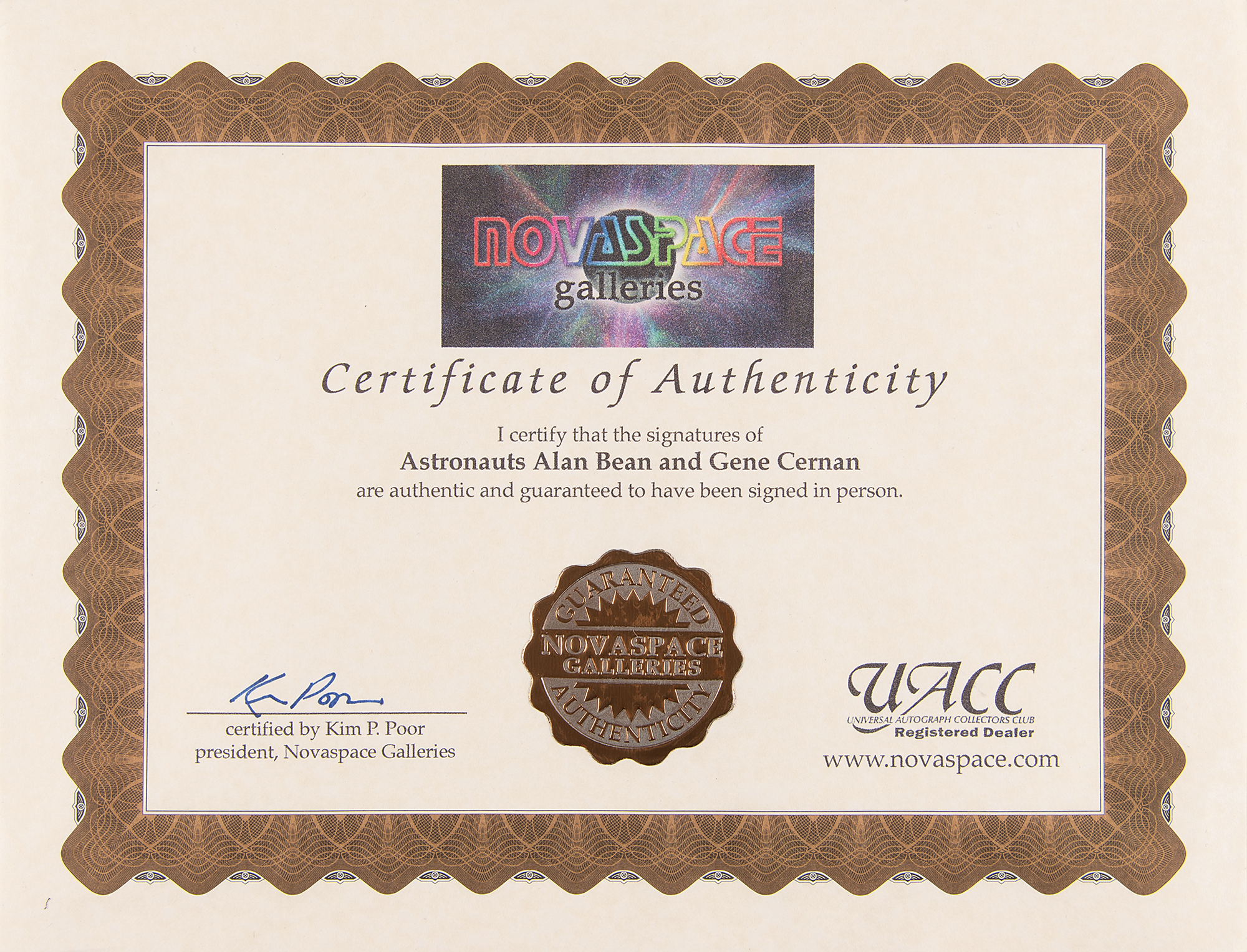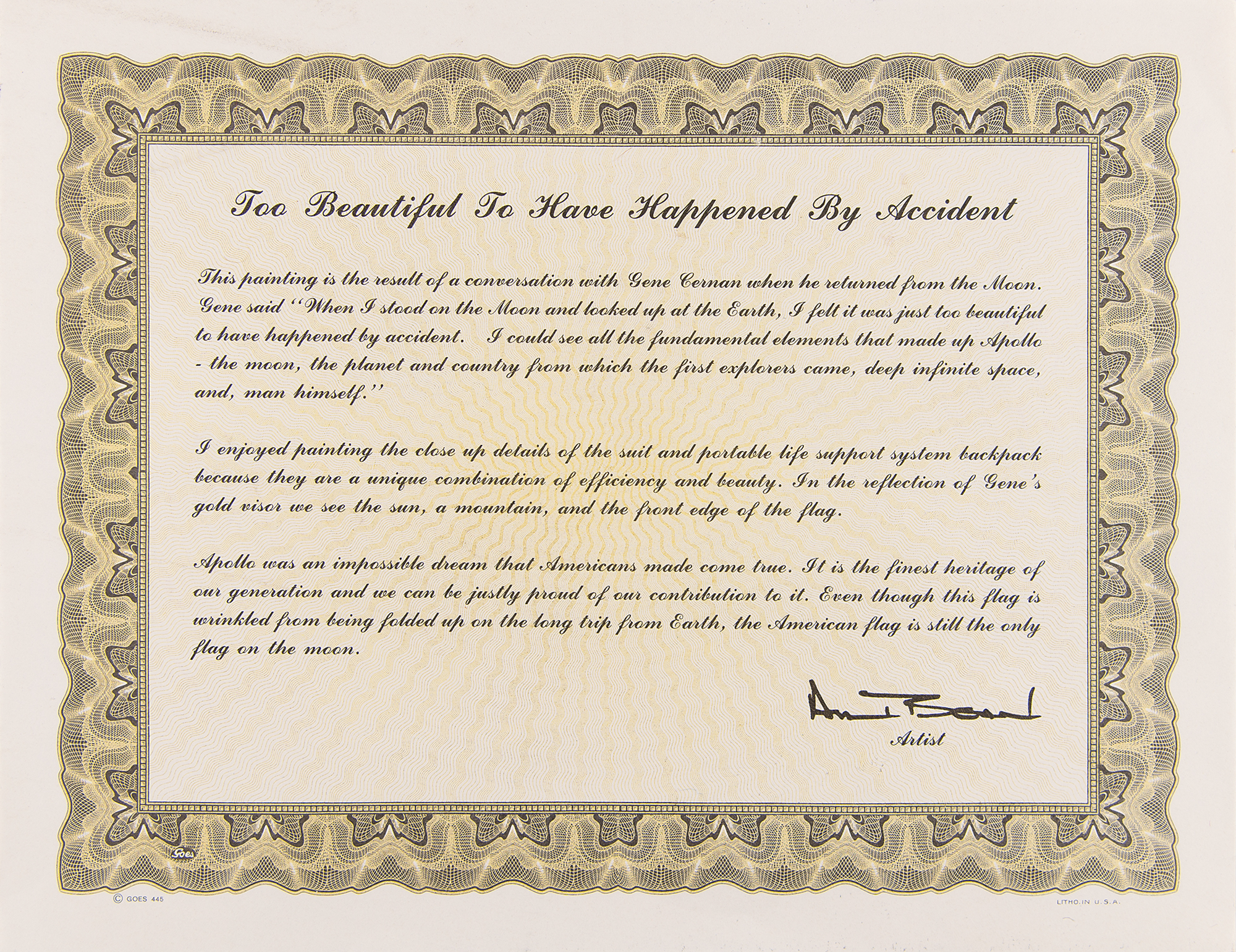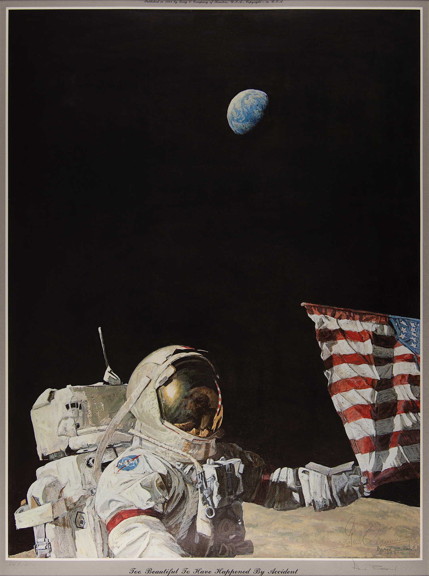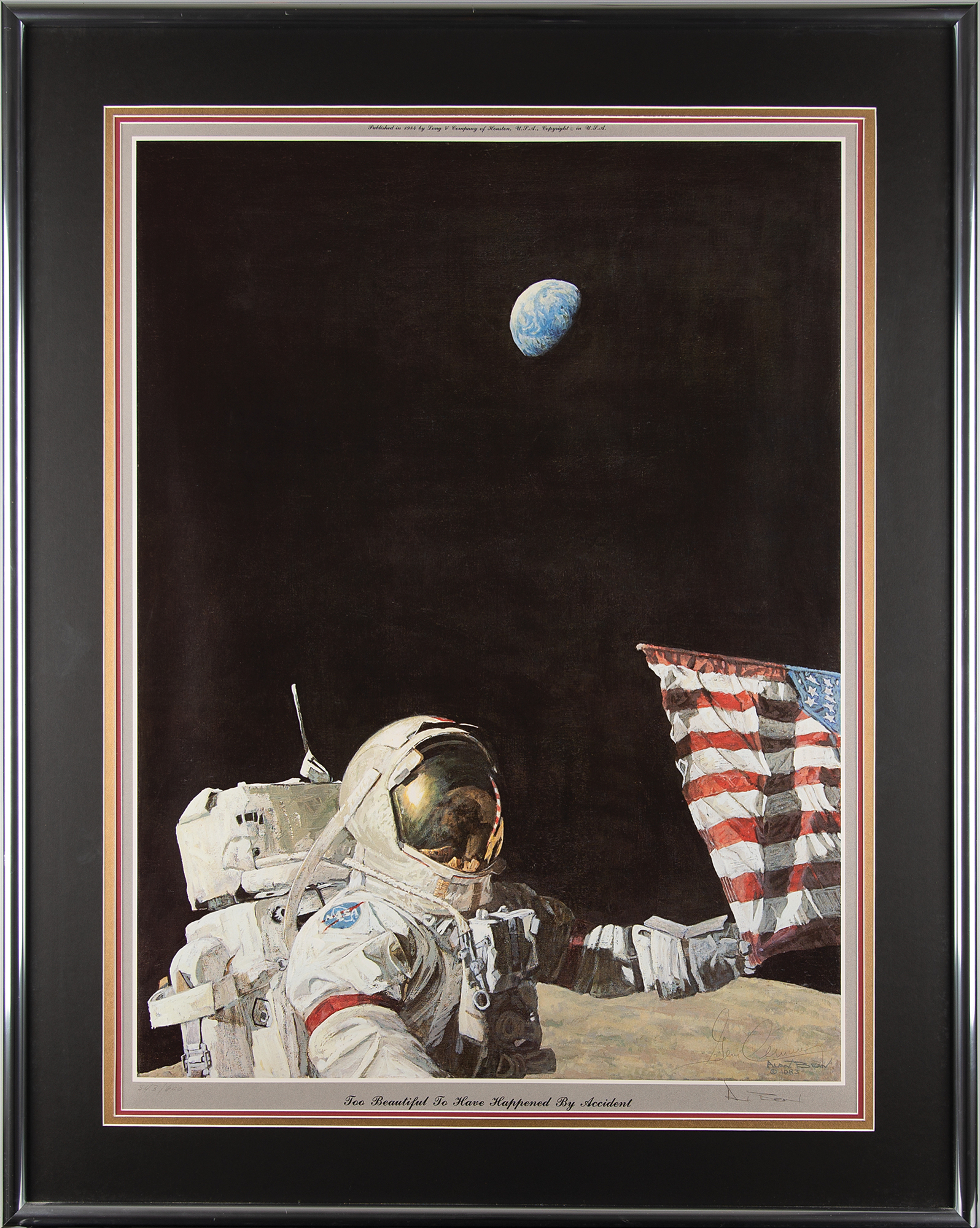 Limited edition color 23.5 x 31.5 lithograph of an Alan Bean painting entitled 'Too Beautiful to Have Happened by Accident,' numbered 543/600, signed in the lower right corner in pencil by moonwalkers Alan Bean and Gene Cernan. The artwork shows Cernan holding the American flag with the Earth in the distance, the sun glinting off his visor. Triple-matted and framed to an overall size of 31 x 39.5. In very fine condition.