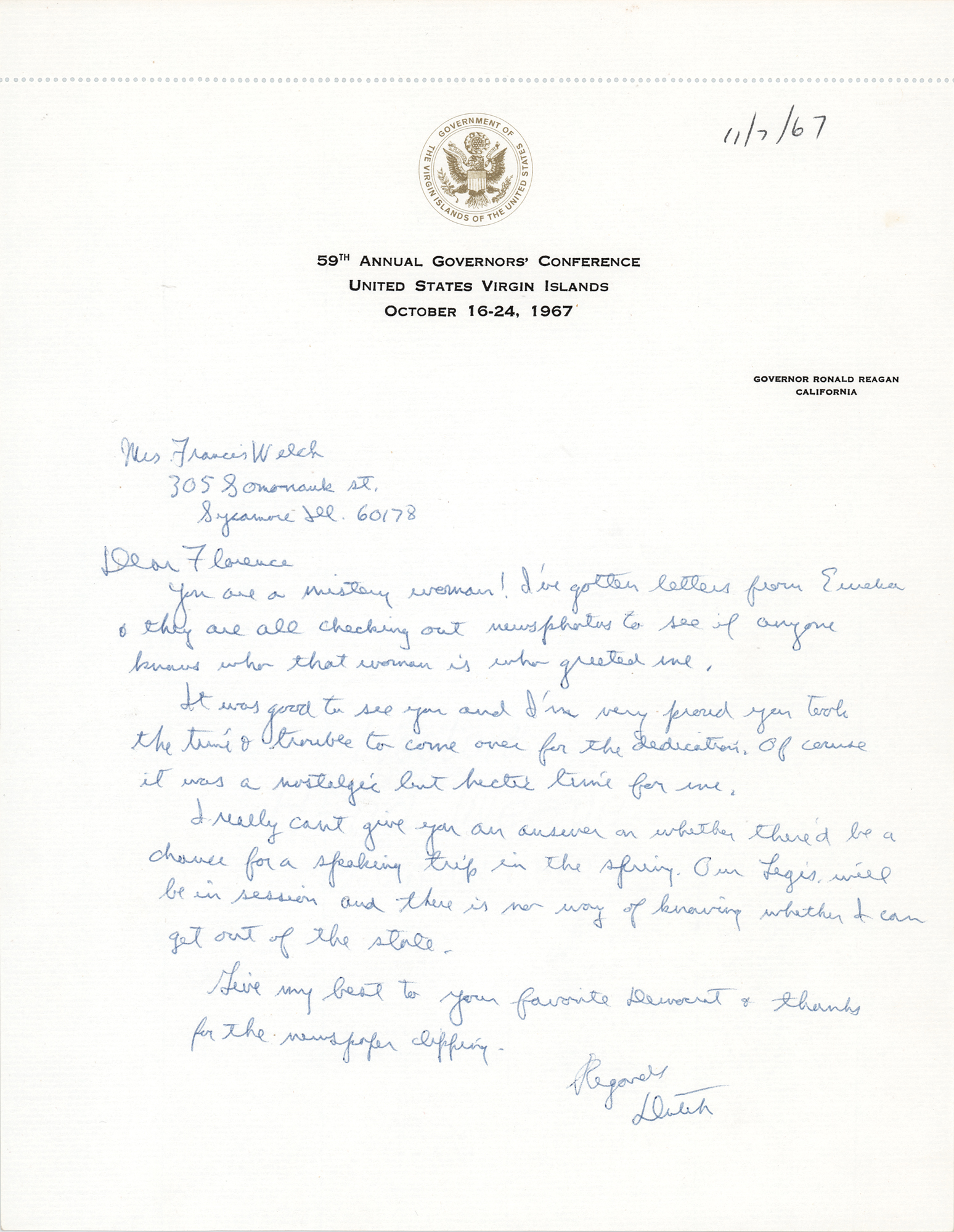 ALS signed “Dutch,” one page, 8.5 x 11, 59th Annual Governors' Conference letterhead, November 7, 1967. Handwritten letter to Florence Welch of Sycamore, Illinois, in full: "You are a mistery woman! I've gotten letters from Eureka & they are all checking out news photos to see if anyone knows who that woman is who greeted me. It was good to see you and I'm very proud you took the tie & trouble to come over for the dedication. Of course it was a nostalgic but hectic time for me. I really can't give you an answer on whether there'd be a chance for a speaking trip in the spring. Our Legis. will be in session and there is no way of knowing whether I can get out of the state. Give my best to your favorite Democrat & thanks for the newspaper clipping." In very fine condition. Governor Reagan had given a speech to dedicate the Melick Library building at his alma mater, Eureka College, in September 1967.