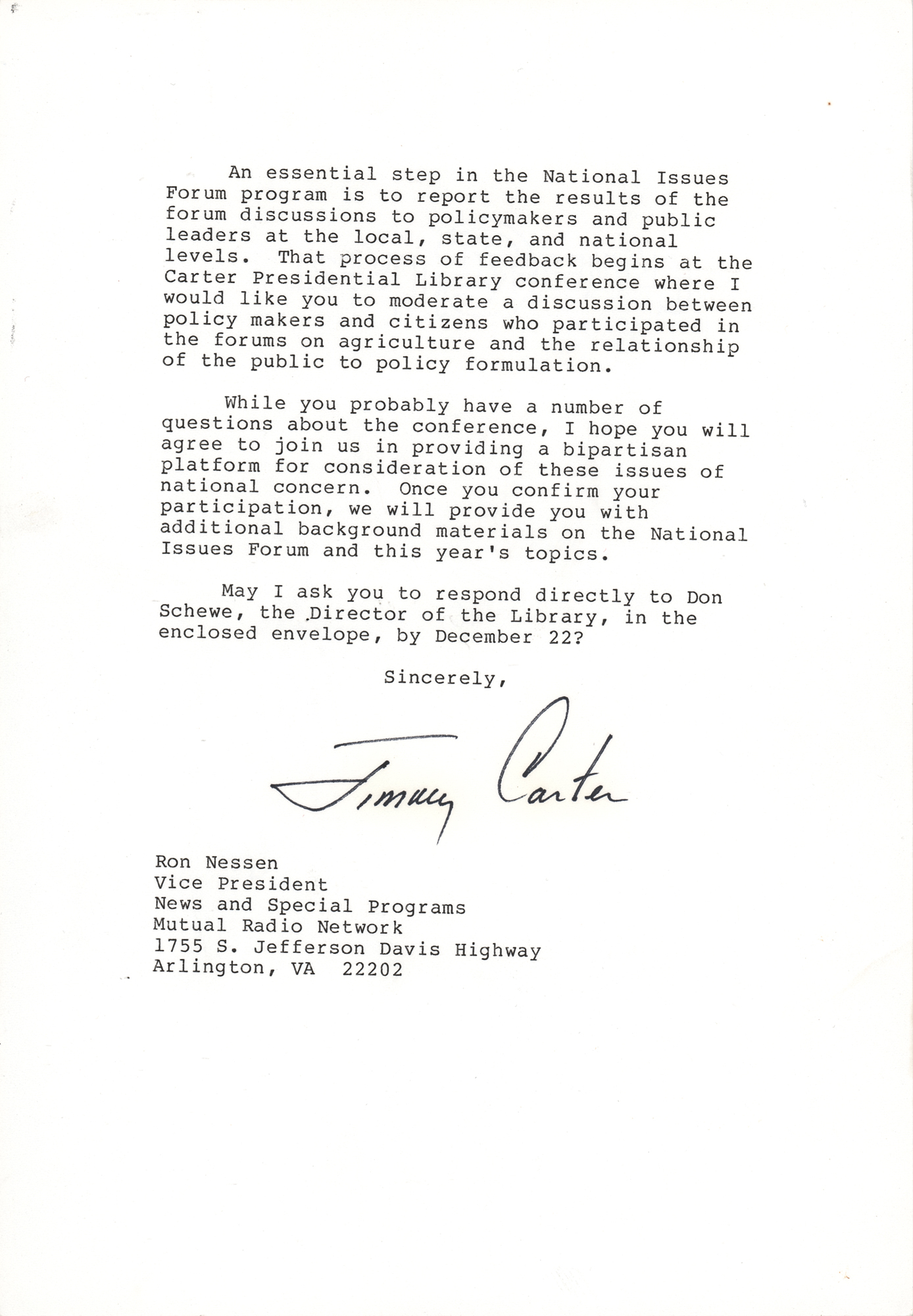 TLS, two pages, 7.25 x 10.5, personal letterhead, December 9, 1986. Letter to Ron Nesen, vice president of news and special programs for the Mutual Radio Network, in part: "I am writing to invite you to participate with me in the Fifth Presidential Library Conference on the Public and Public Policy to be held at the Carter Presidential Center in Atlanta…Under the leadership of David Mathews, president of the Kettering Foundation, and Daniel Yankelovich, president of the Public Agenda Foundation, National Issues Forum is a national, nonpartisan network that conducts an annual series of forums, similar to town meetings, on public issues of national concern. Simply stated, the goal is to work toward common understandings through community discussion and then communicate those understandings to public officials…This fall and winter the National Issues Forum will convene more than 600 meetings with citizens all across the country to discuss this year's three topics: The Farm Crisis: Who's in Trouble, How to Respond; Immigration: What We Promised, Where to Draw the Line; Crime: What We Fear, What Can Be Done.