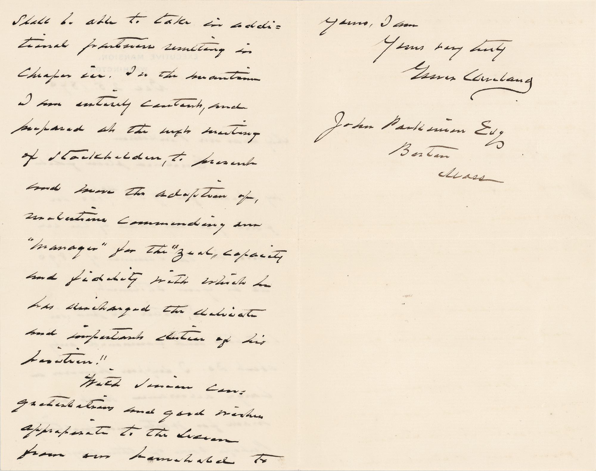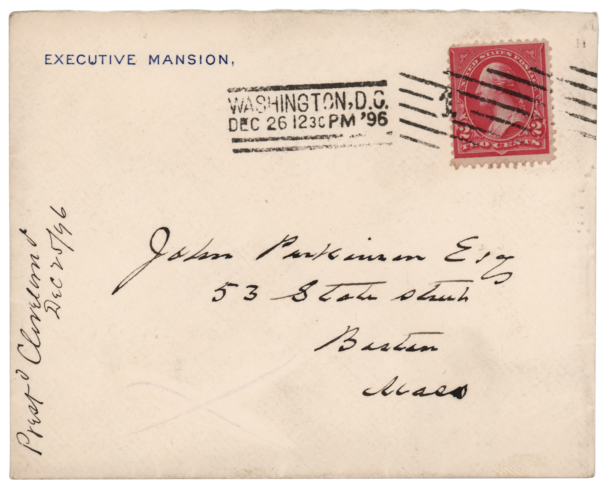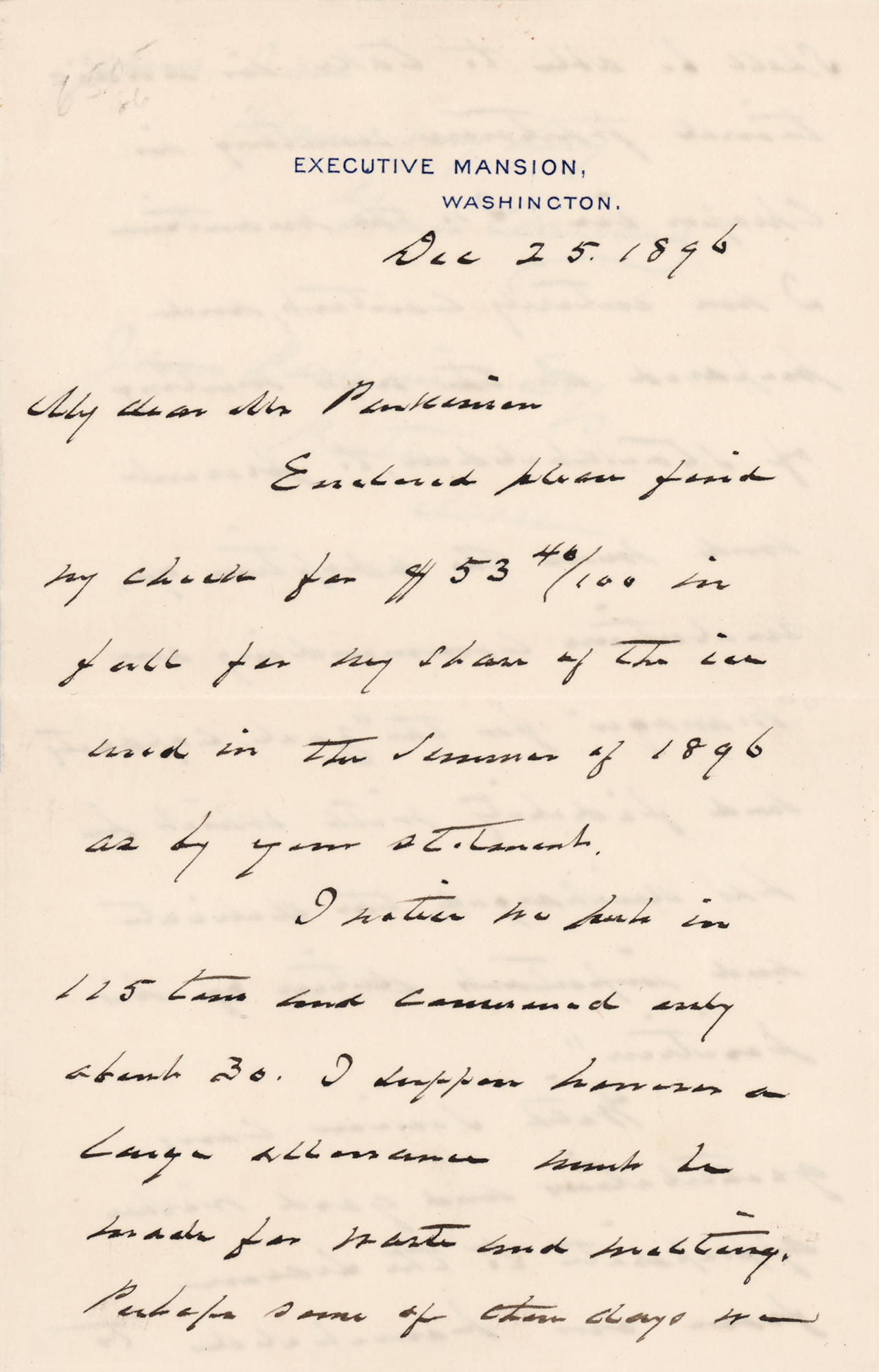 ALS as president, three pages on two adjoining sheets, 4.5 x 7, Executive Mansion letterhead, December 25, 1896. Handwritten letter to James Parkinson of Boston, paying for his share of the ice used at his summer home at Buzzards Bay. In full: "Enclosed please find my check for $53 40/100 in full for my share of the ice in the Summer of 1896 as by your statement. I notice we put in 115 tons and consumed only about 30. I suppose however a large allowance must be made for waste and melting. Perhaps some of these days we shall be able to take in additional partners resulting in cheaper ice. In the meantime I am entirely content, and prepared at the next meeting of Stockholders, to present and move the adoption of, resolutions commending our 'manager' for the zeal, capacity and fidelity with which he has discharged the delicate and important duties of his position. With sincere congratulations and good wishes appropriate to the Season from our homestead to yours." In fine condition. Accompanied by the original mailing envelope, addressed in Cleveland's own hand.