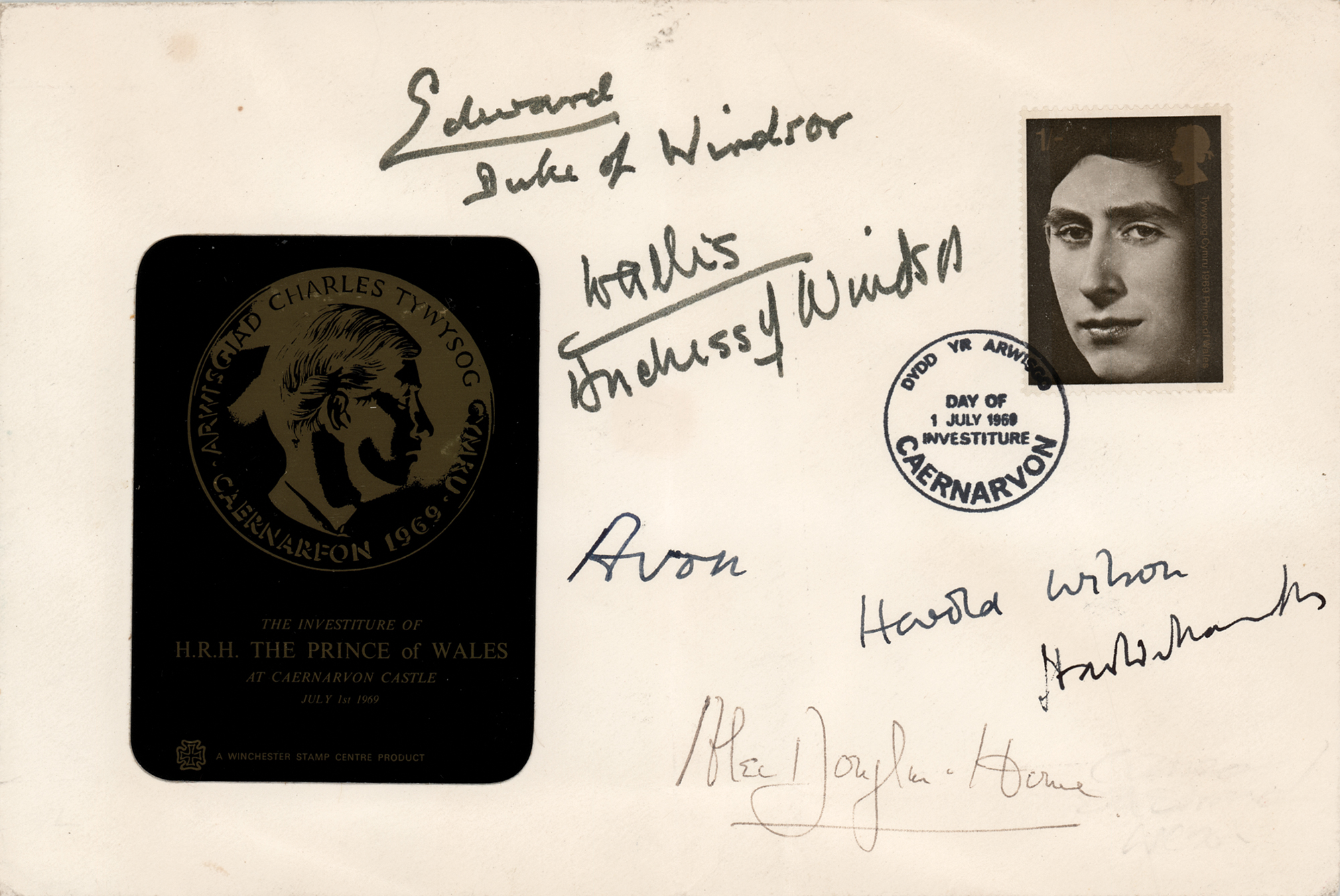 Commemorative cover with a cachet honoring the investiture of H.R.H. The Prince of Wales, signed in ink, "Edward, Duke of Windsor" and "Wallis, Duchess of Windsor." Also signed by four prime ministers: Anthony Eden, Lord Avon; Alec Douglas-Home; Harold Wilson; and Harold Macmillan. In very good to fine condition, with light creasing.