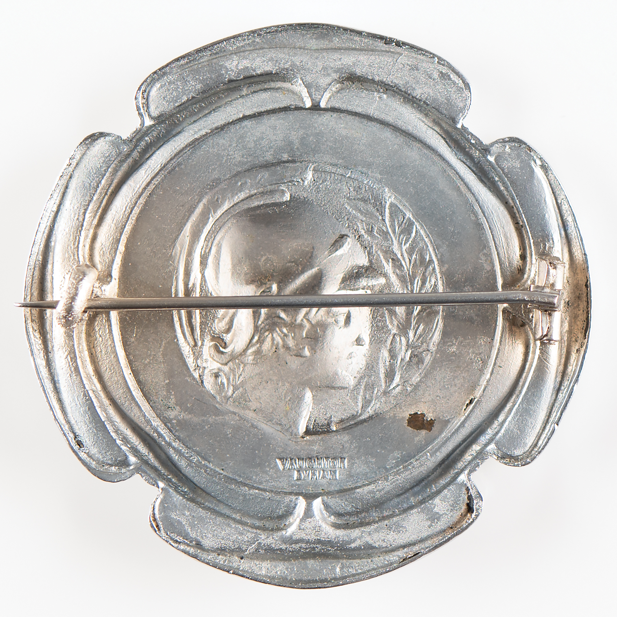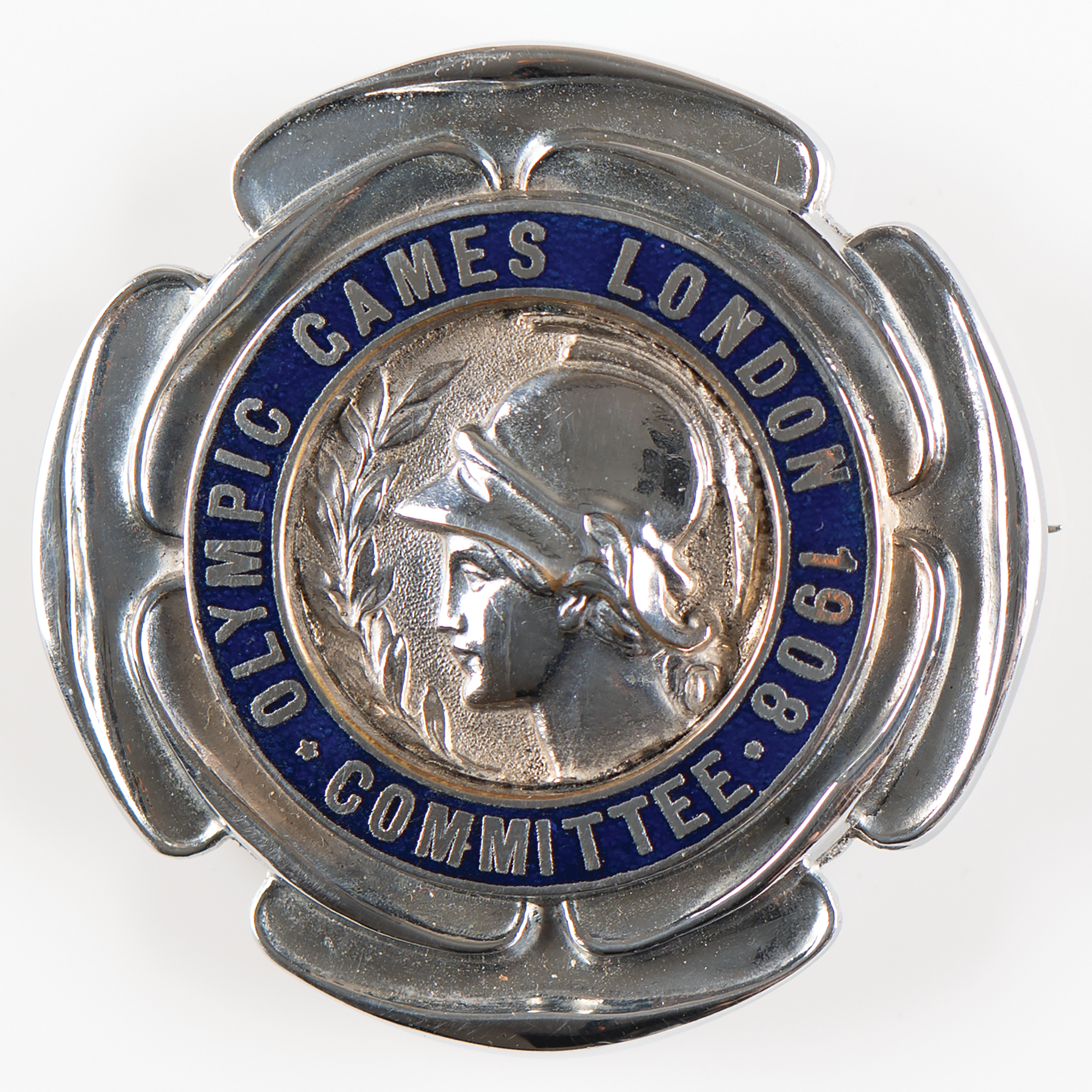 Scarce ‘Committee’ badge from the London 1908 Olympics. Silvered bronze, 42 gm, 57 mm in diameter, stamped on the reverse with a Vaughton of Birmingham maker's mark. The badge depicts the head of Athena facing a laurel branch and encircled by a dark blue enameled border with the text, "Olympic Games London 1908, Committee." A bright and beautiful badge from an Olympic Games that extended for over six months—the longest in modern history.