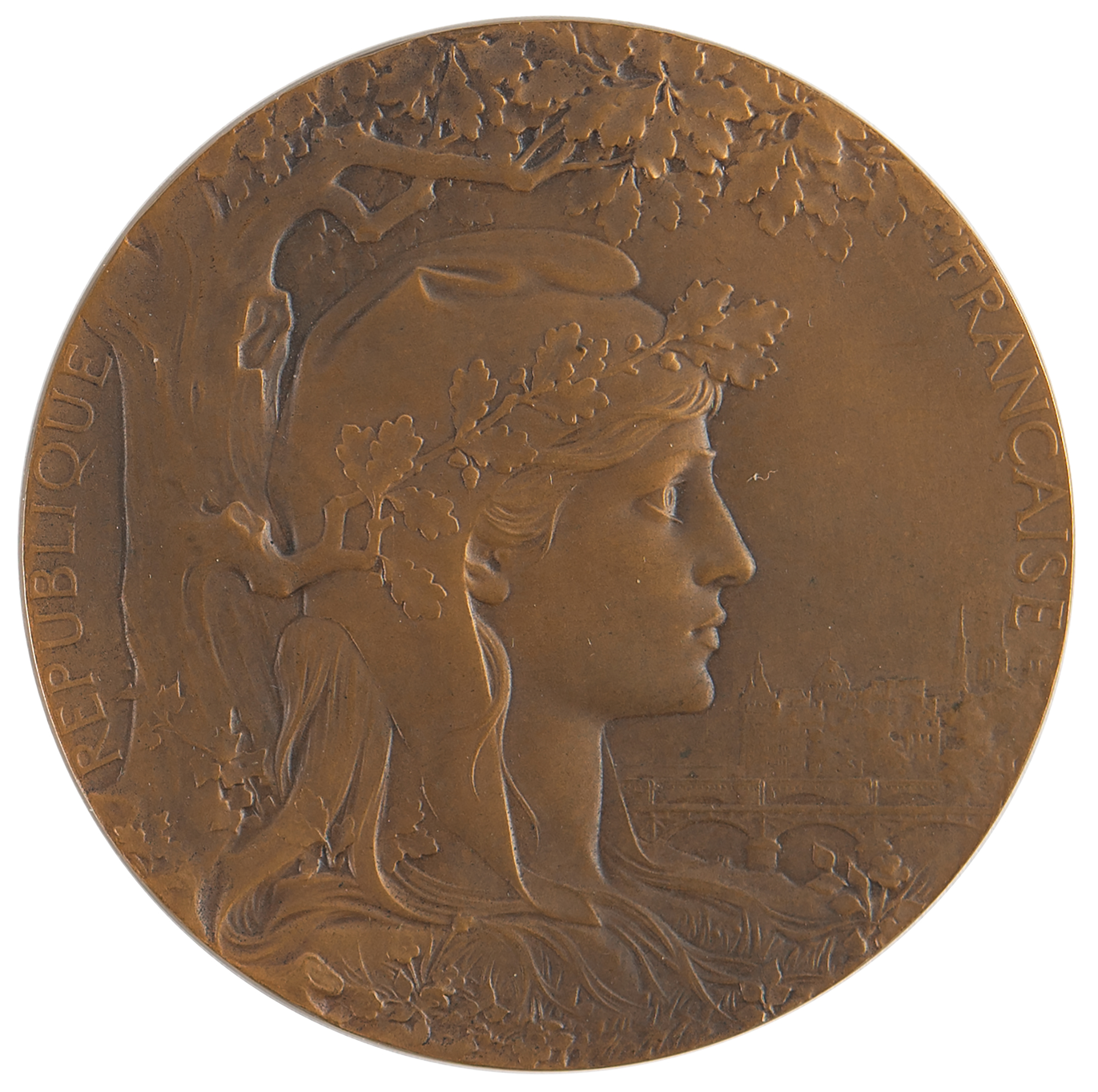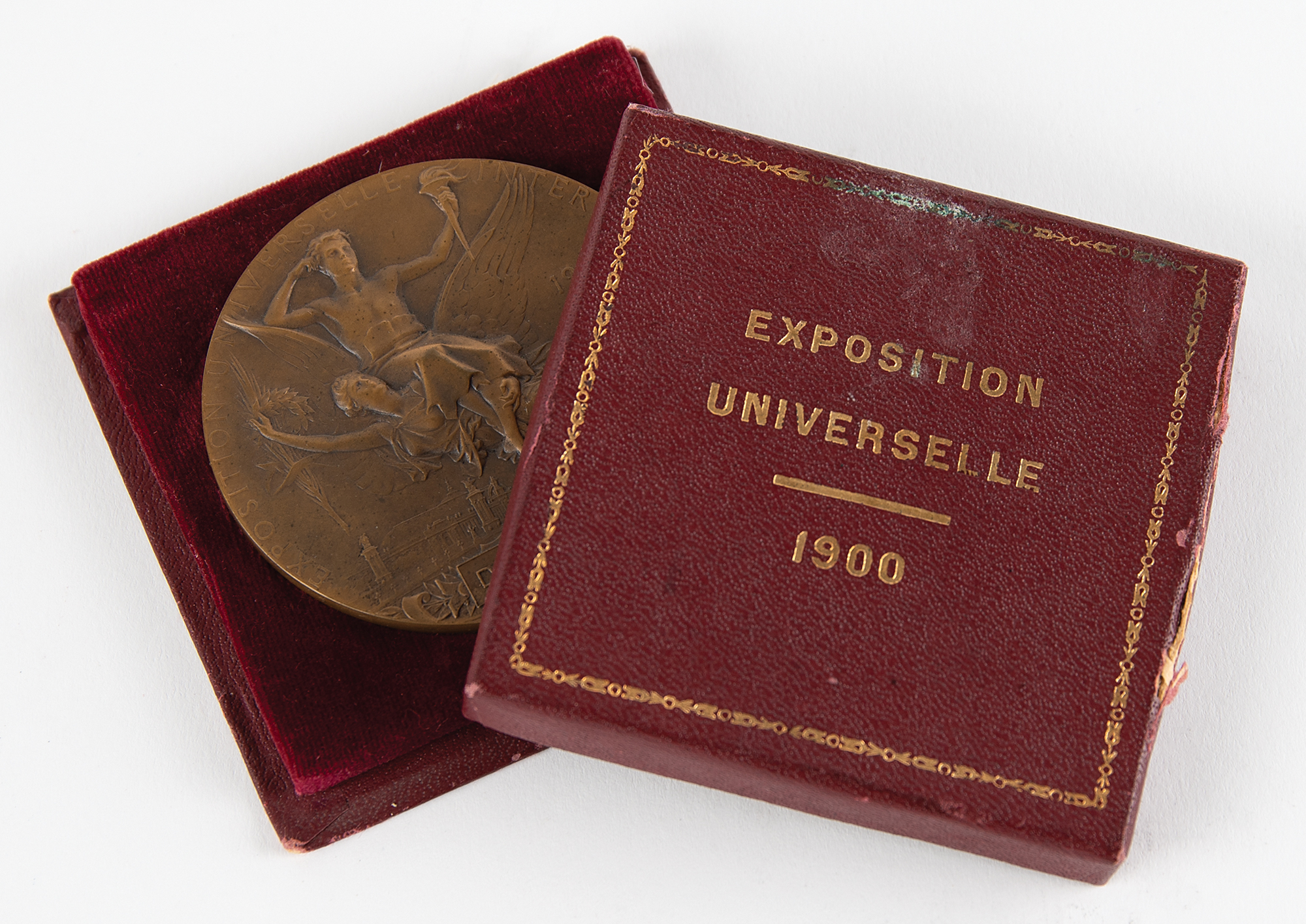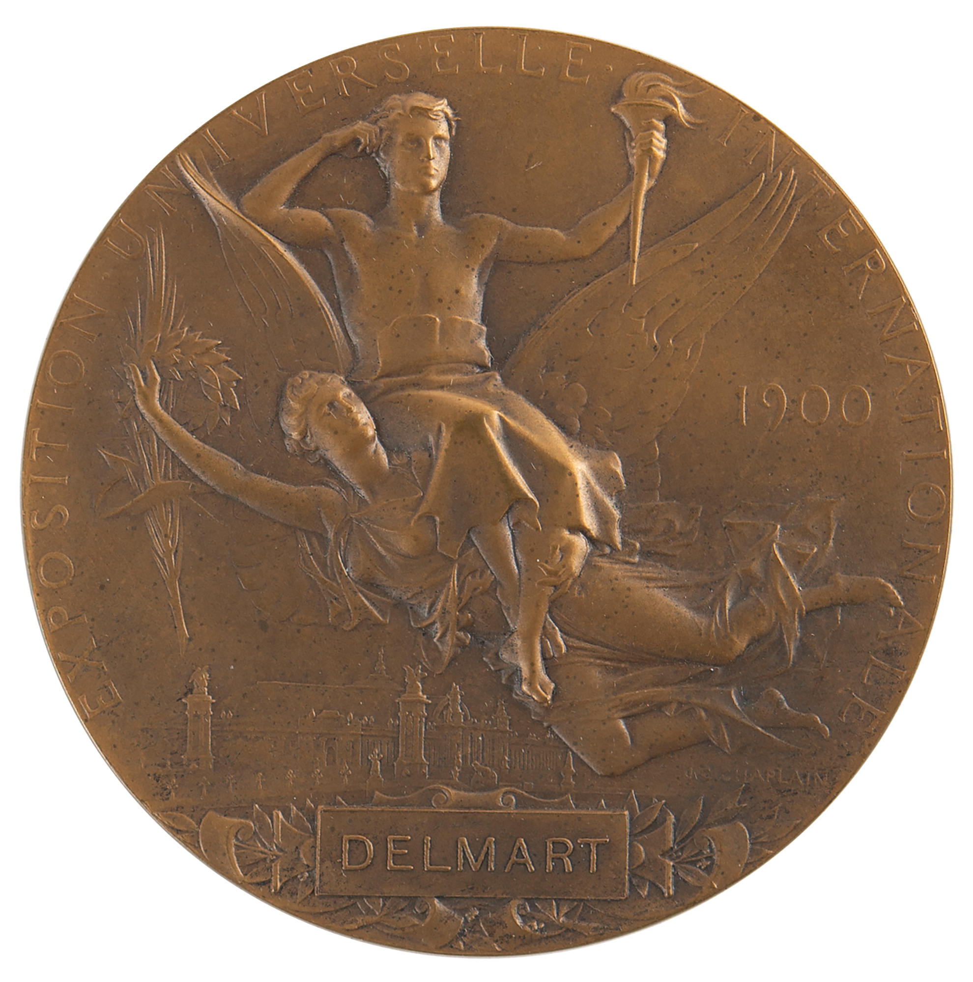Commemorative medal issued for the Paris 1900 Exposition Universelle, which played host to that year's Summer Olympics. Bronze, 63 mm, 103 gm, by J. C. Chaplain. The front depicts the head of France in a Phrygian bonnet with the Paris skyline to the right; the reverse features the winged figure of Victory, holding a laurel wreath and a palm branch and carrying a winner on her back, above a cartouche with raised text: “Delmart.” The edge is stamped “Bronze.” Includes its "Exposition Universelle, 1900" cardboard box, with its lid detached but present.