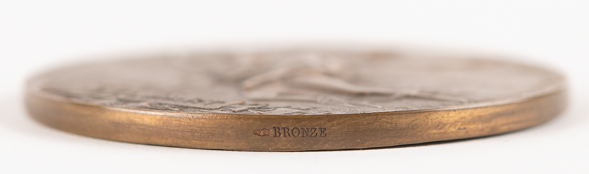 Commemorative medal issued for the Paris 1900 Exposition Universelle, which played host to that year's Summer Olympics. Bronze, 63 mm, 103 gm, by J. C. Chaplain. The front depicts the head of France in a Phrygian bonnet with the Paris skyline to the right; the reverse features the winged figure of Victory, holding a laurel wreath and a palm branch and carrying a winner on her back, above a cartouche with raised text: “Delmart.” The edge is stamped “Bronze.” Includes its "Exposition Universelle, 1900" cardboard box, with its lid detached but present.
