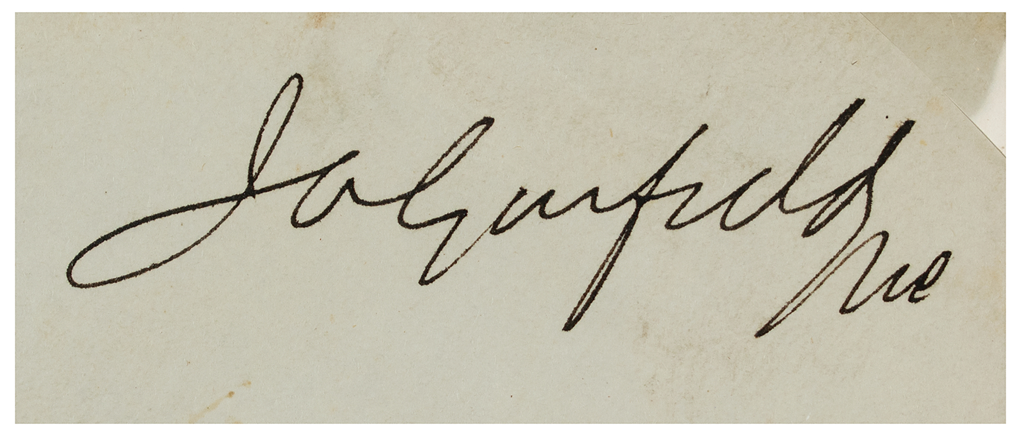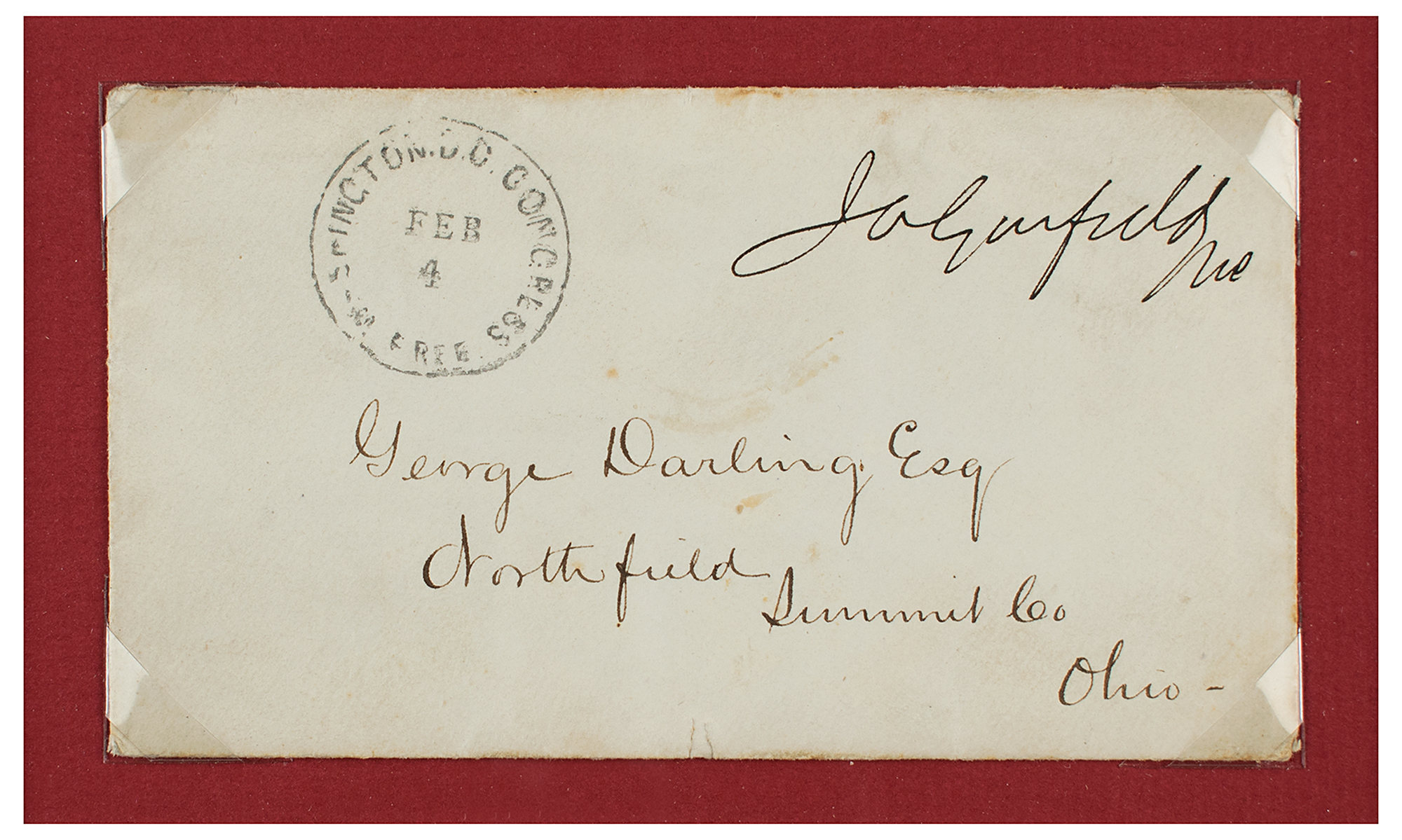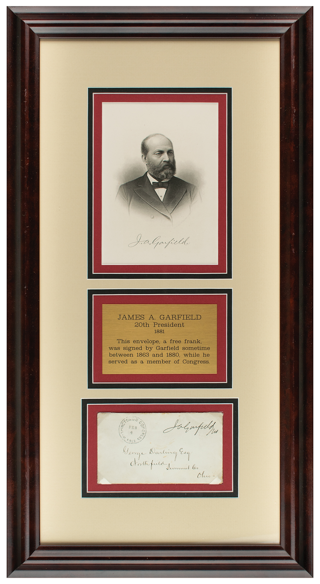 Free-franked mailing envelope, 5.25 x 3, addressed in another hand to "George Darling Esq, Northfield, Summit Co., Ohio," and franked in the upper right, "J. A. Garfield, MC." Double-matted and framed with a plaque and an engraving (with facsimile signature) to an overall size of 13.5 x 25. In very good to fine condition, with some light staining and creasing.