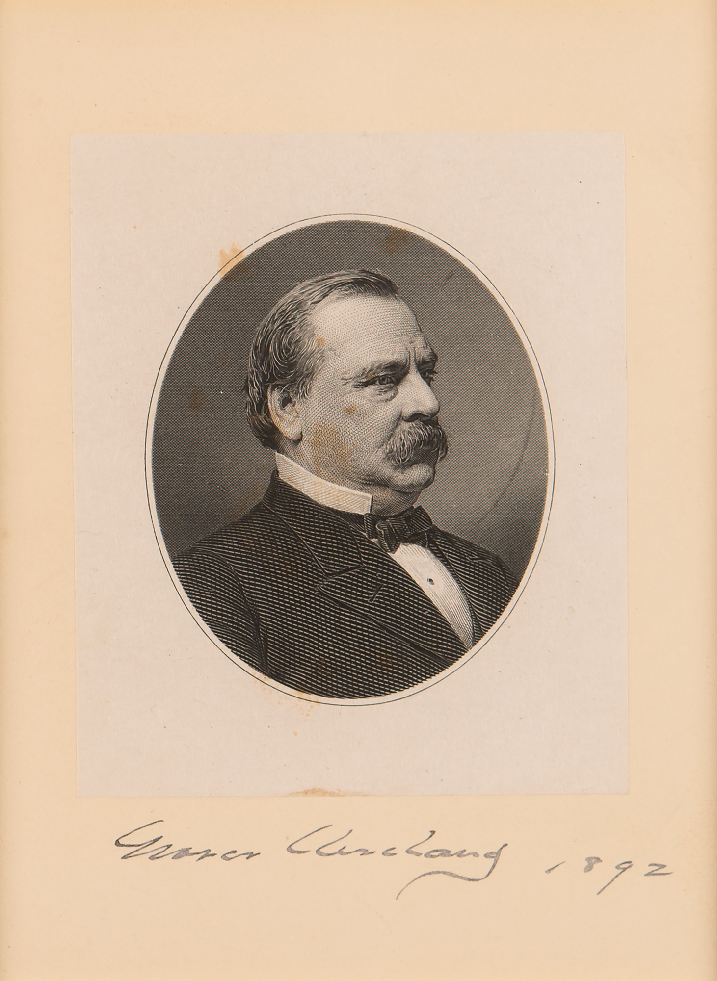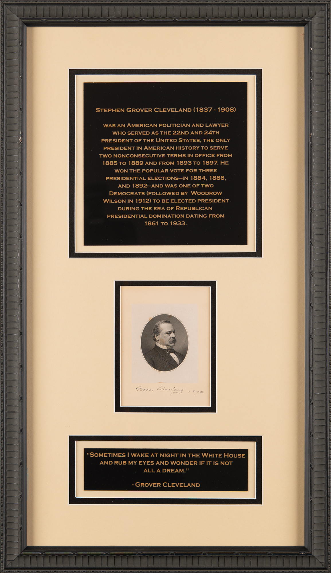 Ink signature, "Grover Cleveland, 1892,” on an off-white 3.75 x 5 cardstock sheet bearing an affixed engraving of the two-time president. Archivally double-matted and framed with two plaques to an overall size of 13.5 x 23.75. In fine condition, with trivial stains to the engraving.