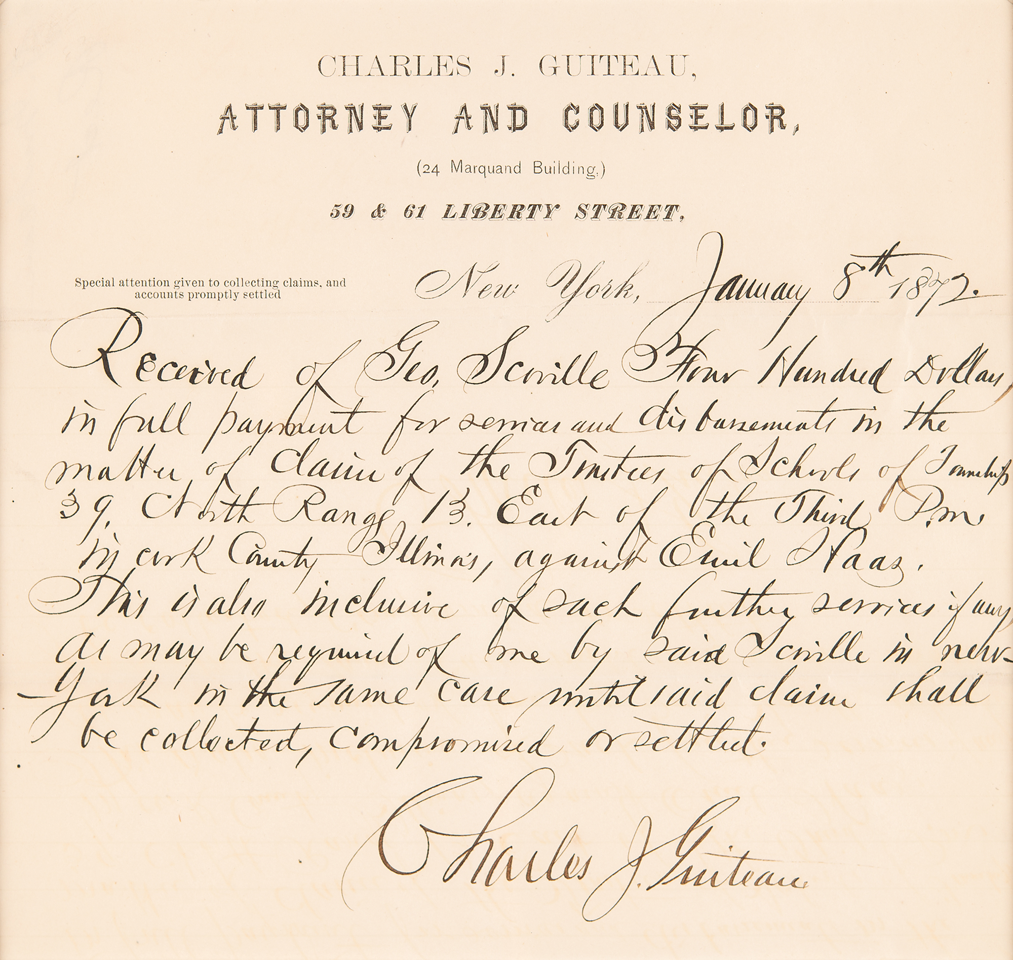 ADS, signed “Charles J. Guiteau,” one page, 7.75 x 6.75, January 8, 1872. Handwritten document penned on his personal ‘Charles J. Guiteau, Attorney and Counselor’ law practice stationery, in part: “Received of Geo. Scoville Four Hundred Dollars, in full payment for service and disbursements in the matter of claim of Trustees of Schools of Township 39, North Range 13…Illinois, against Emil Haas. This is also inclusive of such further services if any as may be required of me by said Scoville in New York in the same case until said claim shall be collected, compromised or settled.” Signed prominently at the conclusion by Guitea. Archivally double-matted and framed with two plaques and a portrait to an overall size of 22.5 x 18.75. In fine condition.