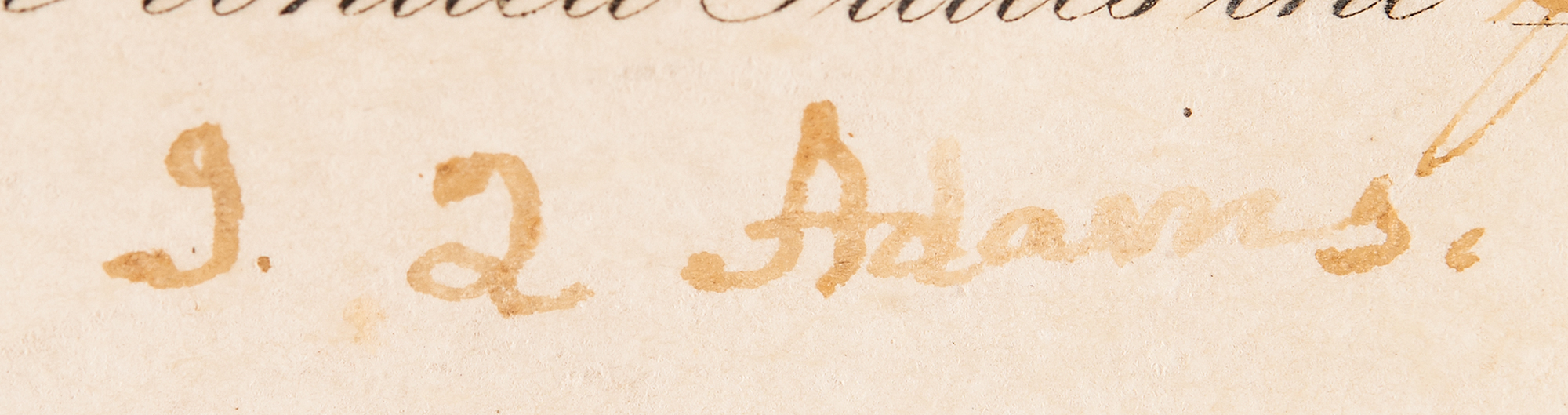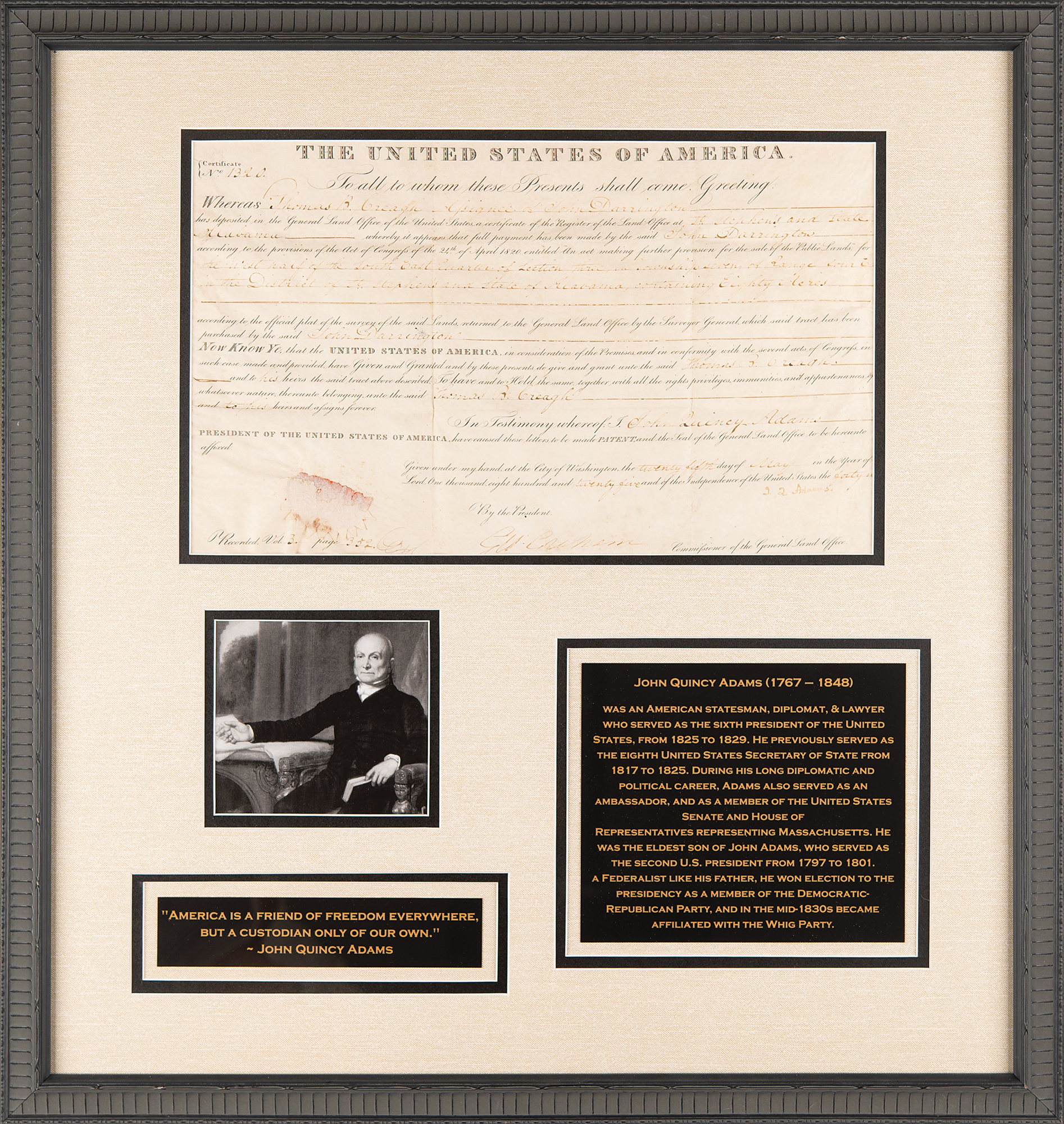 Partly-printed vellum DS as president, signed “J. Q. Adams,” one page, 14.5 x 8.75, May 25, 1825. President Adams grants Thomas B. Creagh, assignee of John Darrington, a tract "containing Eighty Acres…in the District of St. Stephens and State of Alabama.” Signed at the conclusion by John Quincy Adams and countersigned by Commissioner of the General Land Office George Graham. Archivally double-matted and framed with two plaques and a portrait to an overall size of 23 x 24. In fine condition, with most of the seal missing.