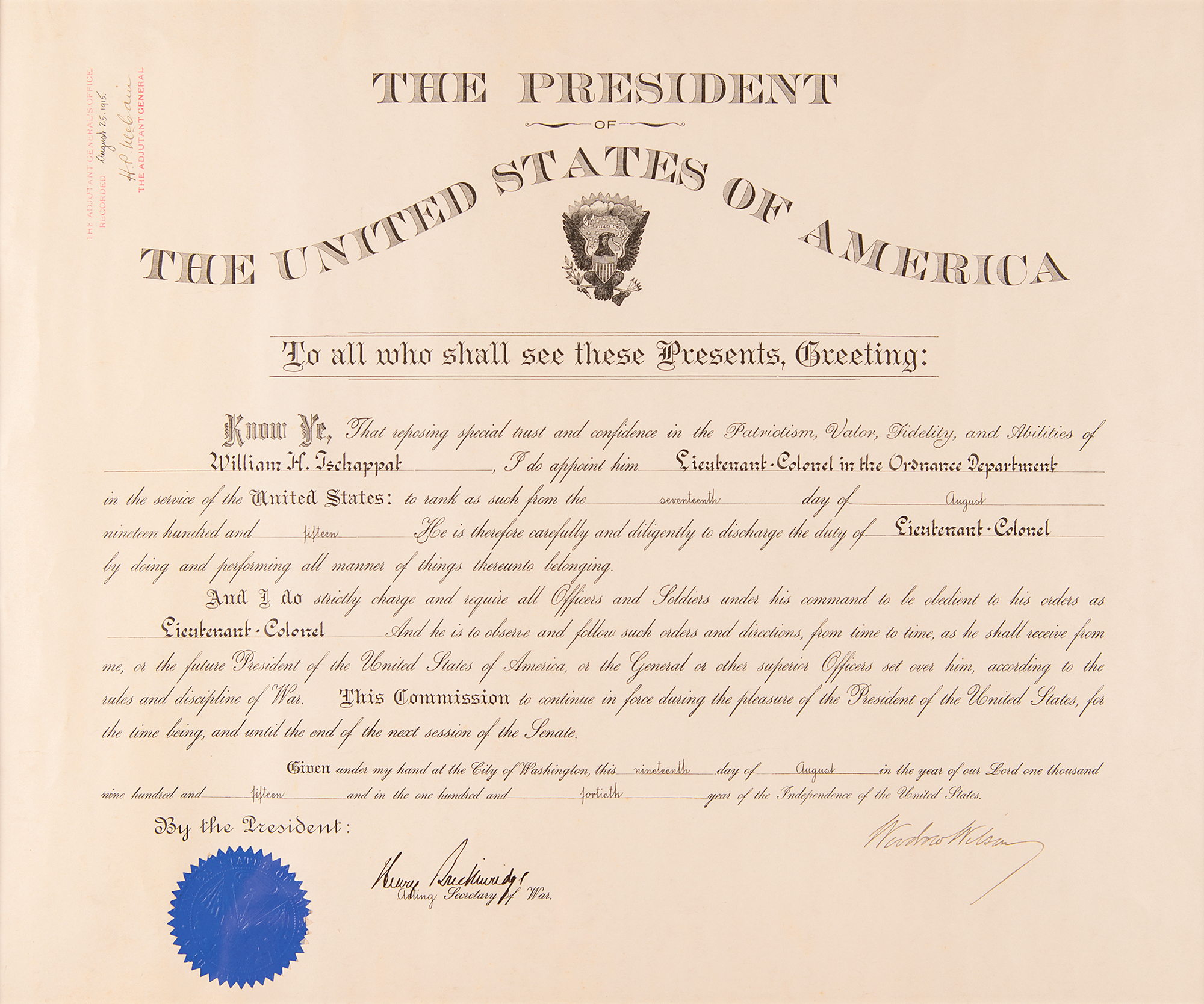 World War I-dated partly-printed DS as president, one page, 18 x 15, August 19, 1915. President Wilson appoints William H. Tschappat as a "Lieutenant-Colonel in the Ordnance Department in the service of the United States." Signed at the conclusion by Woodrow Wilson, and countersigned by Acting Secretary of War Henry Breckinridge. The blue War Office seal remains affixed to the lower left. Archivally double-matted and framed with two plaques and a portrait to an overall size of 33.5 x 21.5. In fine condition, with light creasing to the side edges. Major General William H. Tschappat (1874–1955) was a career officer in the United States Army and served as the 14th Chief of Ordnance for the U.S. Army Ordnance Corps.