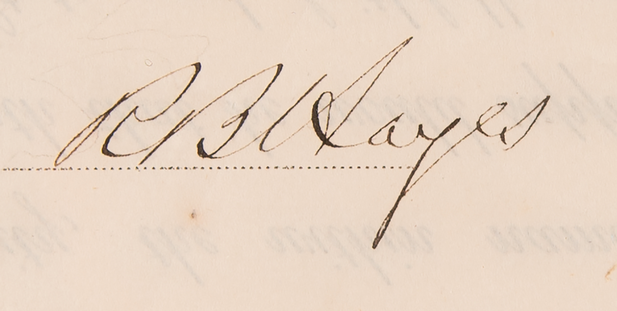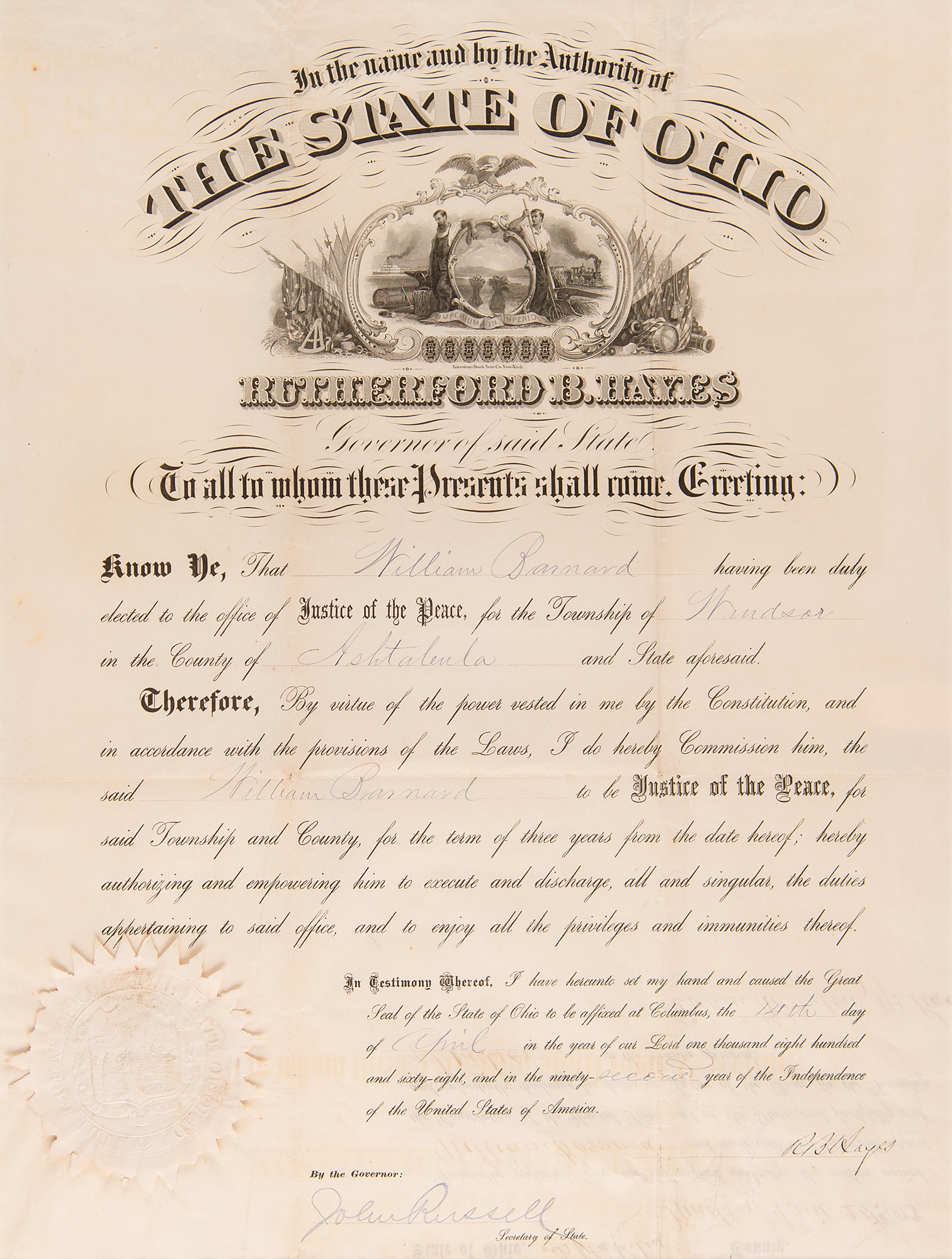 Partly-printed DS as governor, signed “R. B. Hayes,” one page, 12 x 16.25, April 14, 1868. As Governor of Ohio, Hayes appoints William Barnard as a "Justice of the Peace, for the Township of Windsor in the County of Ashtabula." Signed neatly at the conclusion by Rutherford B. Hayes. Lower left bears the original off-white seal. Archivally double-matted and framed with two plaques and a portrait to an overall size of 27.5 x 22.5. In very good to fine condition, with intersecting folds, and light wrinkling and creasing. A decidedly early document from Hayes's second month as the Governor of Ohio; he'd serve a second, much shorter term as governor from January 10, 1876 until March 2, 1877, before heading to the White House as the nation's 19th president. Hayes is one of seven presidents to call the state of Ohio home.