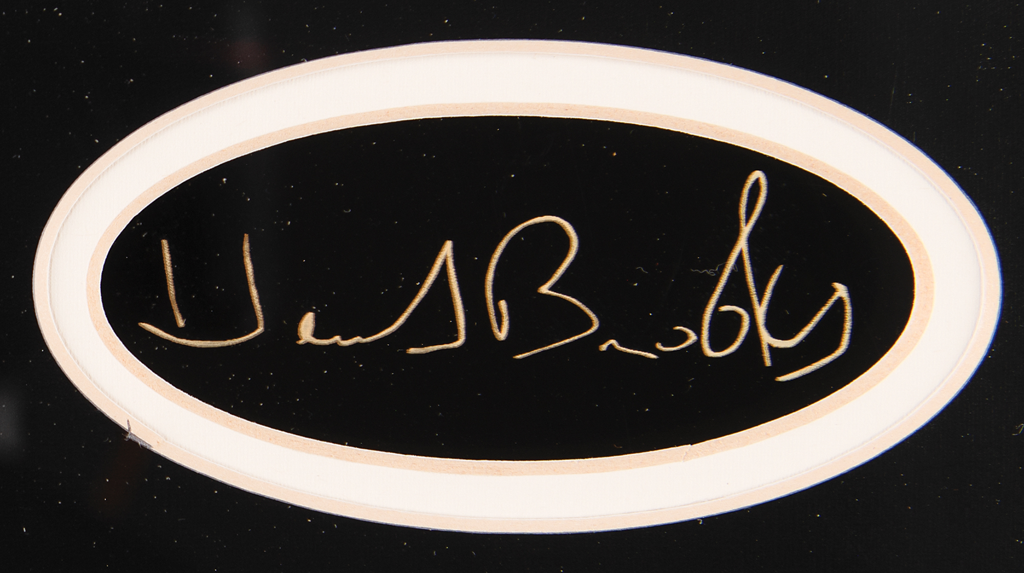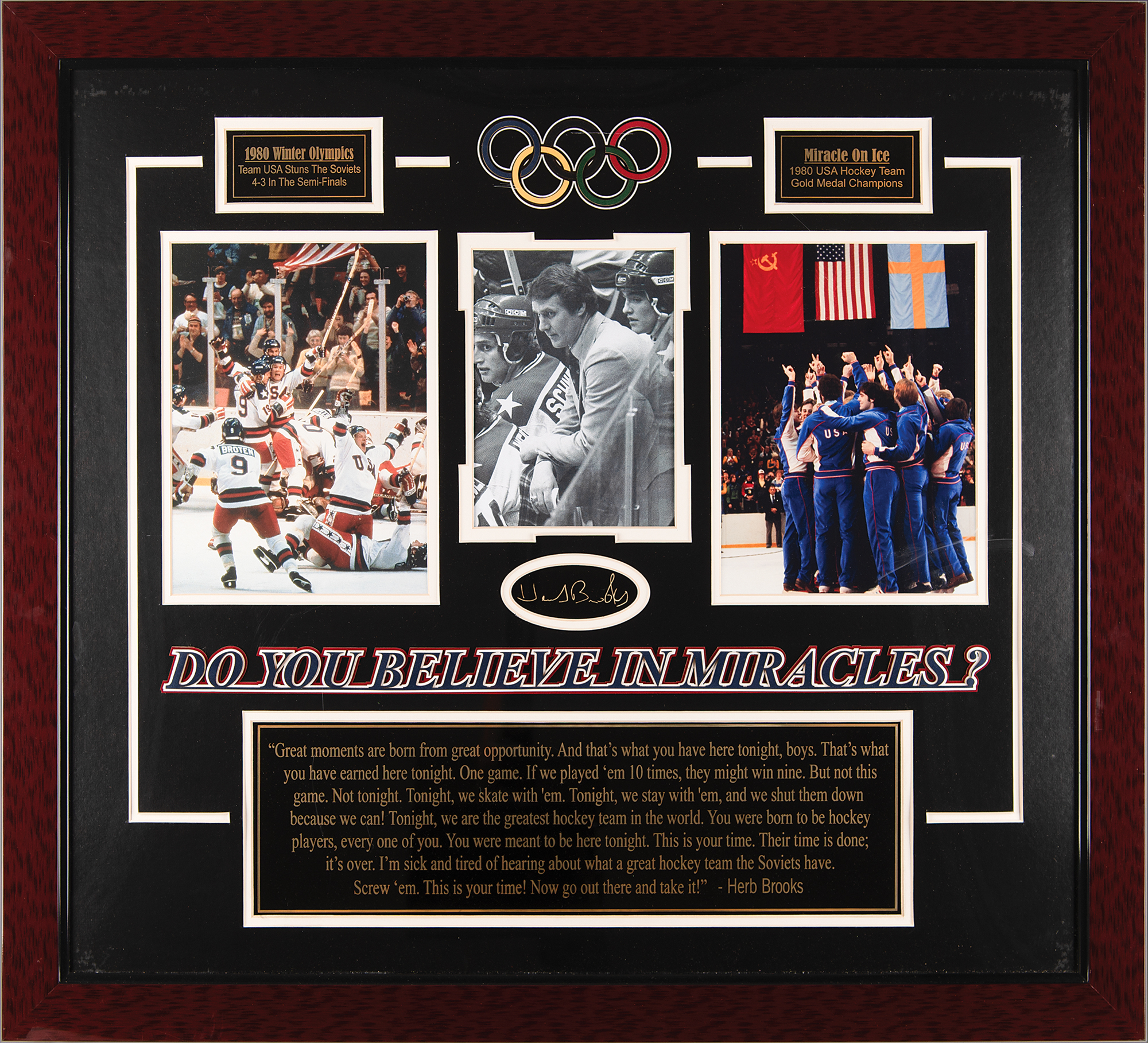Gold ink signature, "Herb Brooks,” on a black 3.5 x 1.5 sheet, which has been centrally matted within a wonderful plaque-and-photo display honoring the American national hockey team that won the gold medal at the Lake Placid 1980 Winter Olympics. Framed to an overall size of 31.5 x 28. In very fine condition.