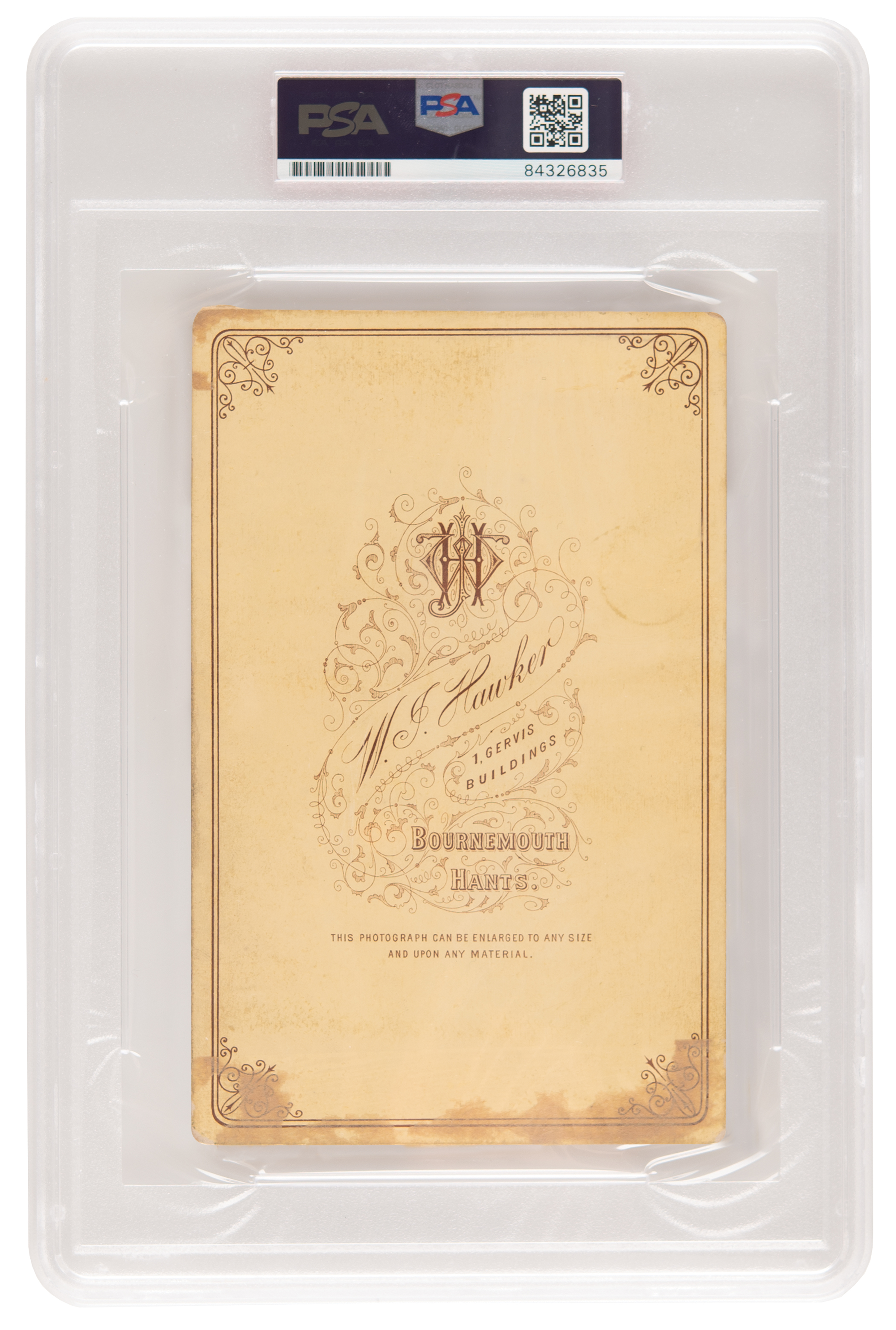 Exemplary 4.25 x 6.5 cabinet photo of Robert Louis Stevenson in a three-quarter-length pose by W. J. Hawker of Bournemouth, neatly signed on the mount in ink, "Robert Louis Stevenson." In fine condition. Encapsulated in a PSA/DNA authentication holder. Just the fourth signed photograph of Stevenson that we have offered, this marvelous portrait dates to circa 1886, when Stevenson was living in coastal Bournemouth, England, and writing the tale of Jekyll and Hyde. A superlative literary piece.